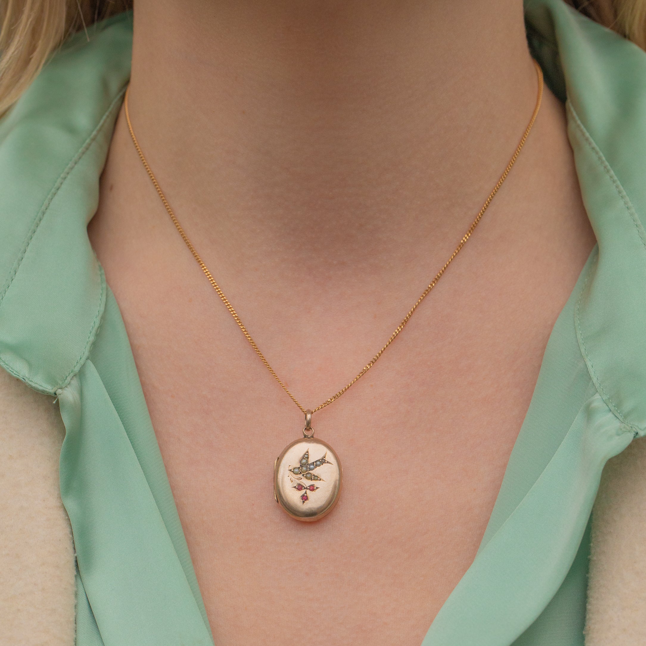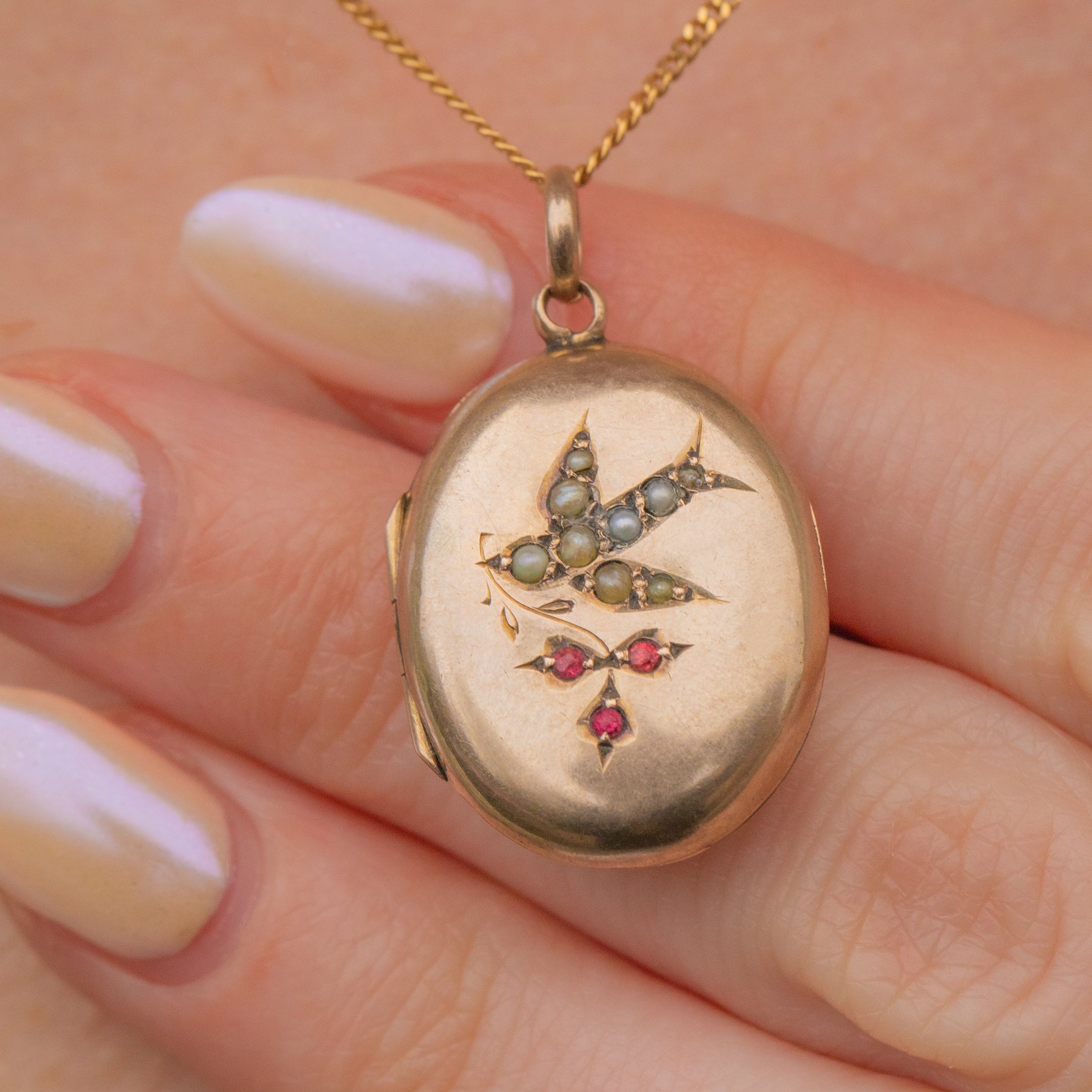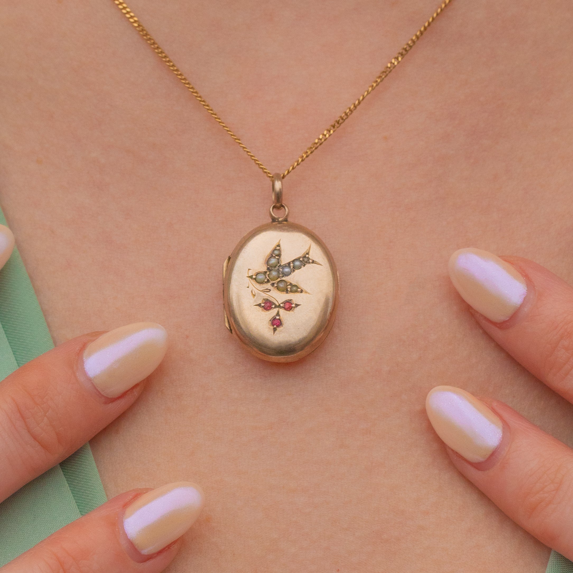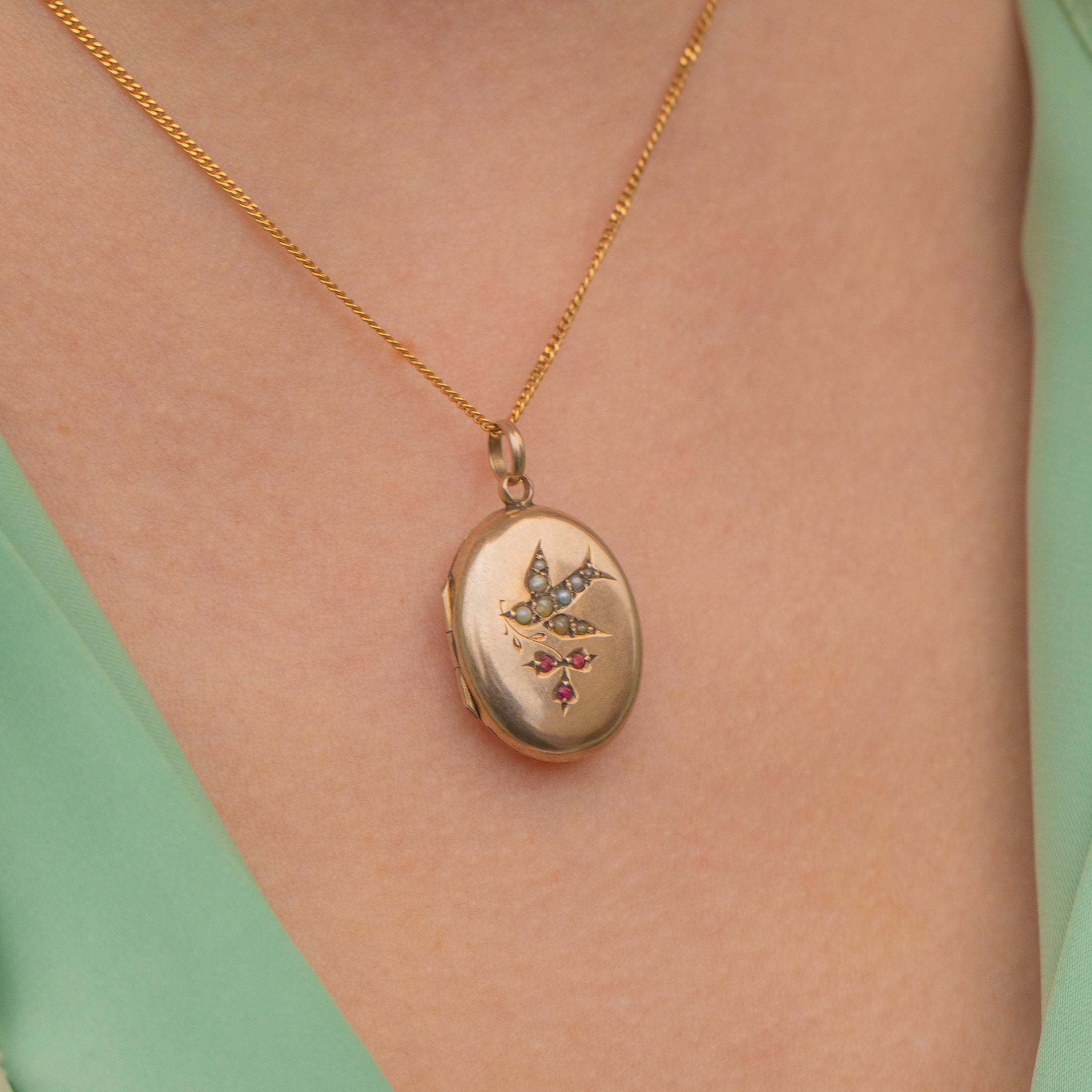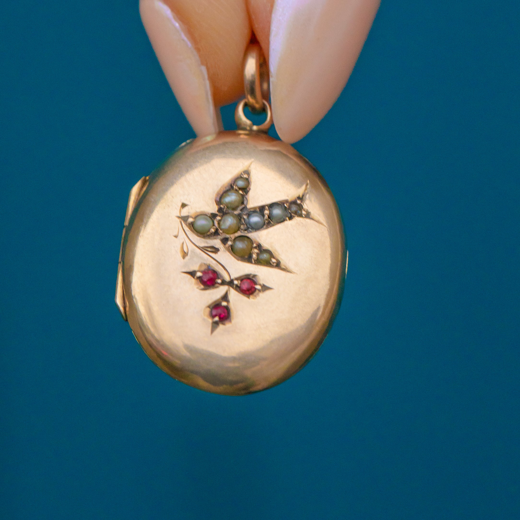 This Edwardian 9ct Gold Pearl and Ruby swallow locket is just adorable!