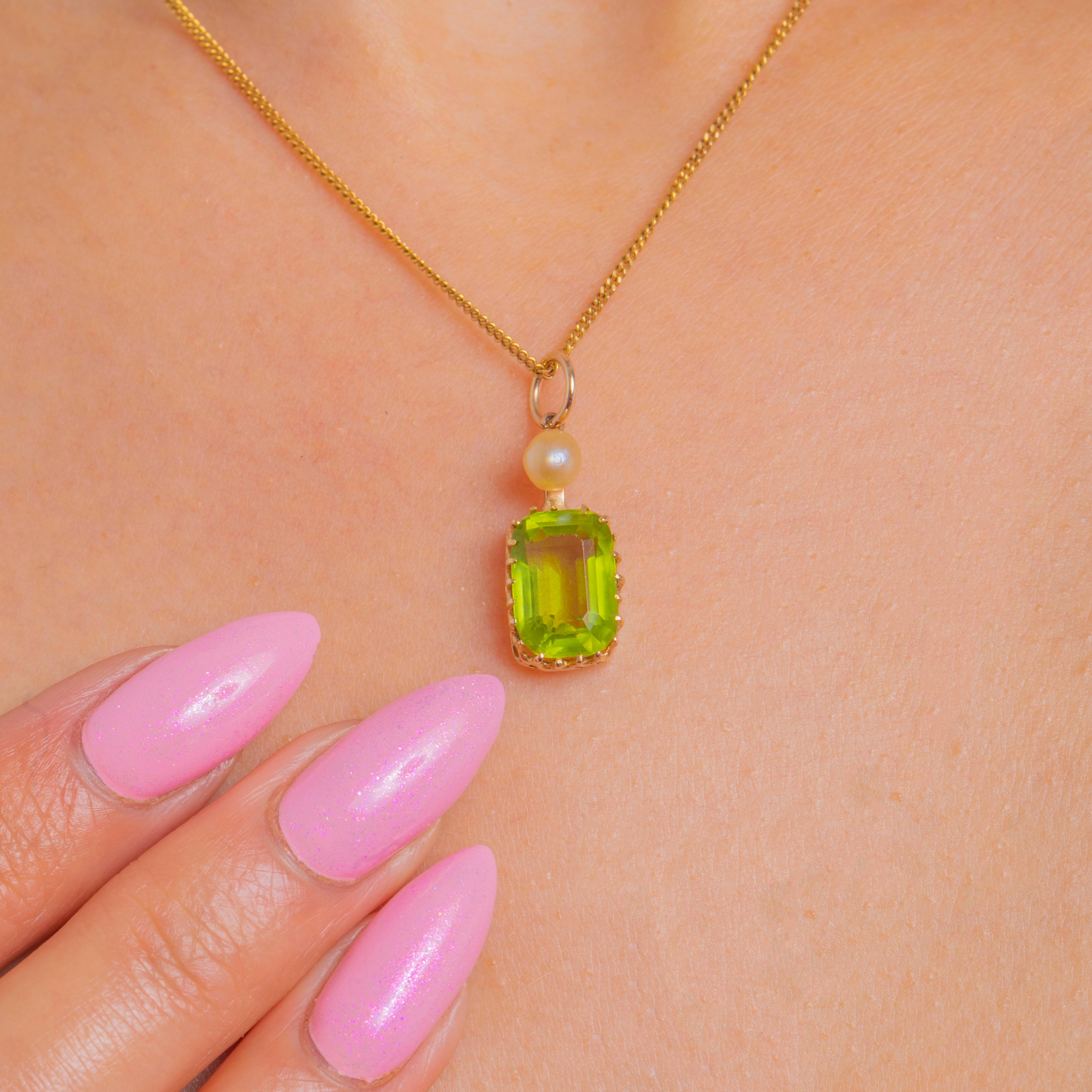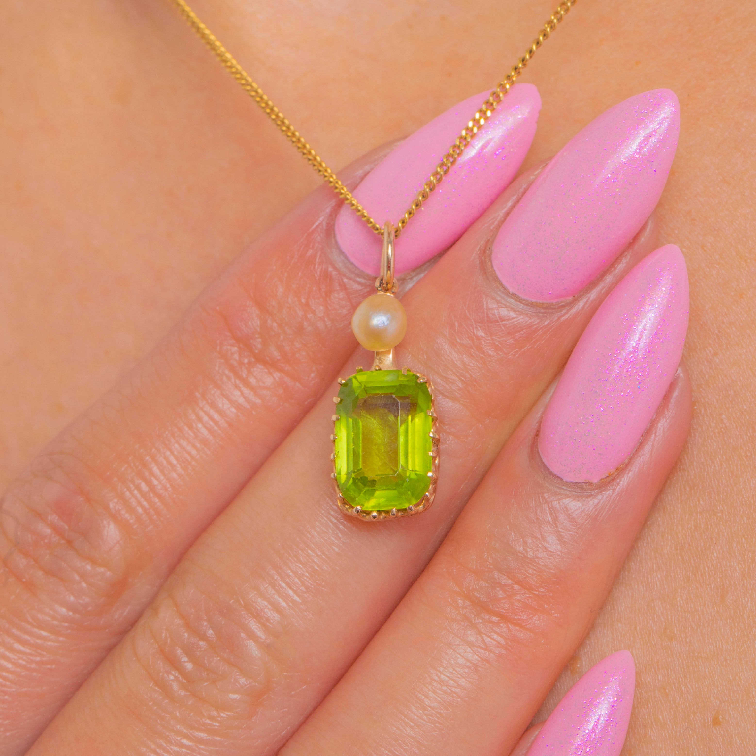 A delicate Edwardian treasure, this 9ct Gold charm pairs a creamy Pearl with a vibrant emerald-cut Peridot in a graceful articulated drop. The Peridot’s lively chartreuse hue and crisp step facets catch the light beautifully, weighing approximately 3.00cts for a glorious splash of colour.