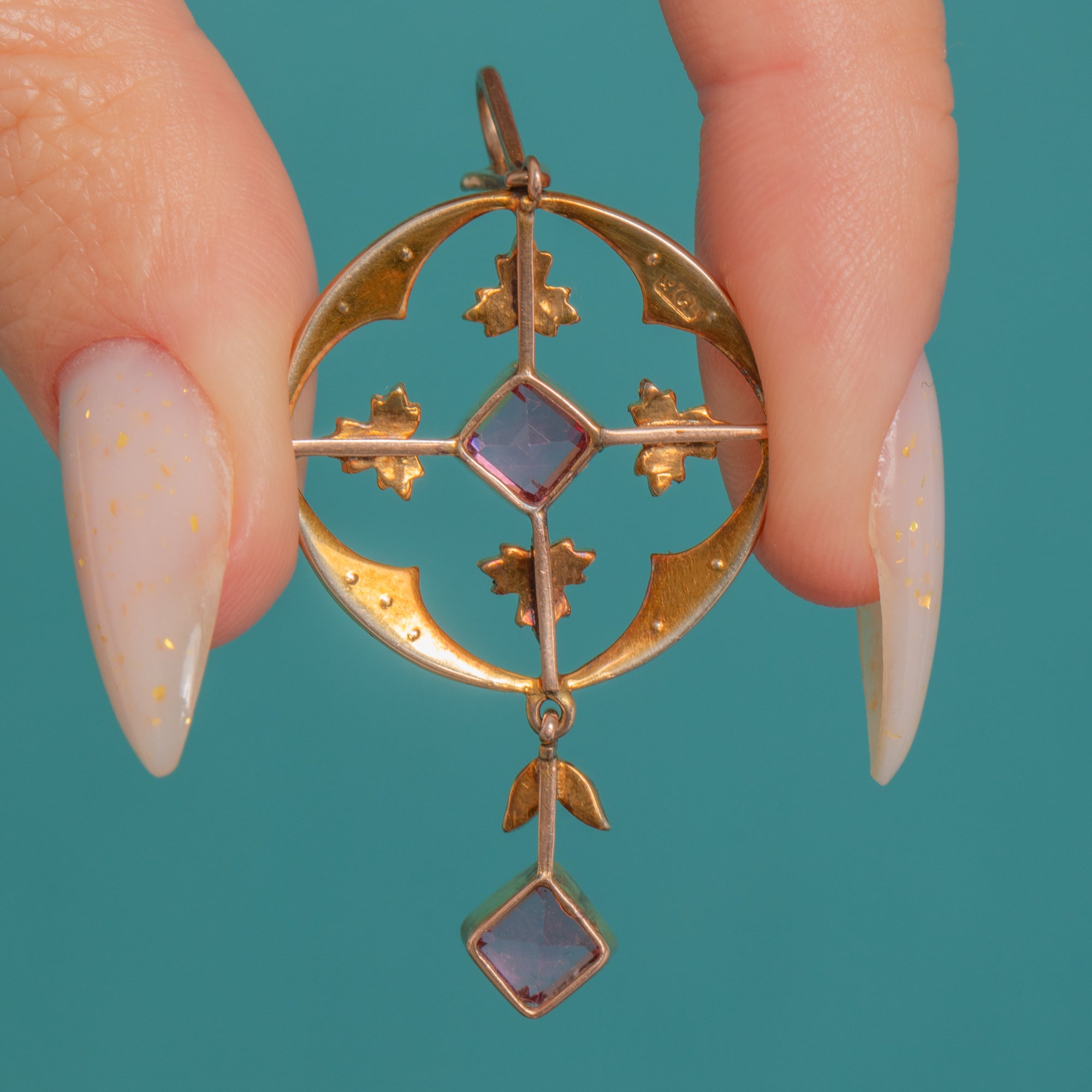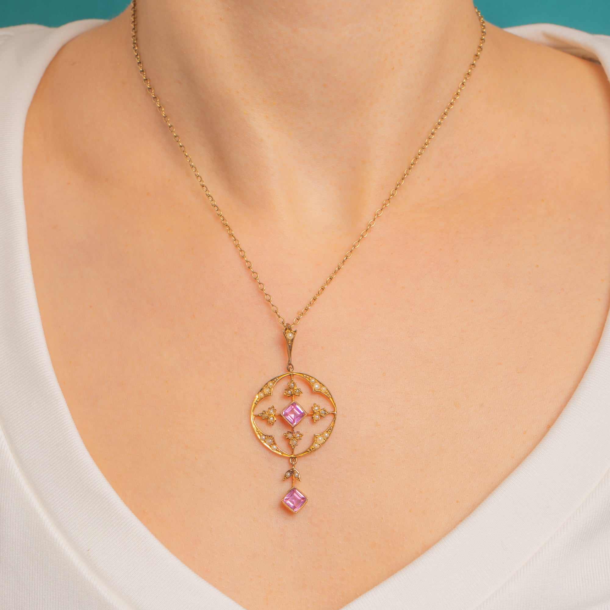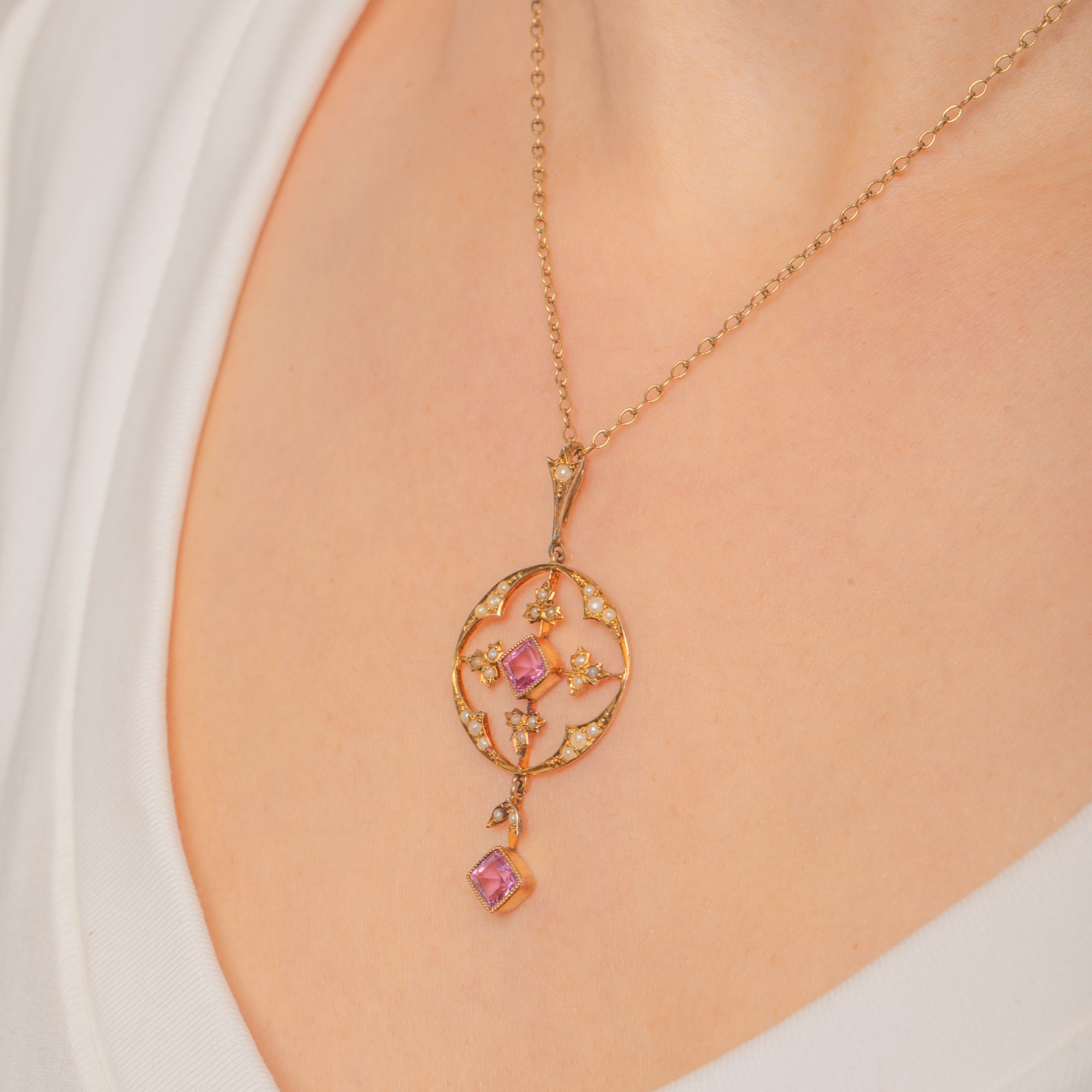 Hand-fabricated with open backs to the settings, the pendant captures the romantic elegance of the period. The two Pink Tourmalines total approximately 0.86ct combined, bringing a refined pop of rosy colour against the warm glow of 9ct Gold.