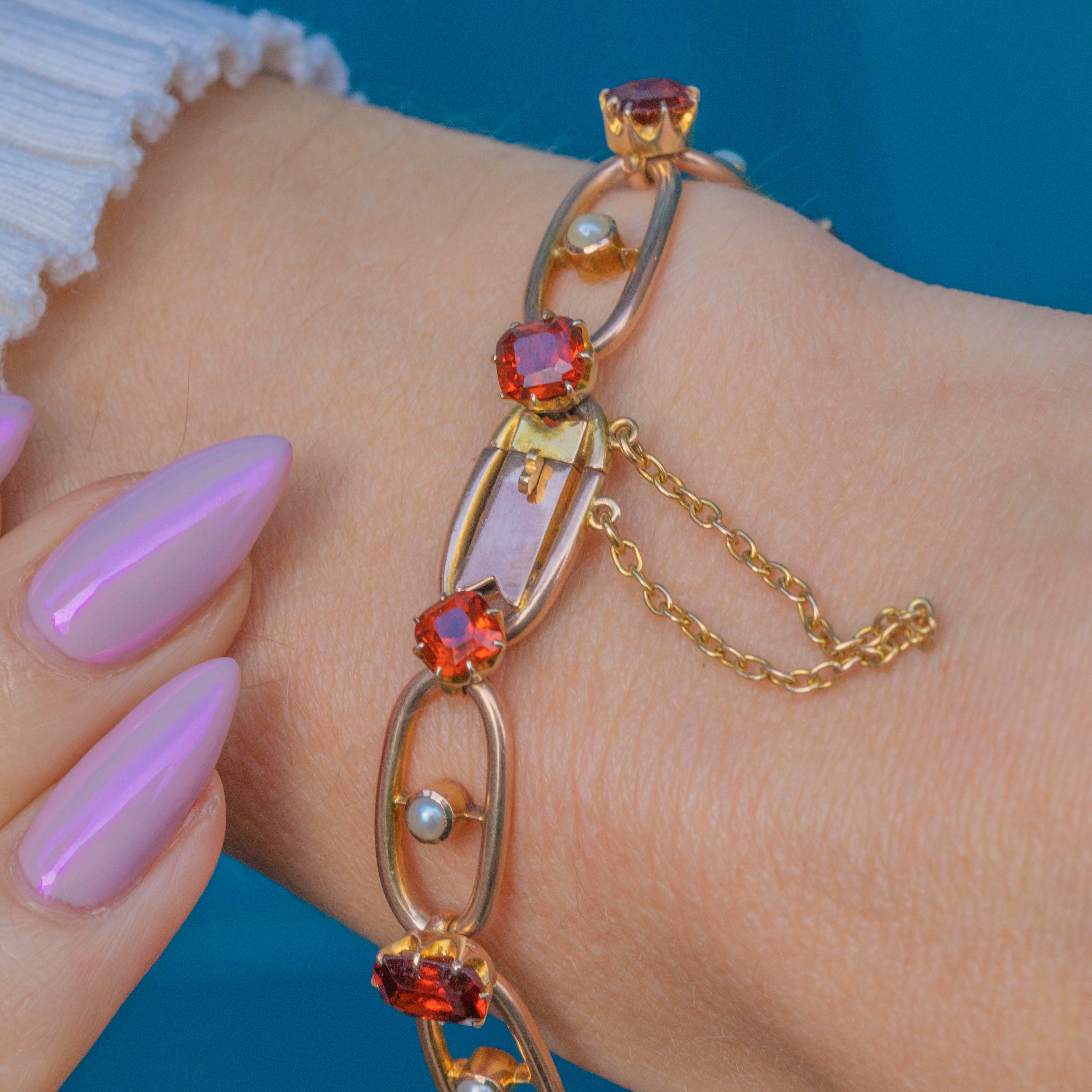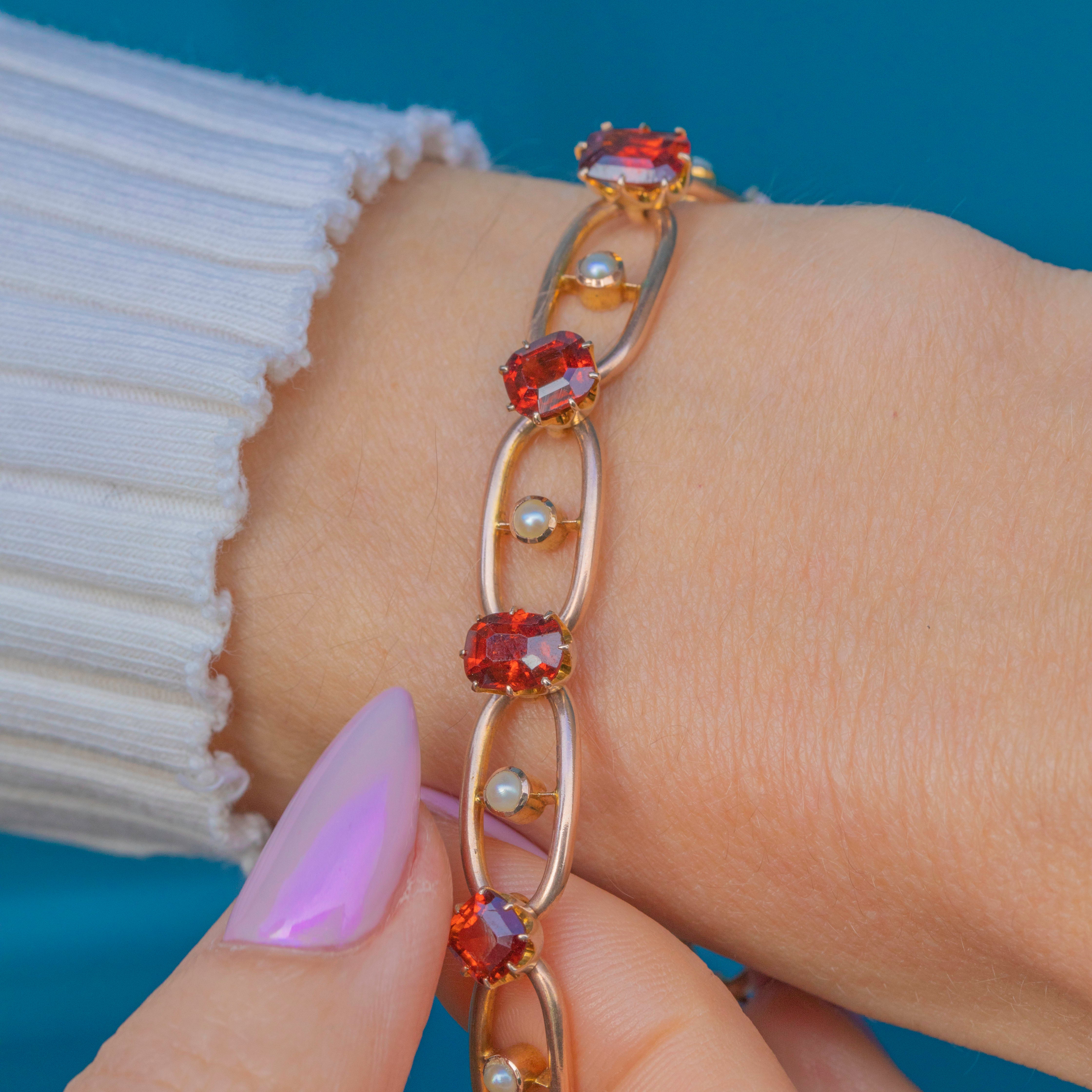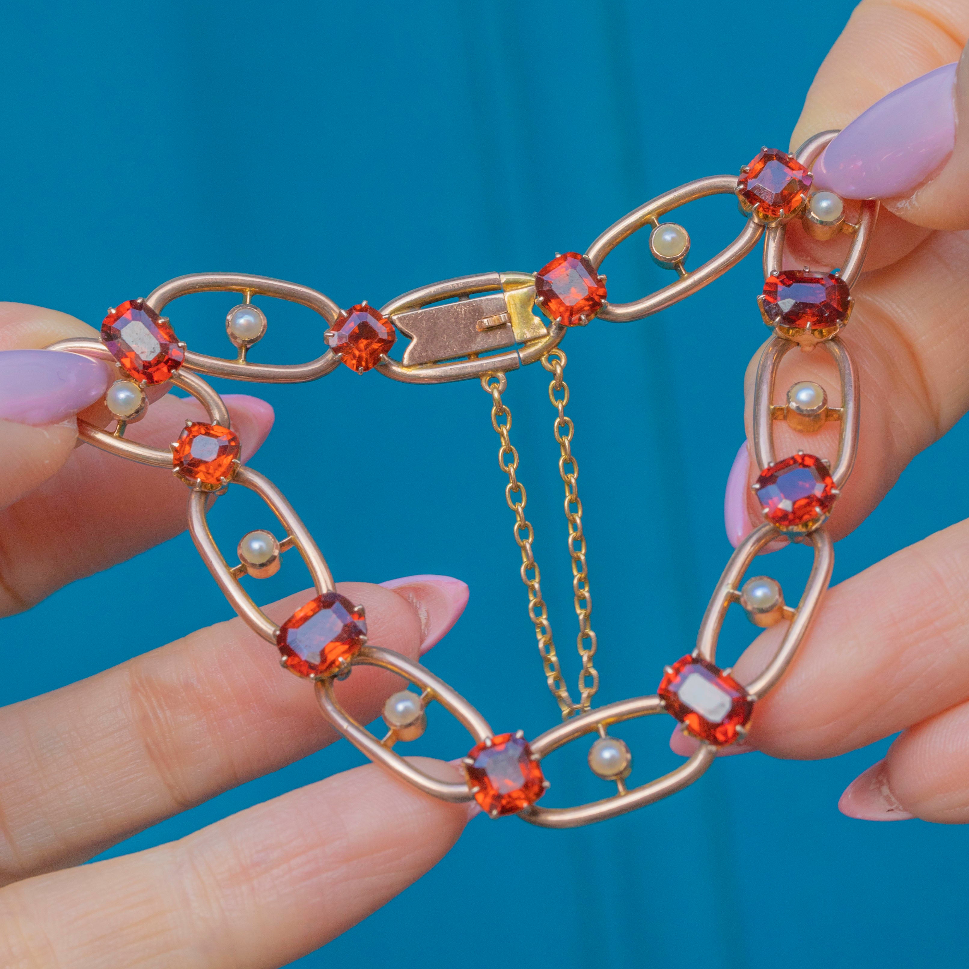 Edwardian 9ct Gold Spessartine Garnet Pearl Bracelet