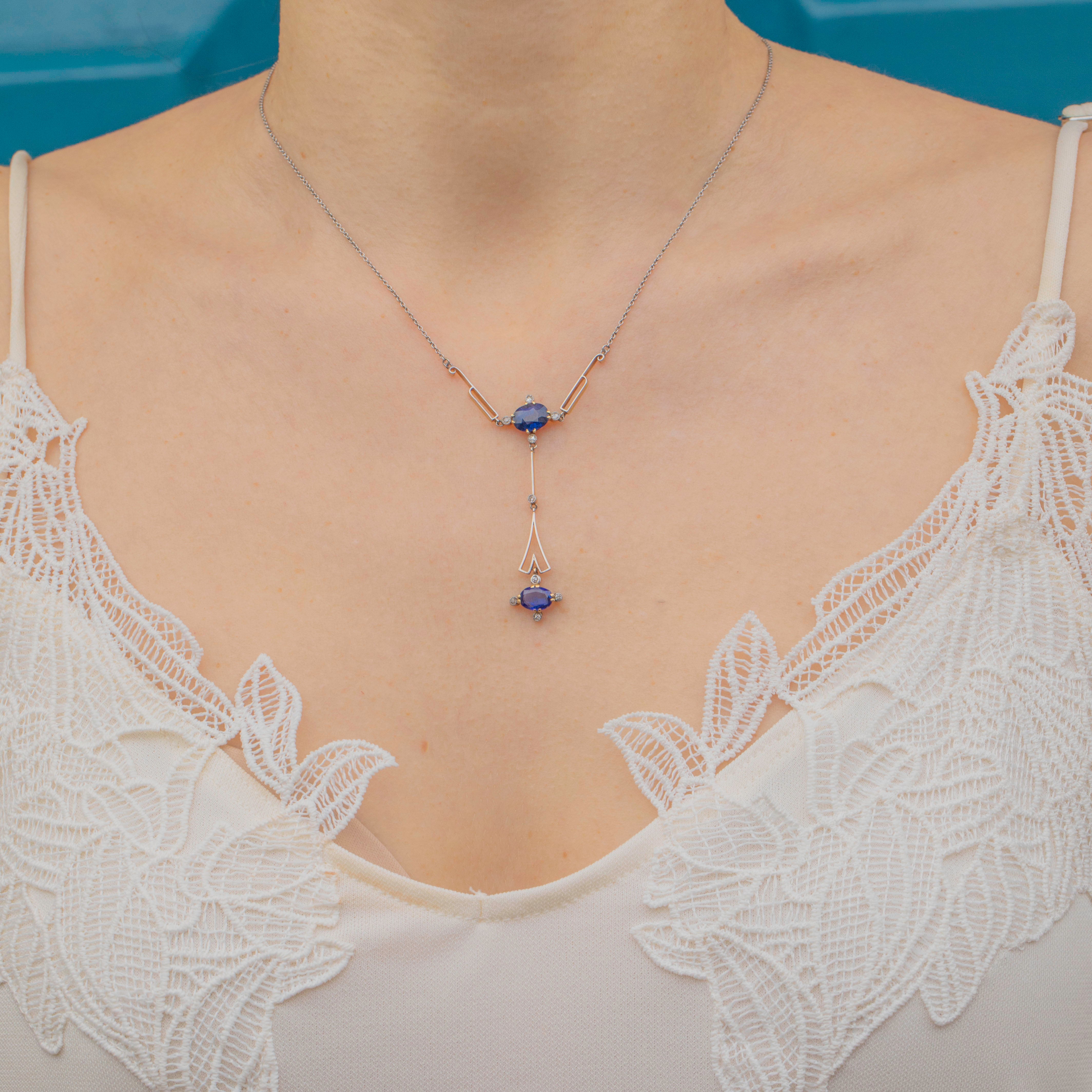 Edwardian Platinum Natural Sapphire Diamond Drop Necklace, 2.30ct Natural Sapphires