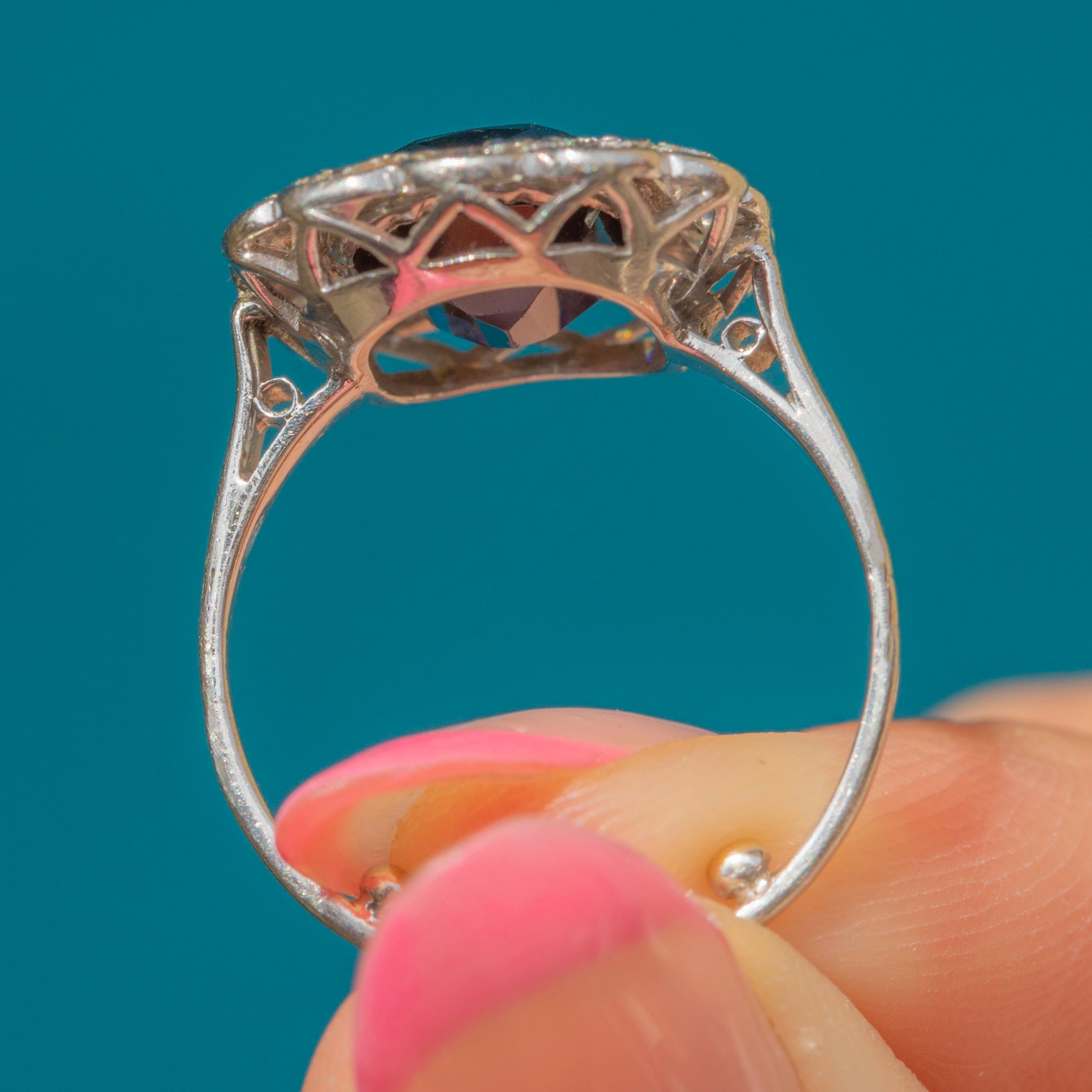 The sizable 2.70ct Sapphire is one of the early synthetic Sapphires created during the turn of the century, a technique called flame fusion created by Auguste Verneuil in 1902. The Sapphire will instantly enchant you with its mesmerising deep Royal blue hue, haloed by twelve scintillating old-cut Diamonds, creating a spectacular display of sparkles under the light. This timeless Edwardian cluster ring is a fine investment piece, guaranteed to be treasured for generations to come!