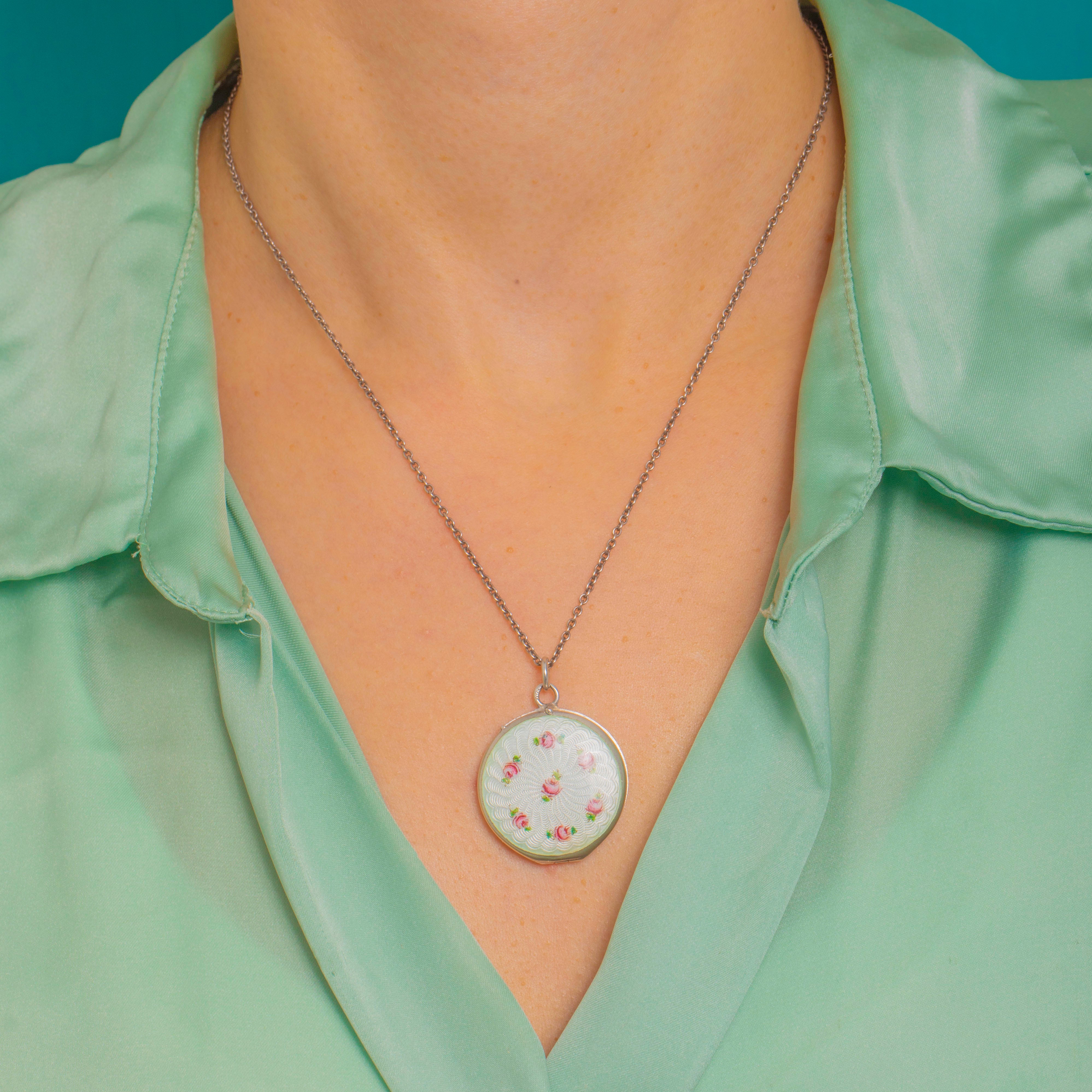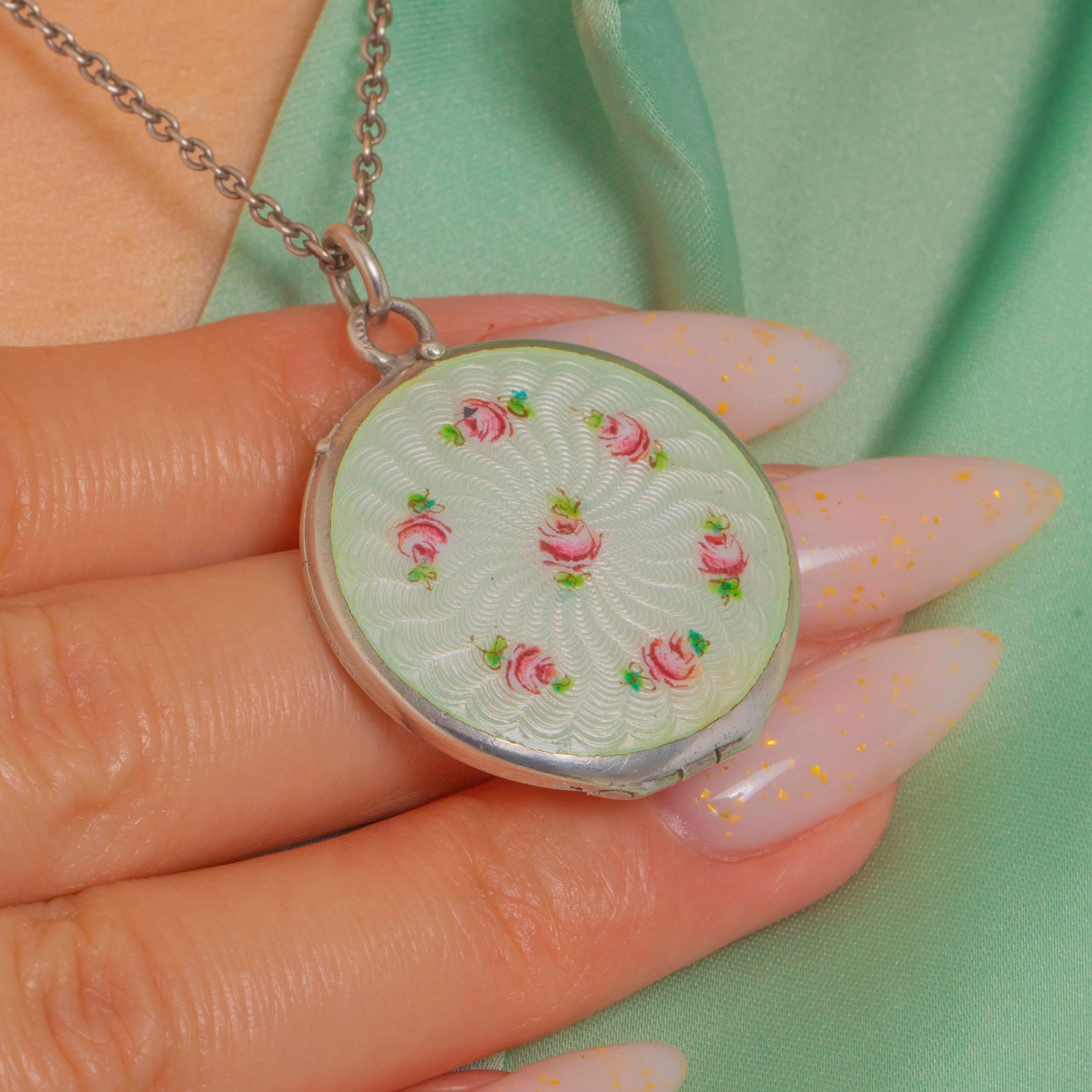 Edwardian Silver White Guilloche Enamel & Roses Locket
