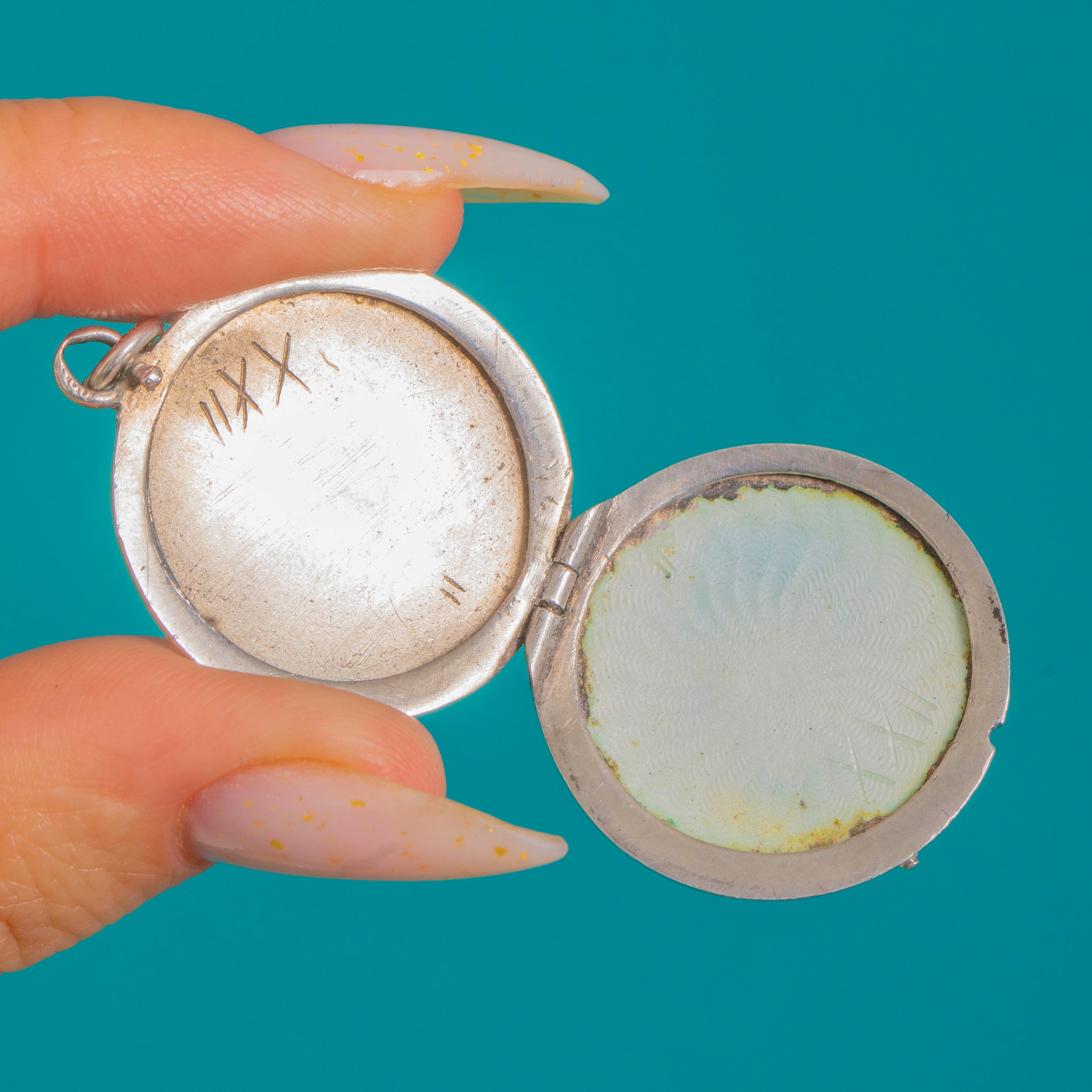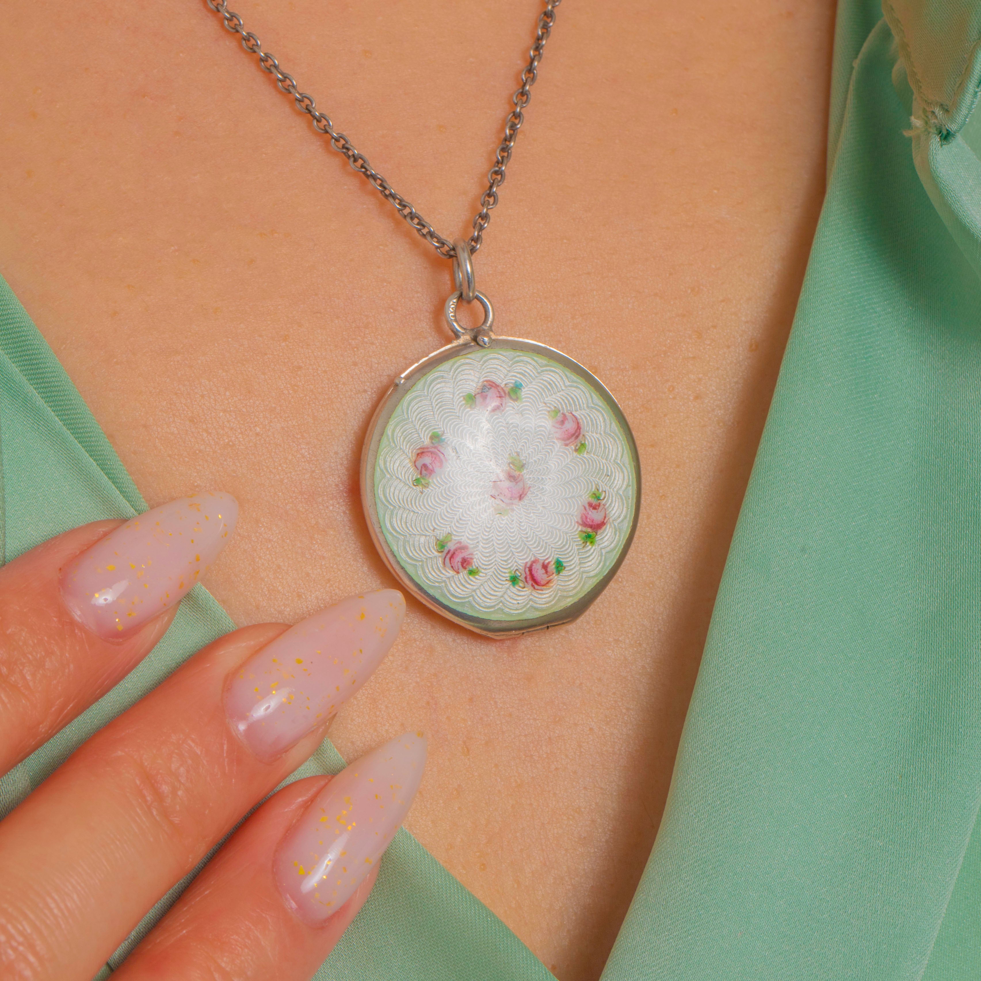 There’s something utterly irresistible about Edwardian Guilloché Enamel—those shimmering, engine-turned waves that catch the light like silk. This classic Silver locket is finished with soft, hand-painted blooming roses, creating a piece that feels equal parts romantic and impeccably tailored.