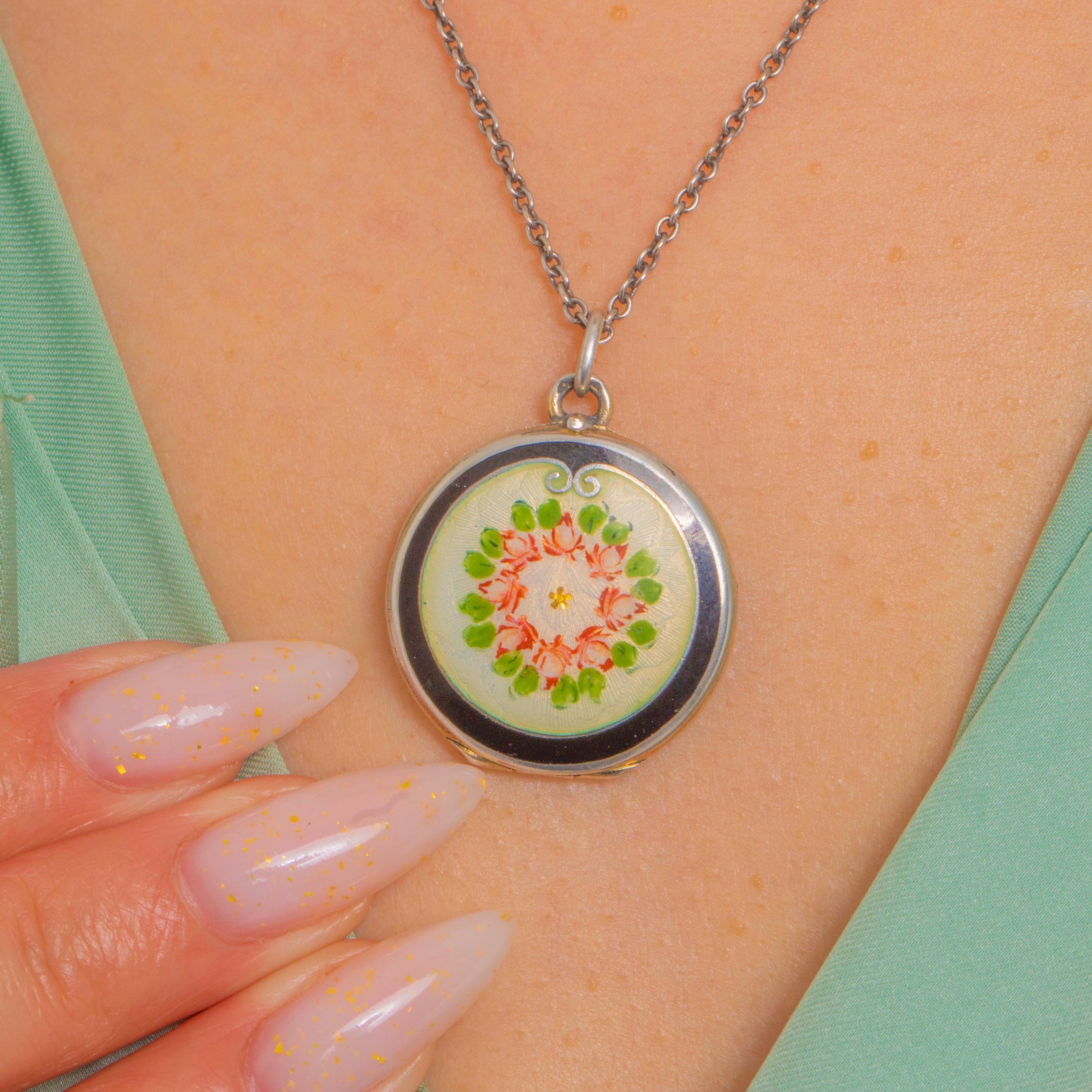 A delicate Edwardian Guilloché Enamel locket, its round face adorned with a hand-painted floral wreath of soft pink blossoms and fresh green leaves on a pale cream-mint, engine-turned ground. A glossy black Enamel ring frames the scene with a tiny scroll flourish at 12 o’clock, all set within a smooth Silver bezel and finished with a fixed hasp and jump ring.