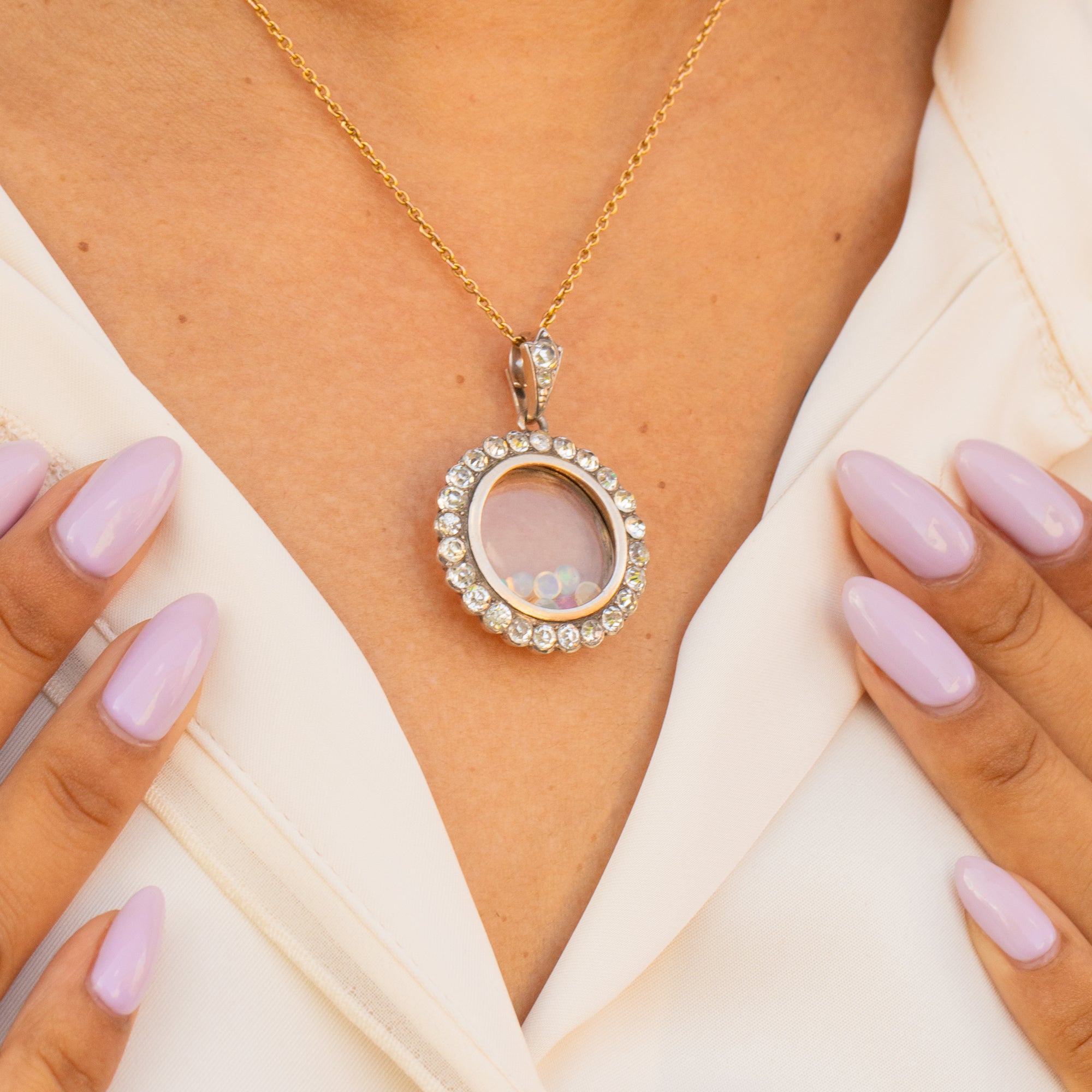 We adore this Edwardian Silver Paste round shaker locket! Home to colourful loose Opals, this shaker locket is the perfect base to build up your gem collection.