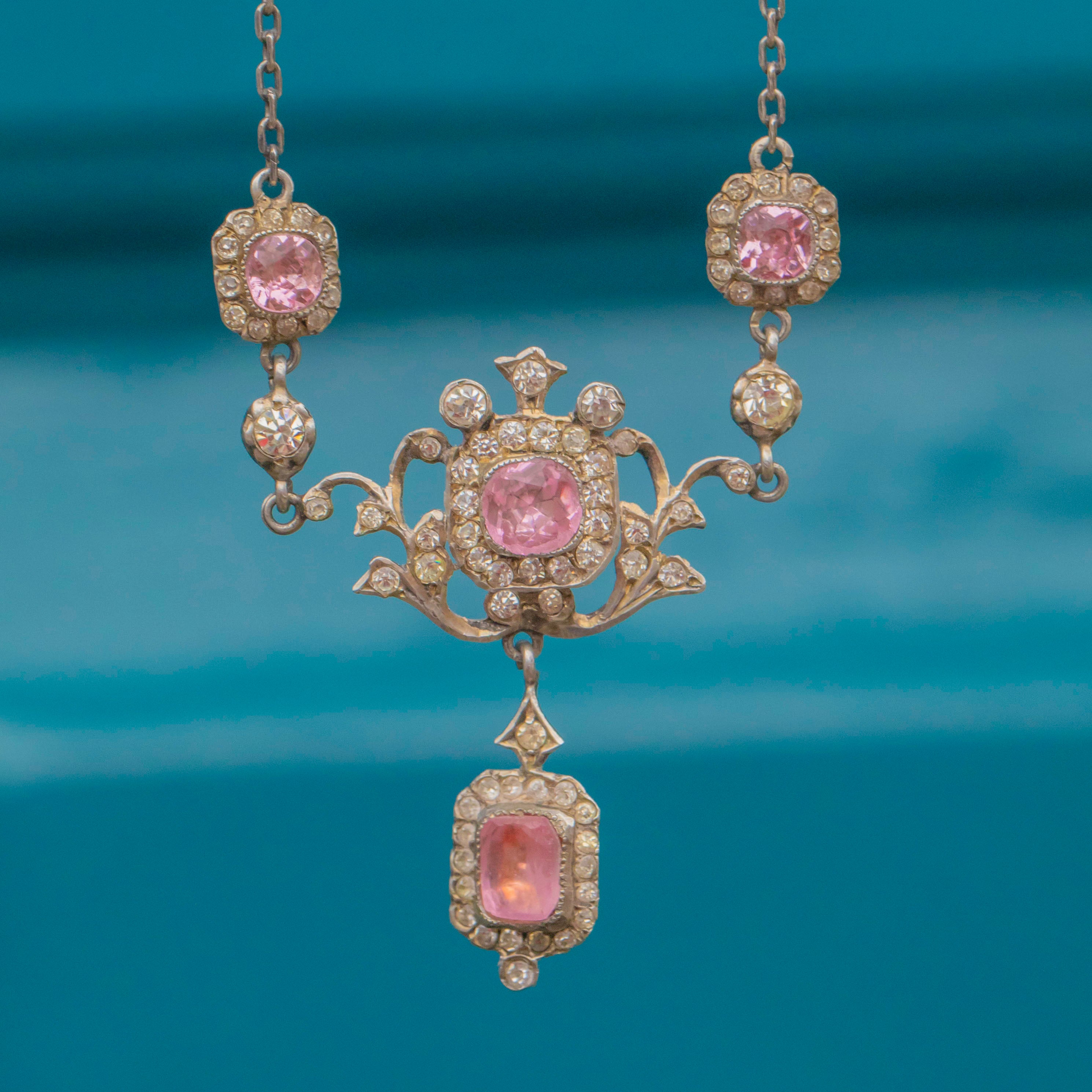 This exquisite Edwardian Silver pink Paste lavalier necklace features a captivating ornamental pendant, displaying vibrant pink Paste stones haloed by scintillating white Paste to create a radiant and timeless design.