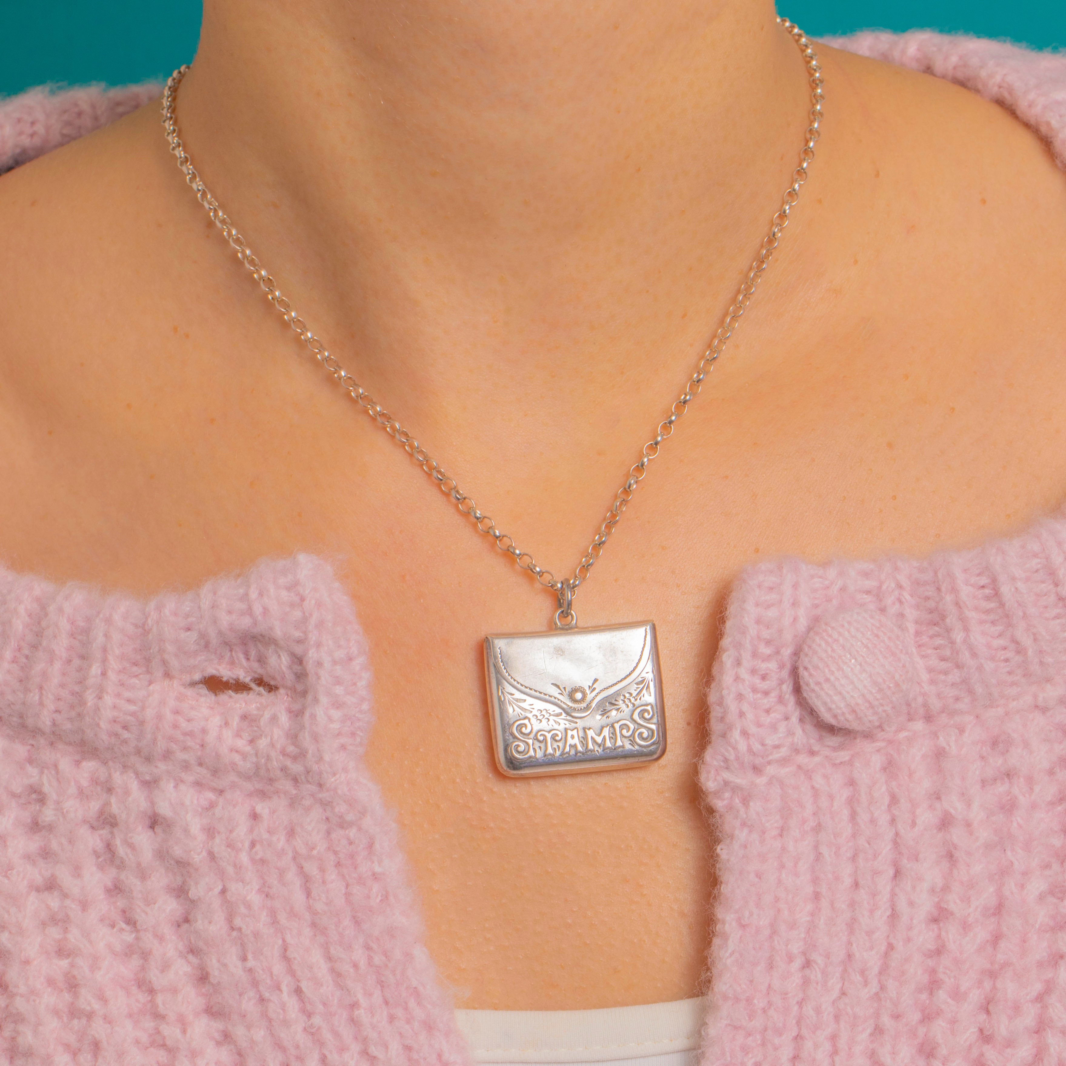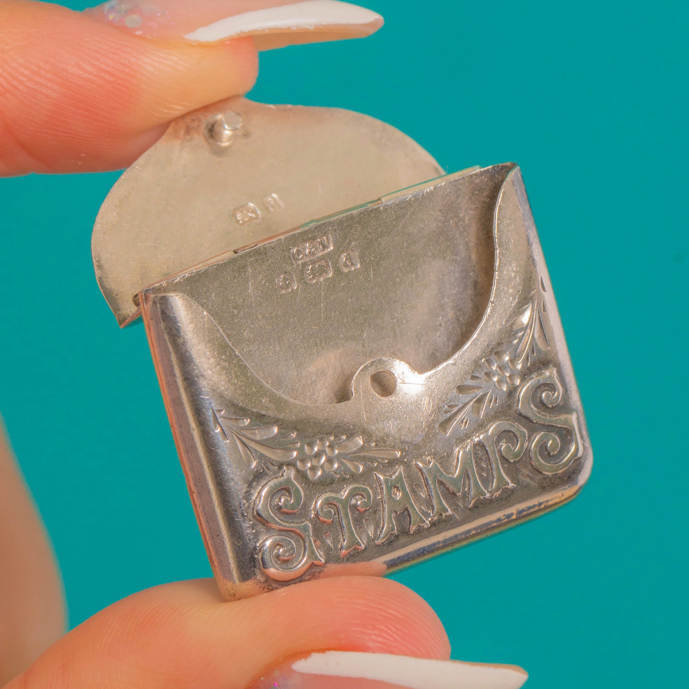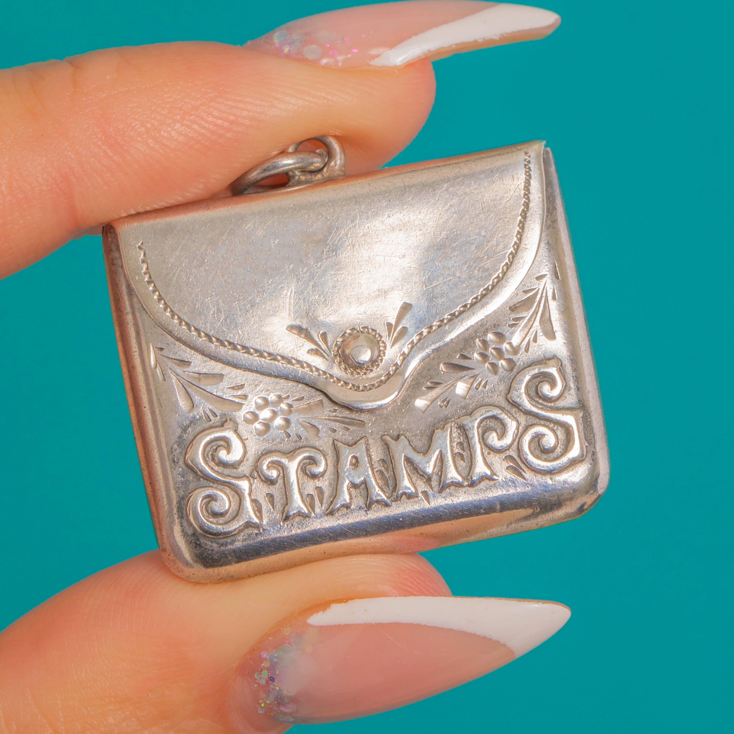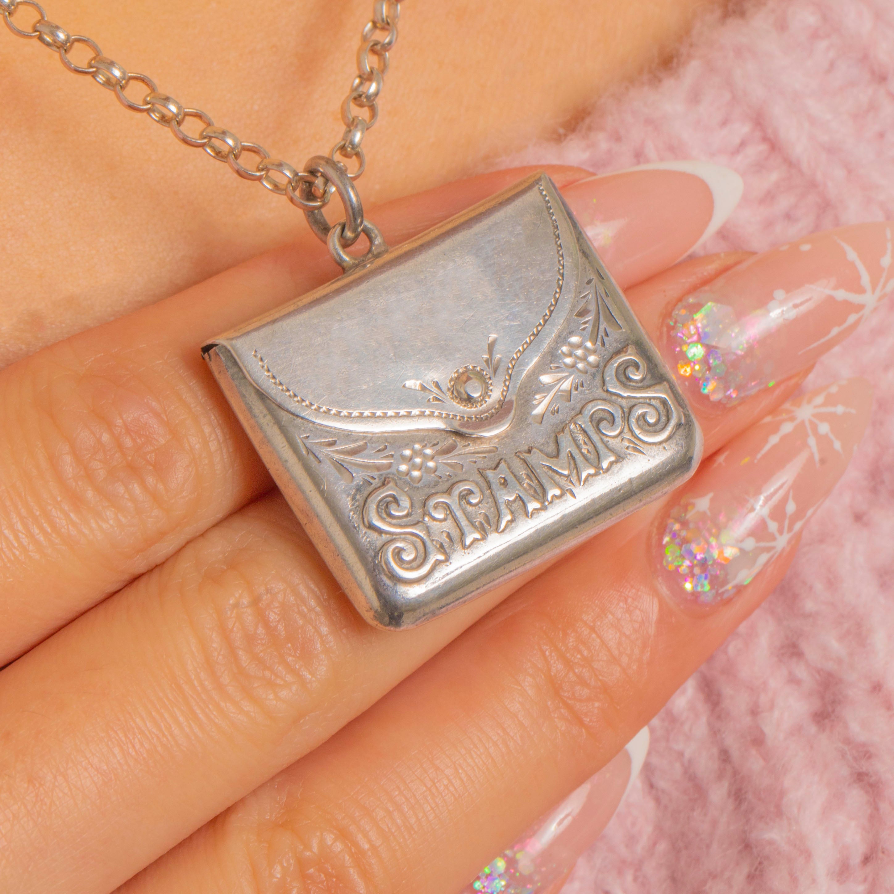 Charming and beautifully made, this Edwardian Sterling Silver stamp case pendant takes the form of a petite envelope with a hinged flap. The front is crisply engraved with scrolling foliate motifs and the word “STAMPS”, while the reverse is smooth and plain.