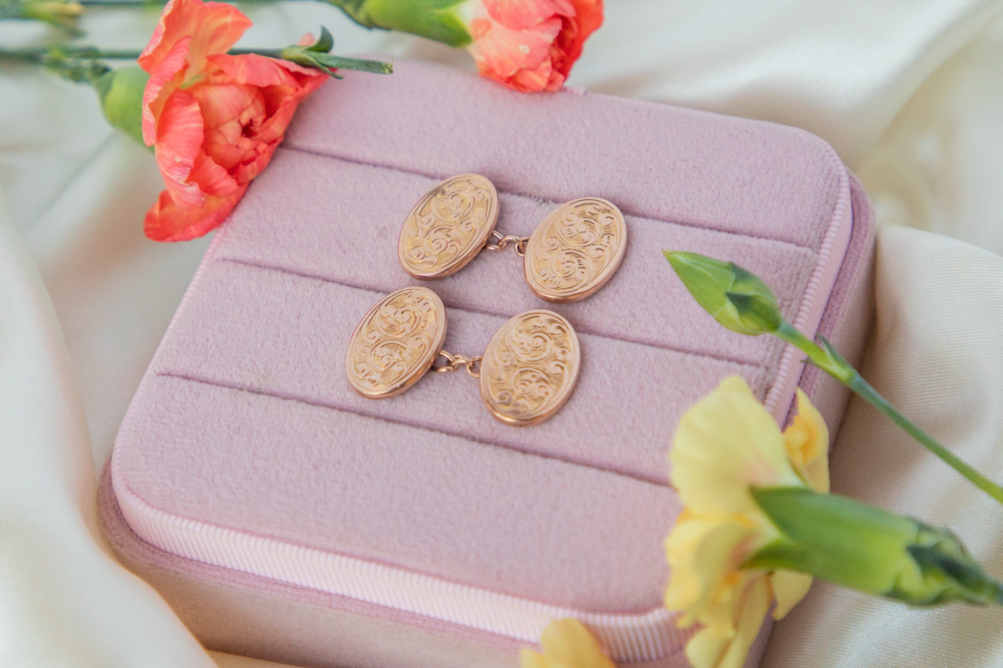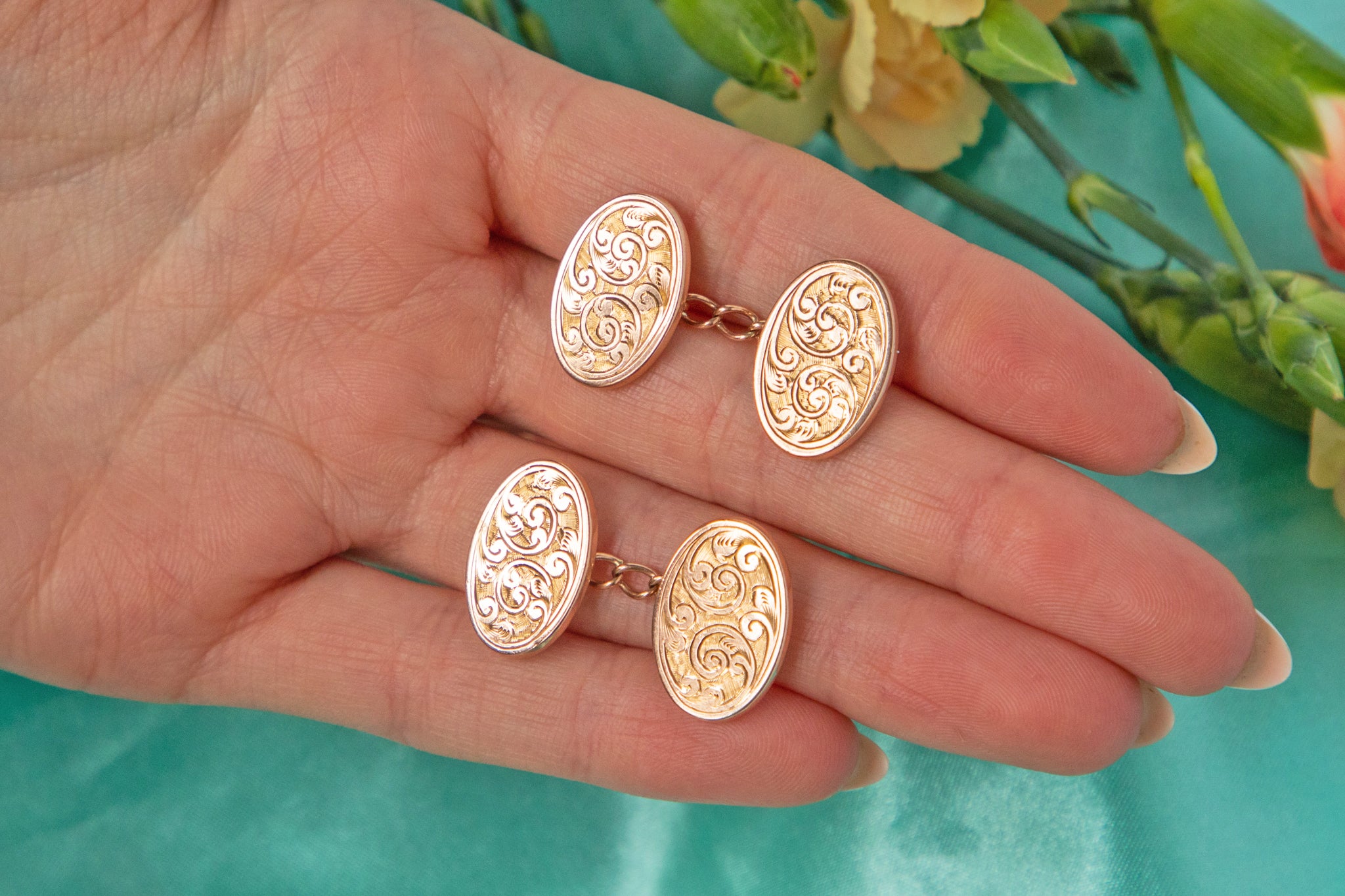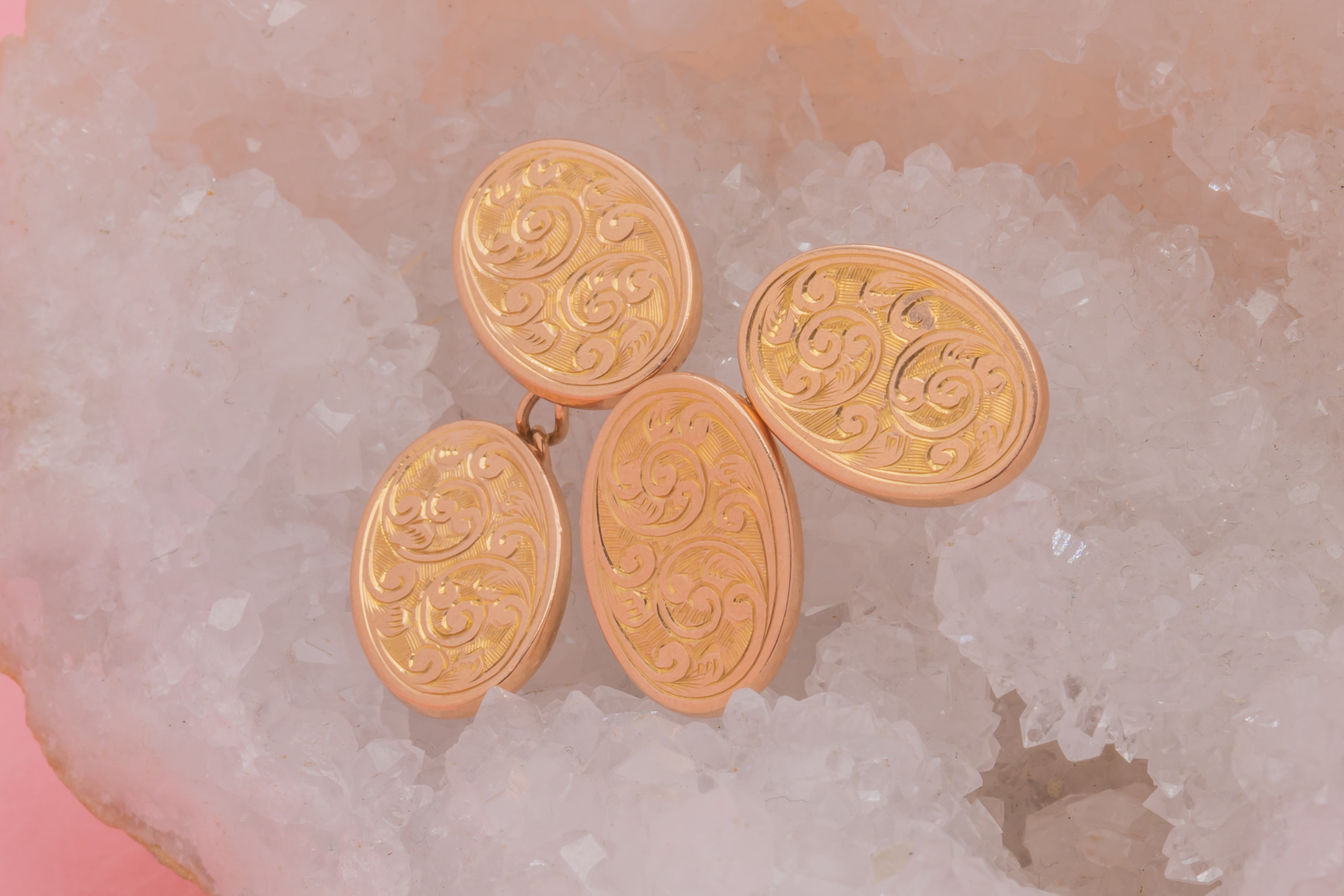 These English Art Deco 9ct Gold engraved cuff links have a beautiful blush tinge, and will add a stunning flash of Gold to your outfits.