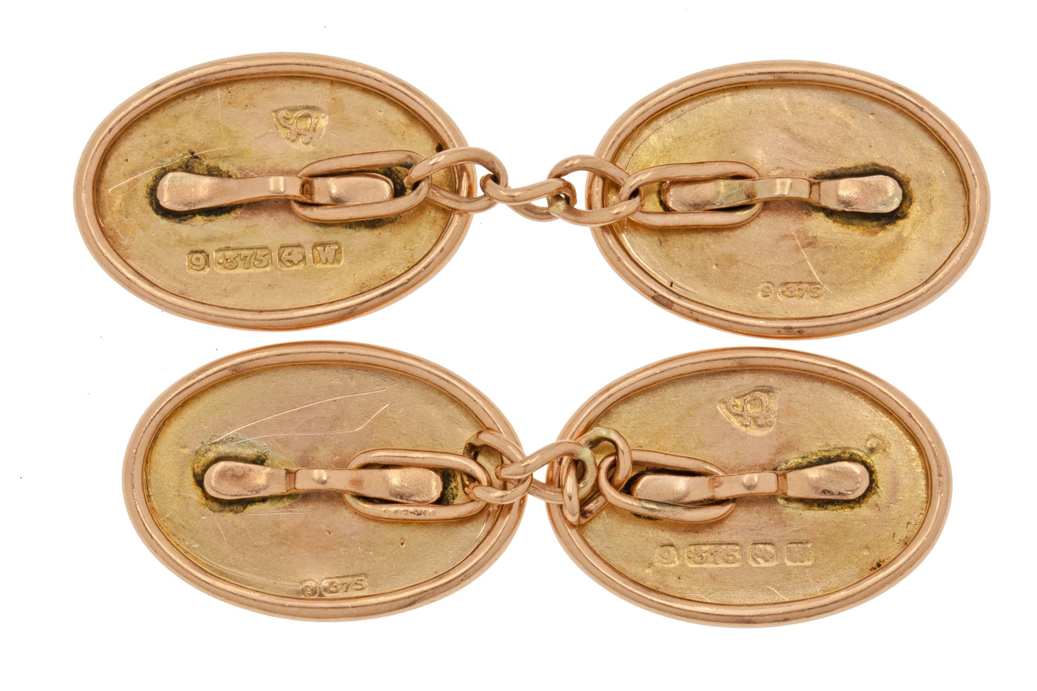 EXCELLENT. These English Art Deco 9ct Gold engraved cuff links are in excellent condition throughout. The Gold has lasted very well over the years, with clear hallmarks still visible. Where the links are joined to the cuffs there is some excess solder, but this won't be seen when worn. The links are all securely connected so you can wear them with the utmost confidence!