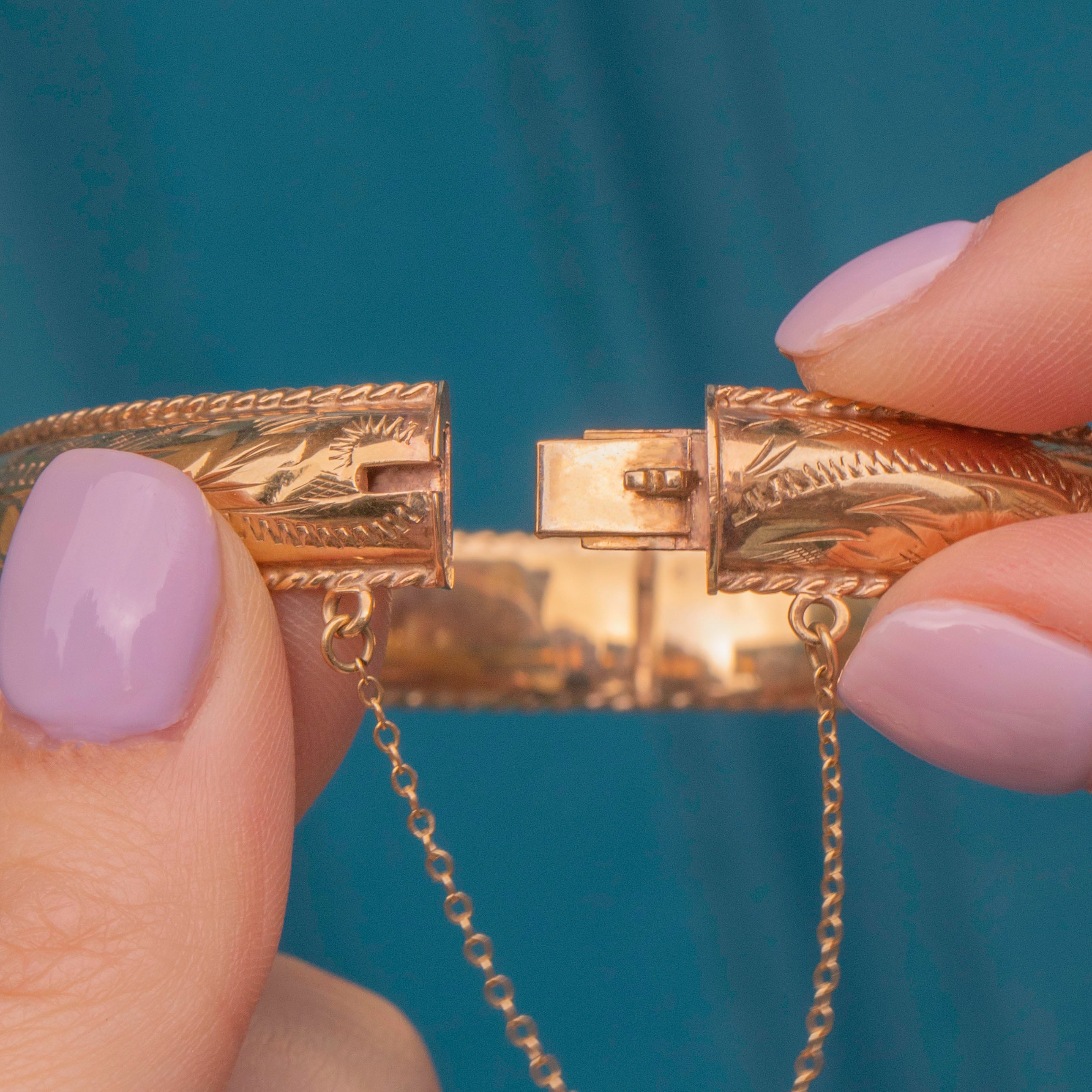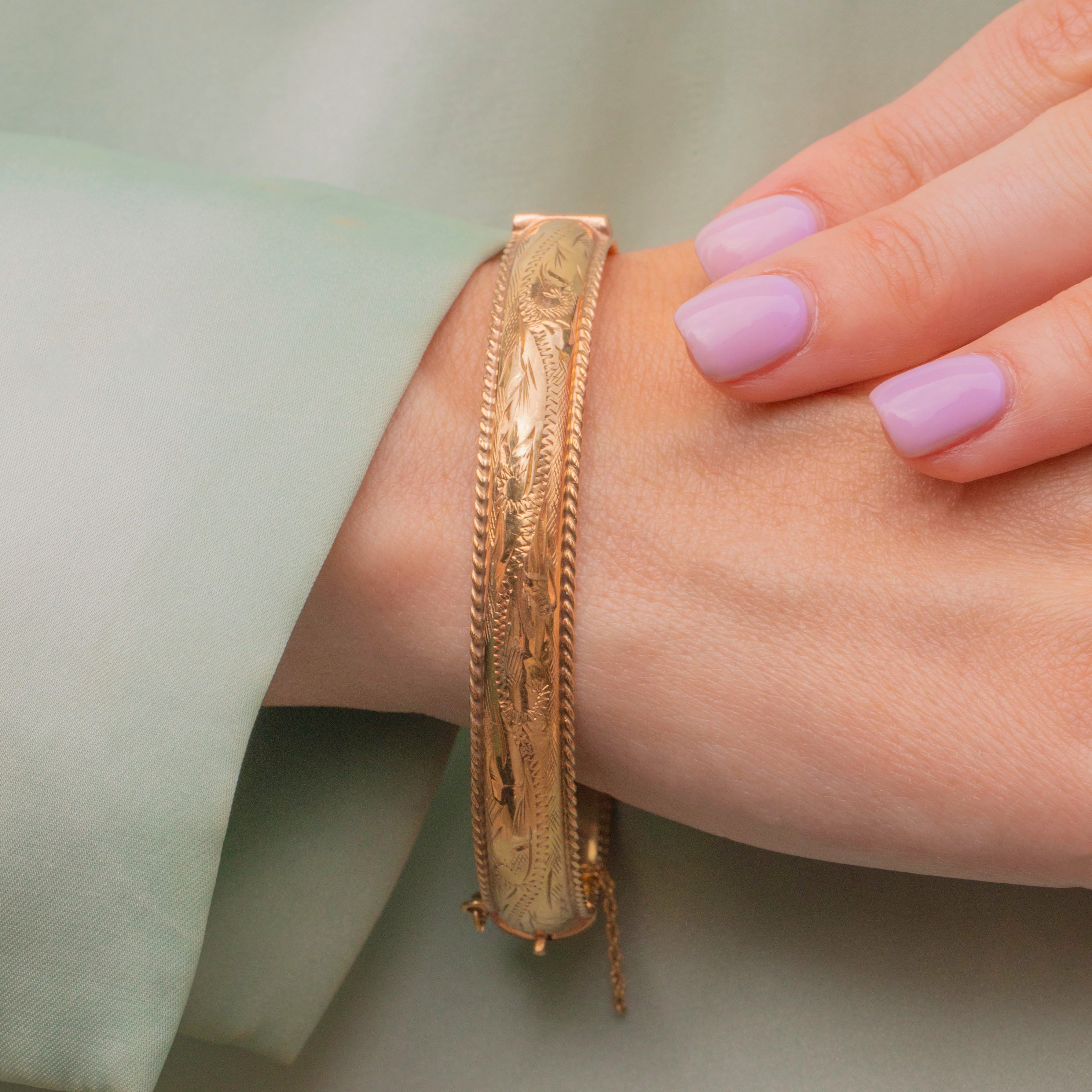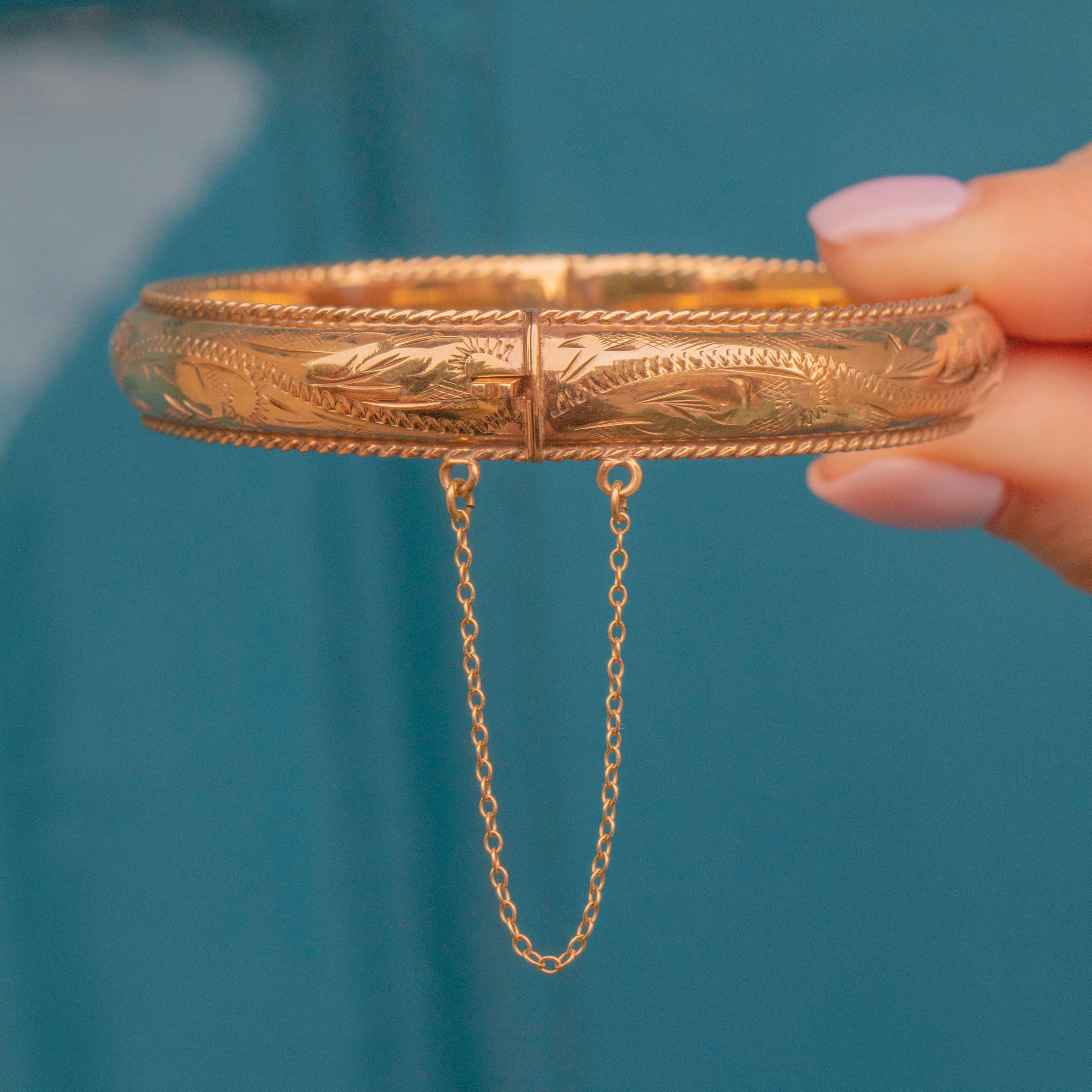 EXCELLENT. This engraved 9ct Gold bangle is in excellent condition! The engravings are glorious and the rope edge has remained perfectly intact. The piece closes securely and there's a safety chain for added security. There are crisp stamps visible.
