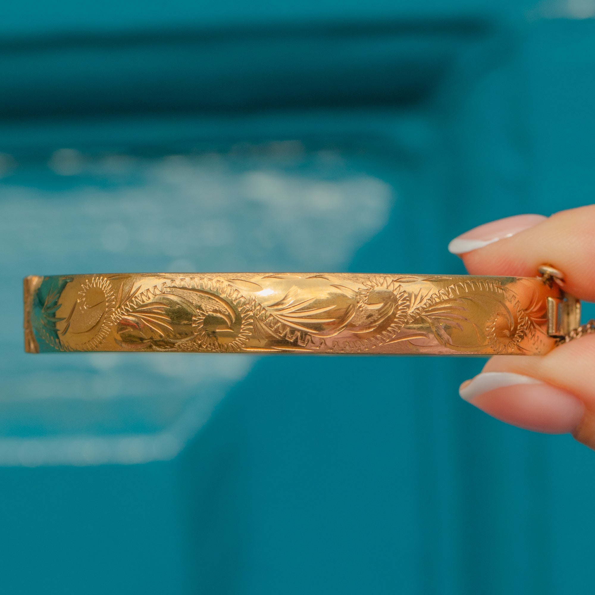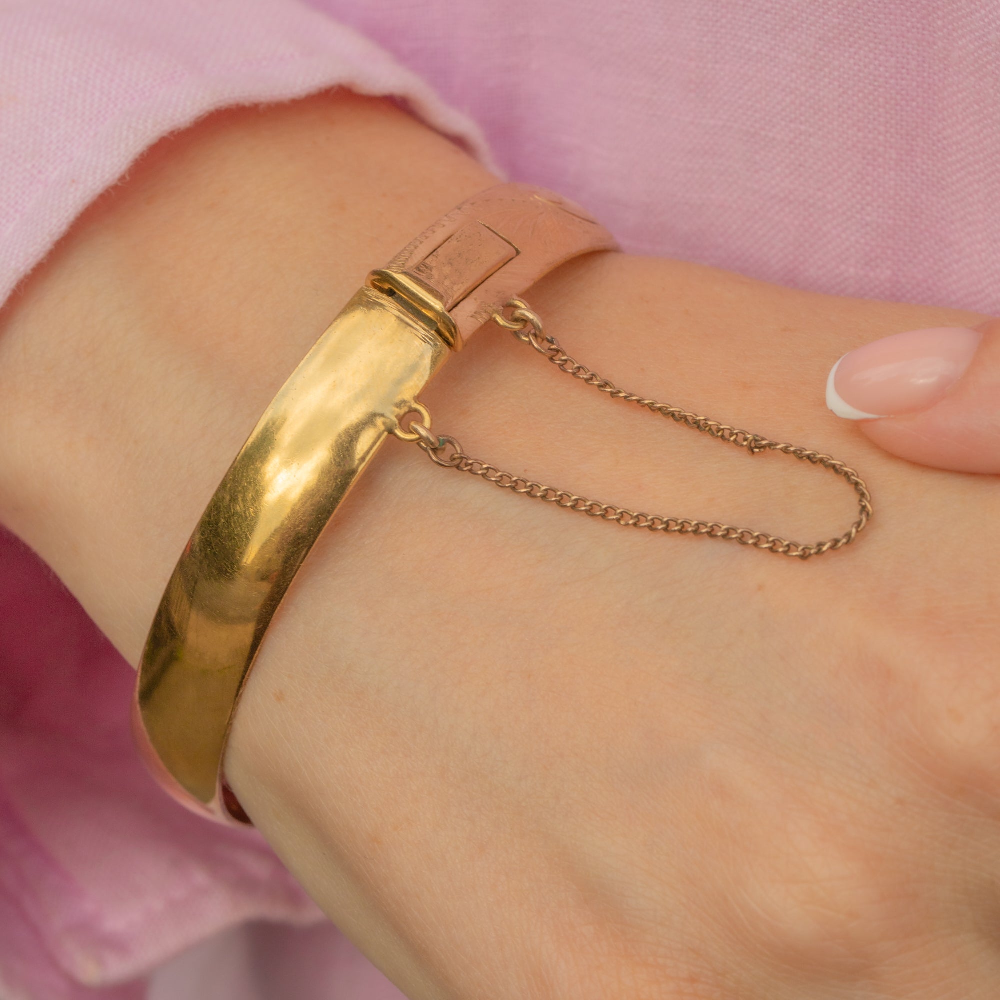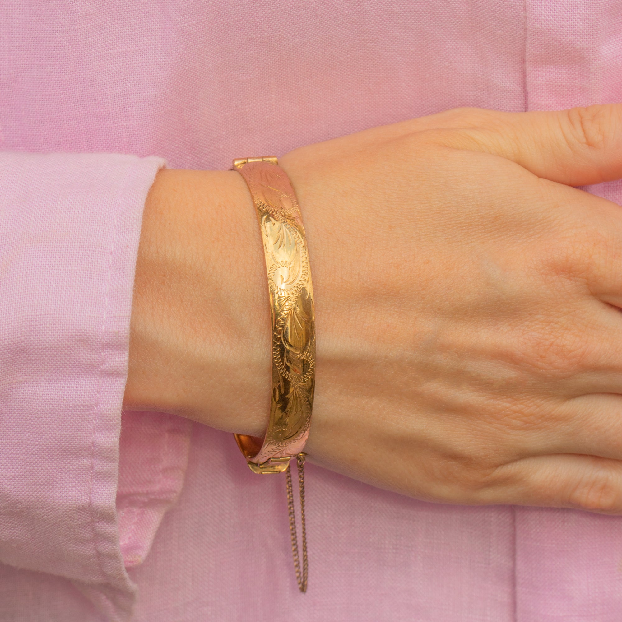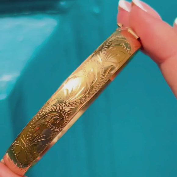 VERY GOOD-EXCELLENT. This Excalibur 9ct rolled Gold engraved bangle is in wonderful condition. There are some surface marks on the tongue from her use over time, but this doesn't affect her functionality. This Gold bangle has a beautifully engraved front, a safety chain for secure wear, and a fully functioning clasp that allows you to wear it with confidence.