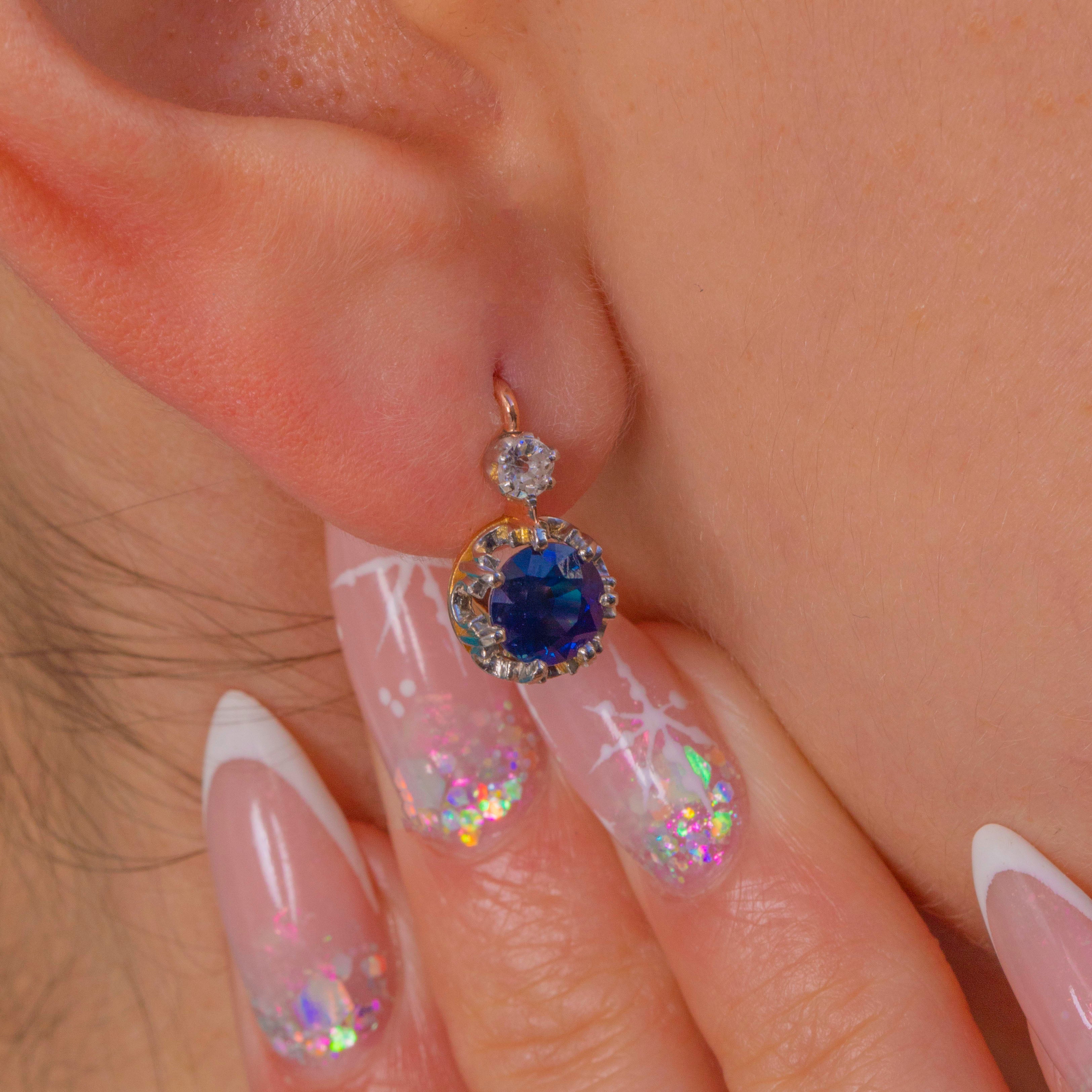 These French Victorian dormeuse earrings marry effortless elegance with timeless craftsmanship. The Royal Blue Sapphires total 1.80ct combined and sit in a white-topped Platinum coronet with delicately scalloped edges and a pierced gallery, giving that classic halo sparkle and refined movement. Above, a single old mine-cut Diamond surmount adds a bright, antique glint, all set against warm 18ct Gold with chic two-tone contrast.