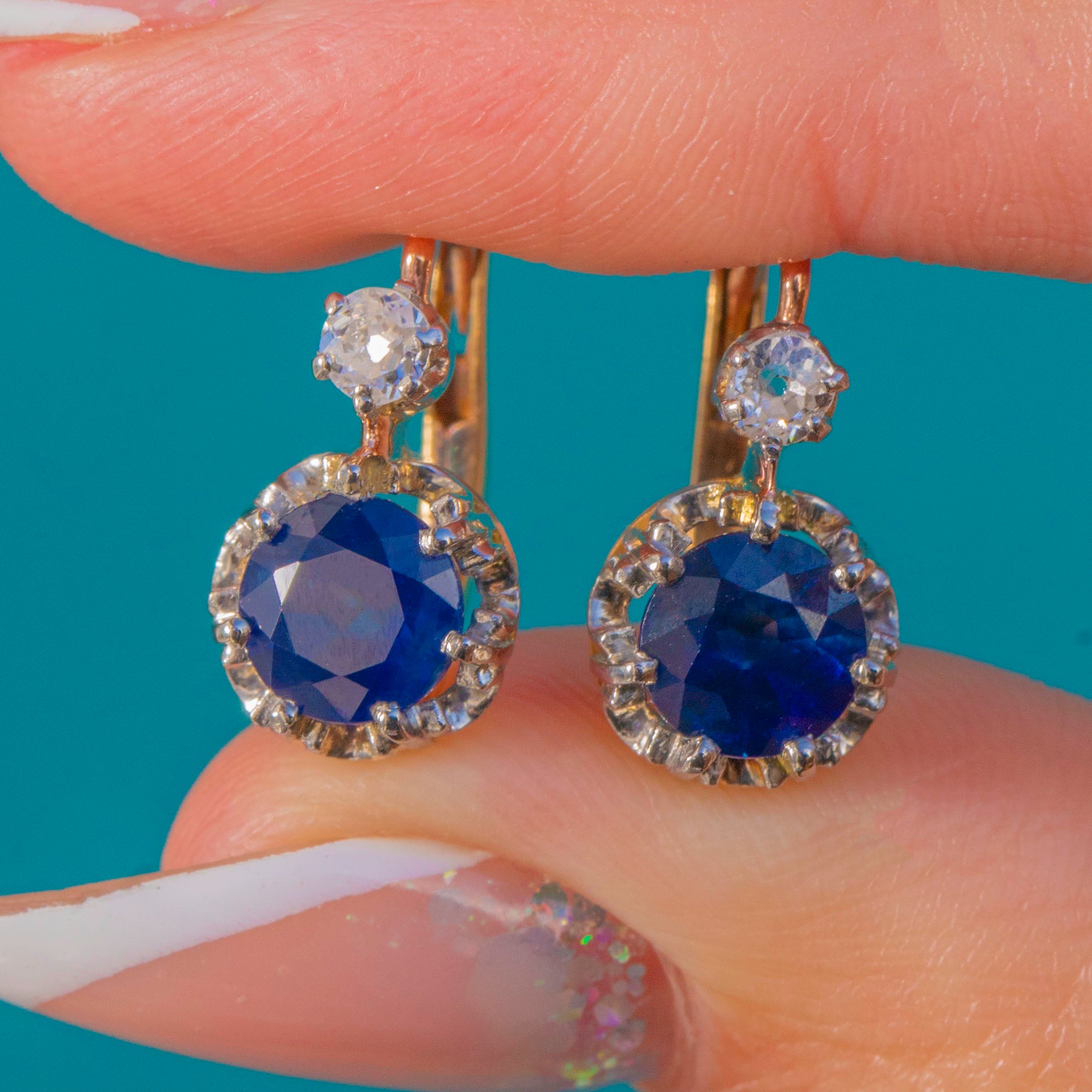 EXCELLENT: Sapphires are bright with rich colour and no eye-visible chips or abrasions; Diamonds are lively with crisp antique sparkle. Settings are clean and secure with well-preserved claws and neat Platinum tops; the 18ct Gold dormeuse fittings open and close smoothly. Light, age-appropriate surface wear and patina only, consistent with careful antique wear.