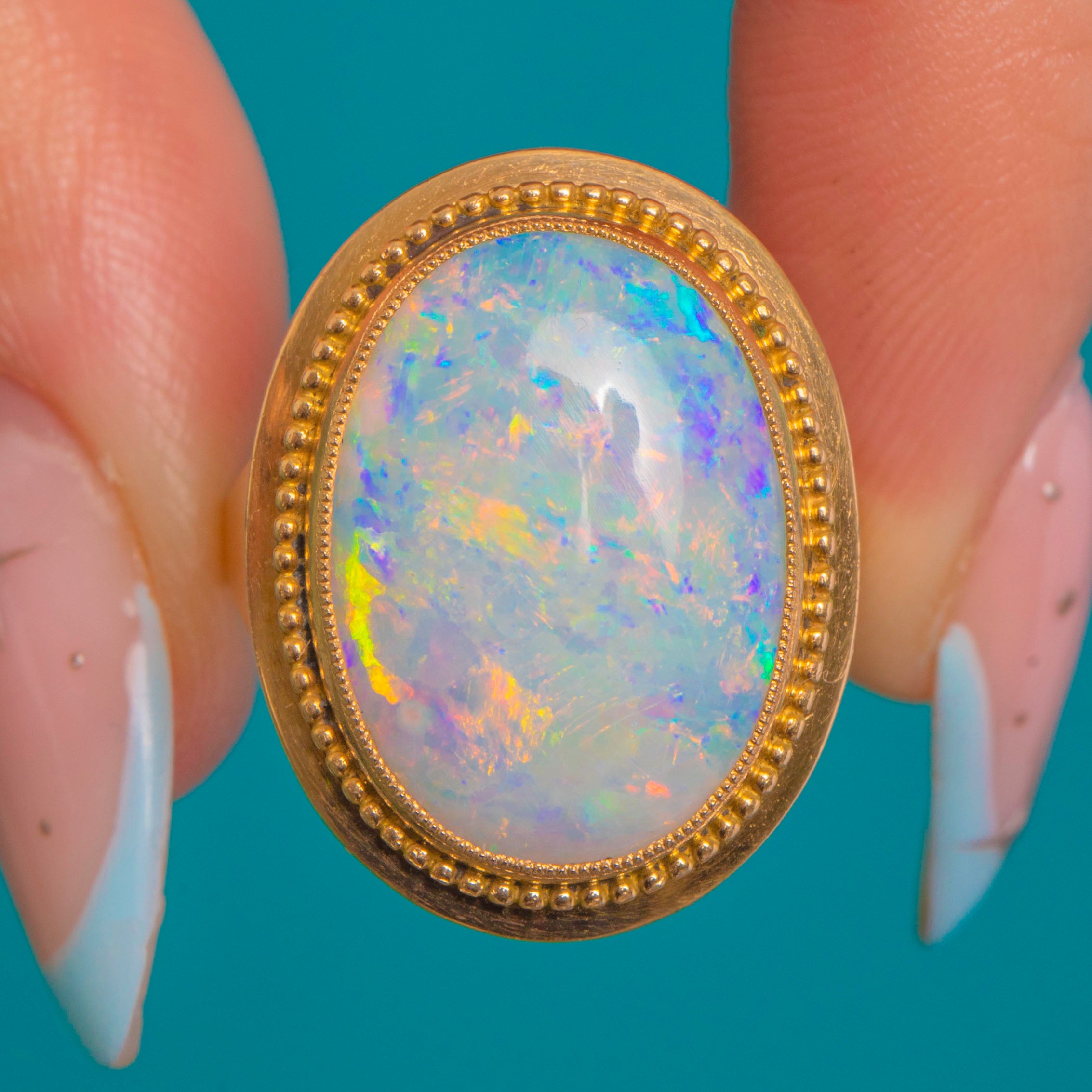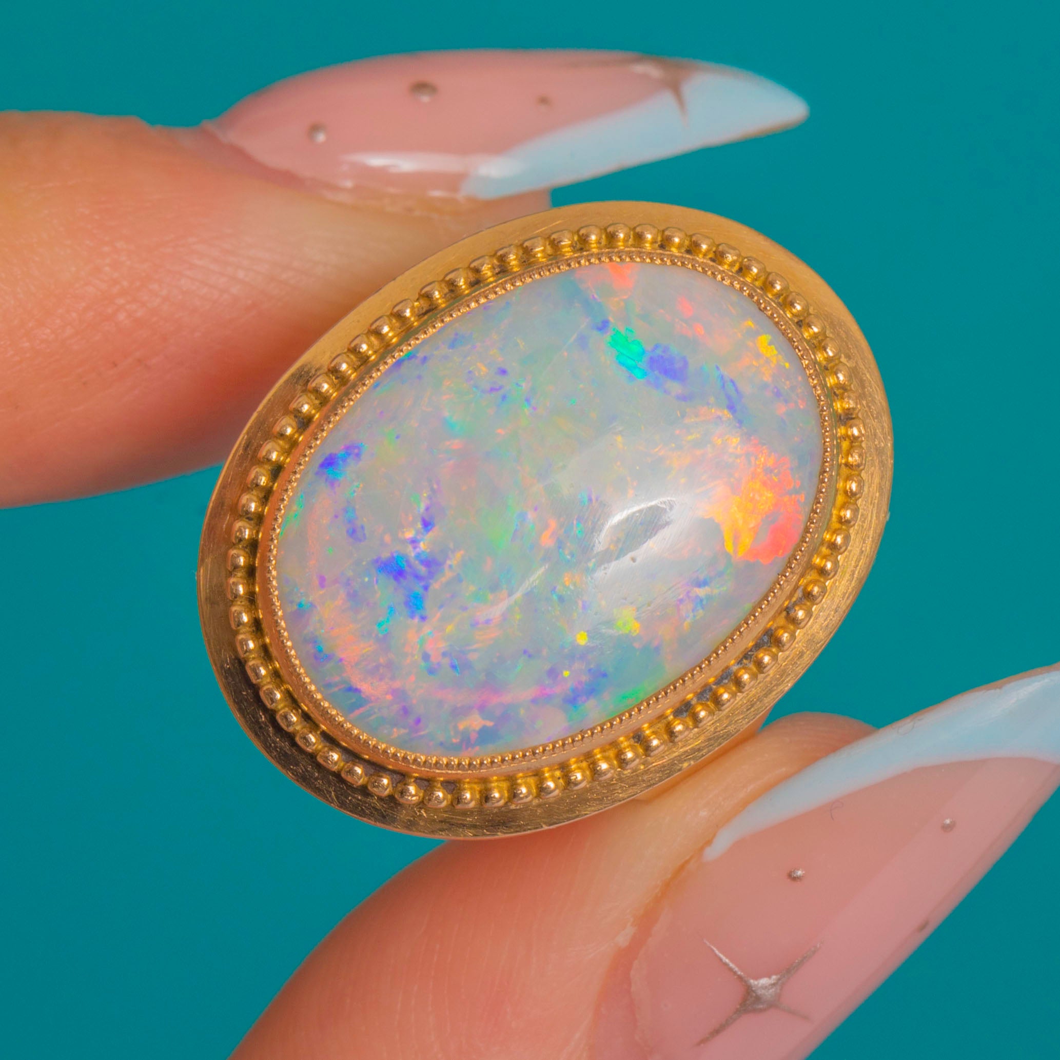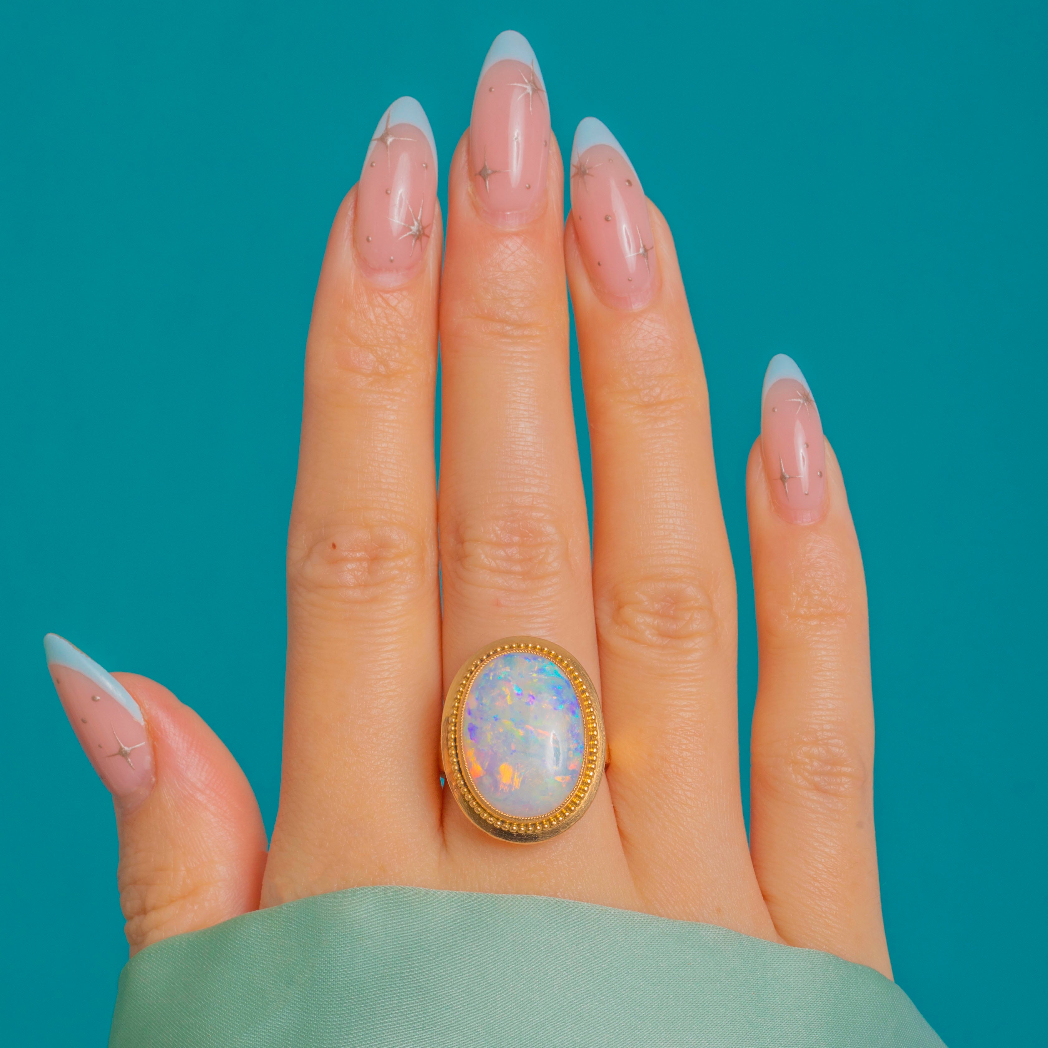 A luminous celebration of colour and craft, this French 18ct Gold cocktail ring showcases a captivating Solid Opal of approximately 4.50ct. The oval cabochon shimmers with vivid play-of-colour—flashes of blue, green, orange and lilac dance across its milky, translucent body—creating a mesmerising, ever-changing display.