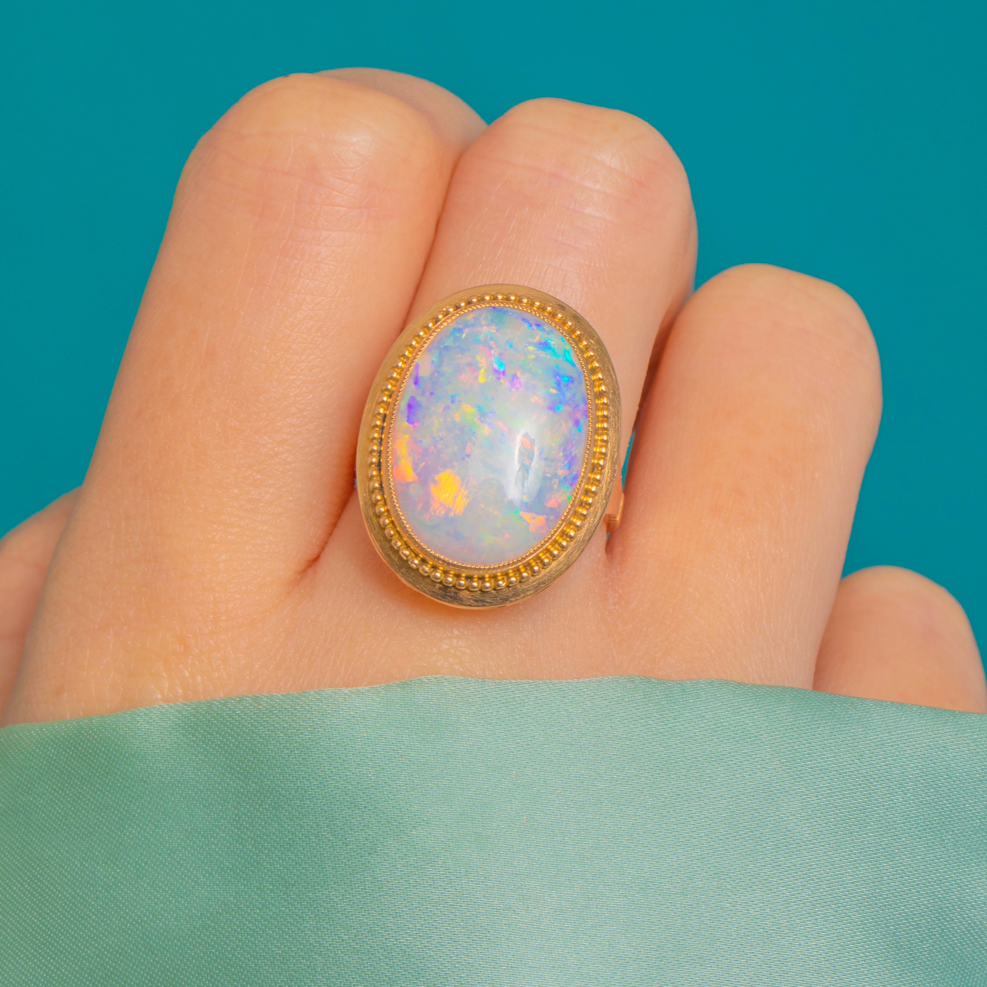 The Opal is cradled within a tall rub-over bezel framed by a refined beaded border. A pierced foliate gallery and elegant split shoulders bring lightness and grace to the statement head, flowing into a smooth, comfortable shank. Mid-Century Vintage, it’s a chic, softly ornate design with beautiful presence on the hand.