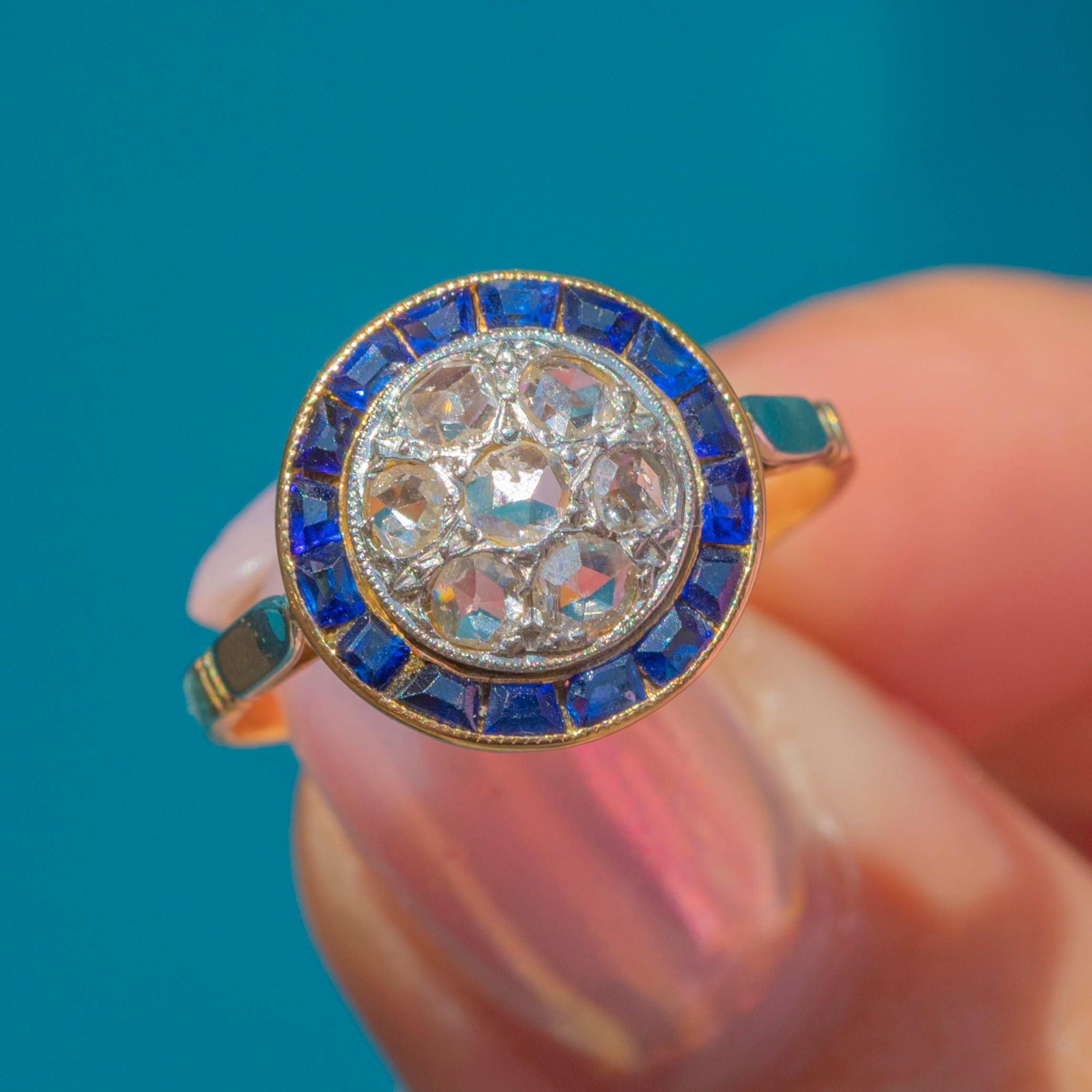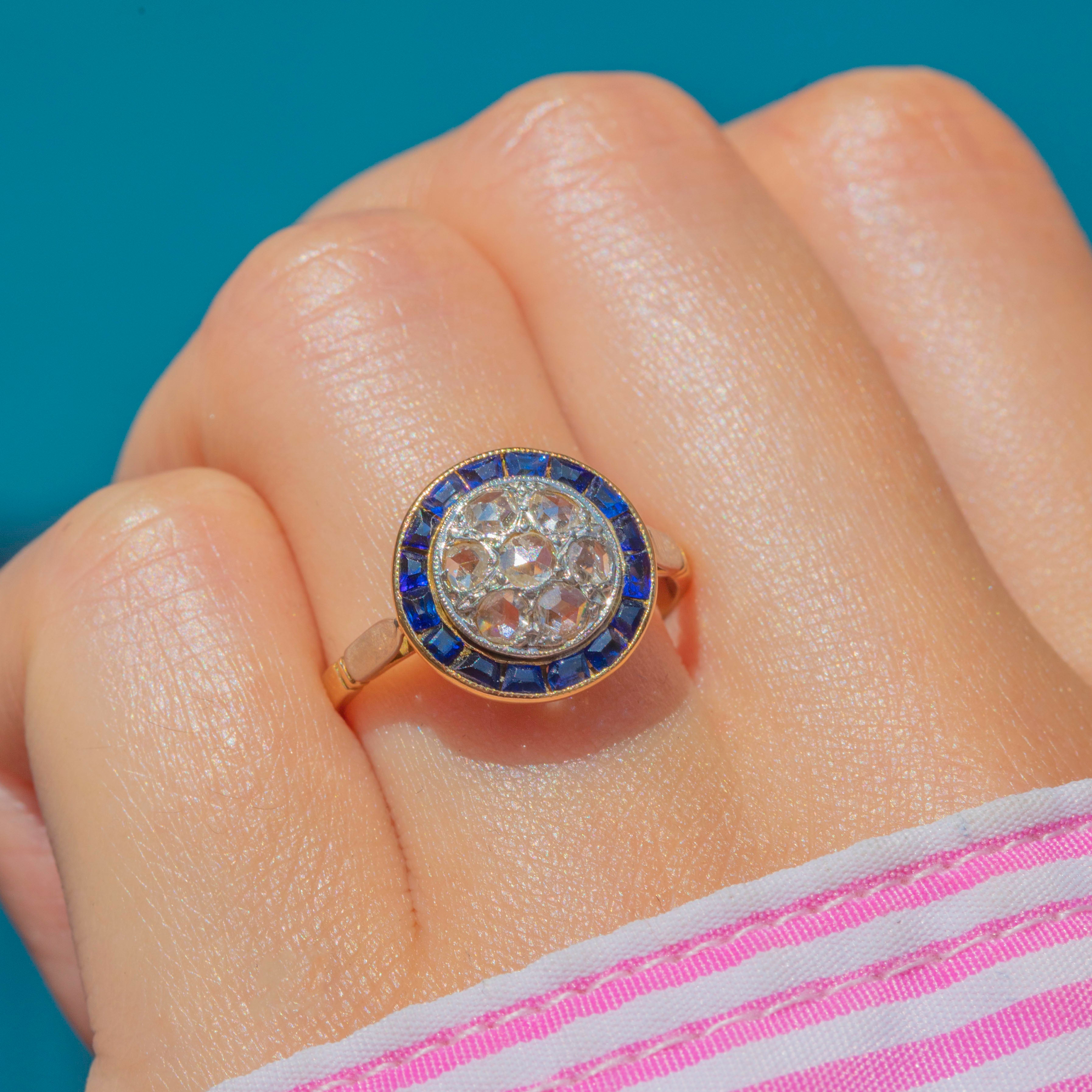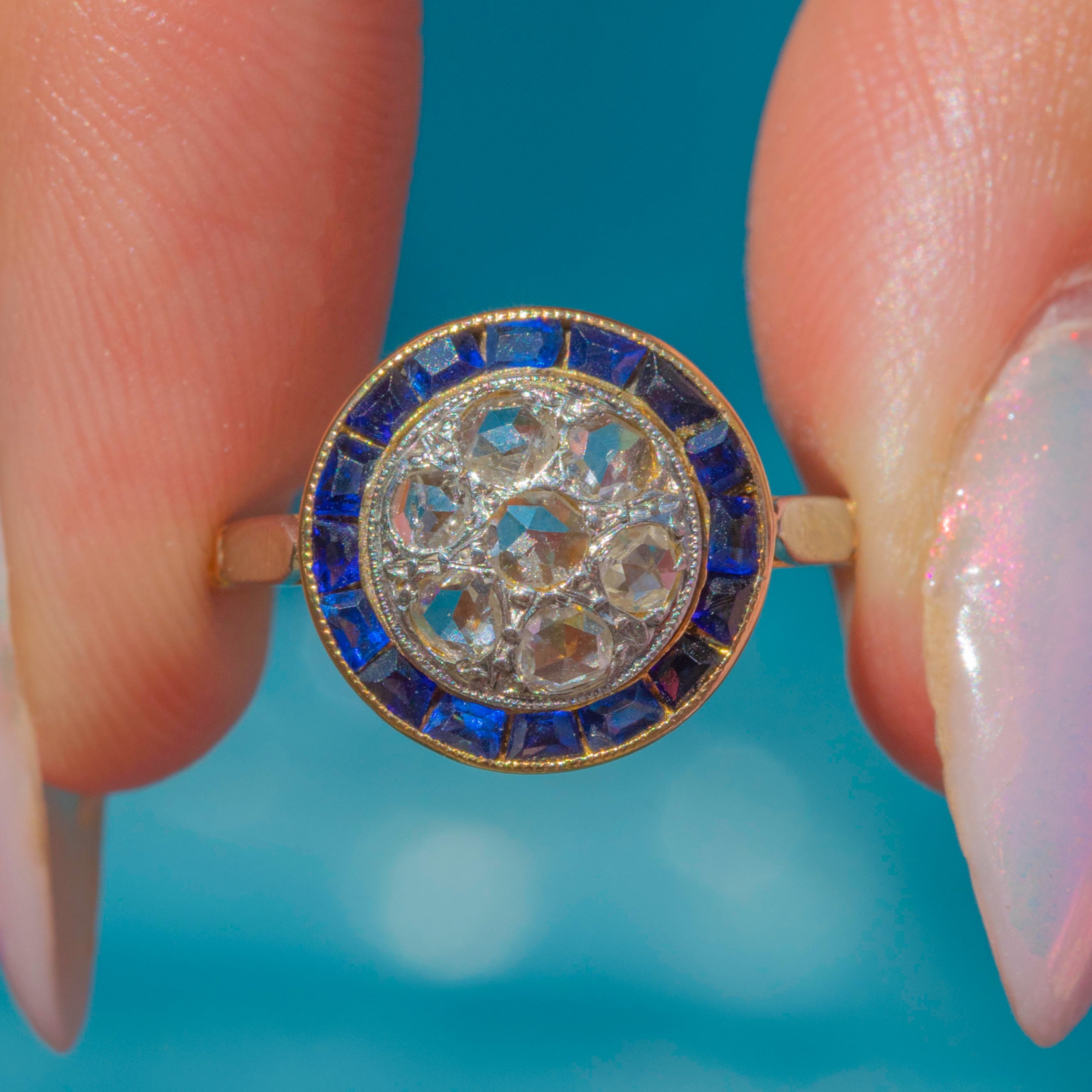 French Art Deco 18ct Gold Sapphire Diamond Target Cluster Ring