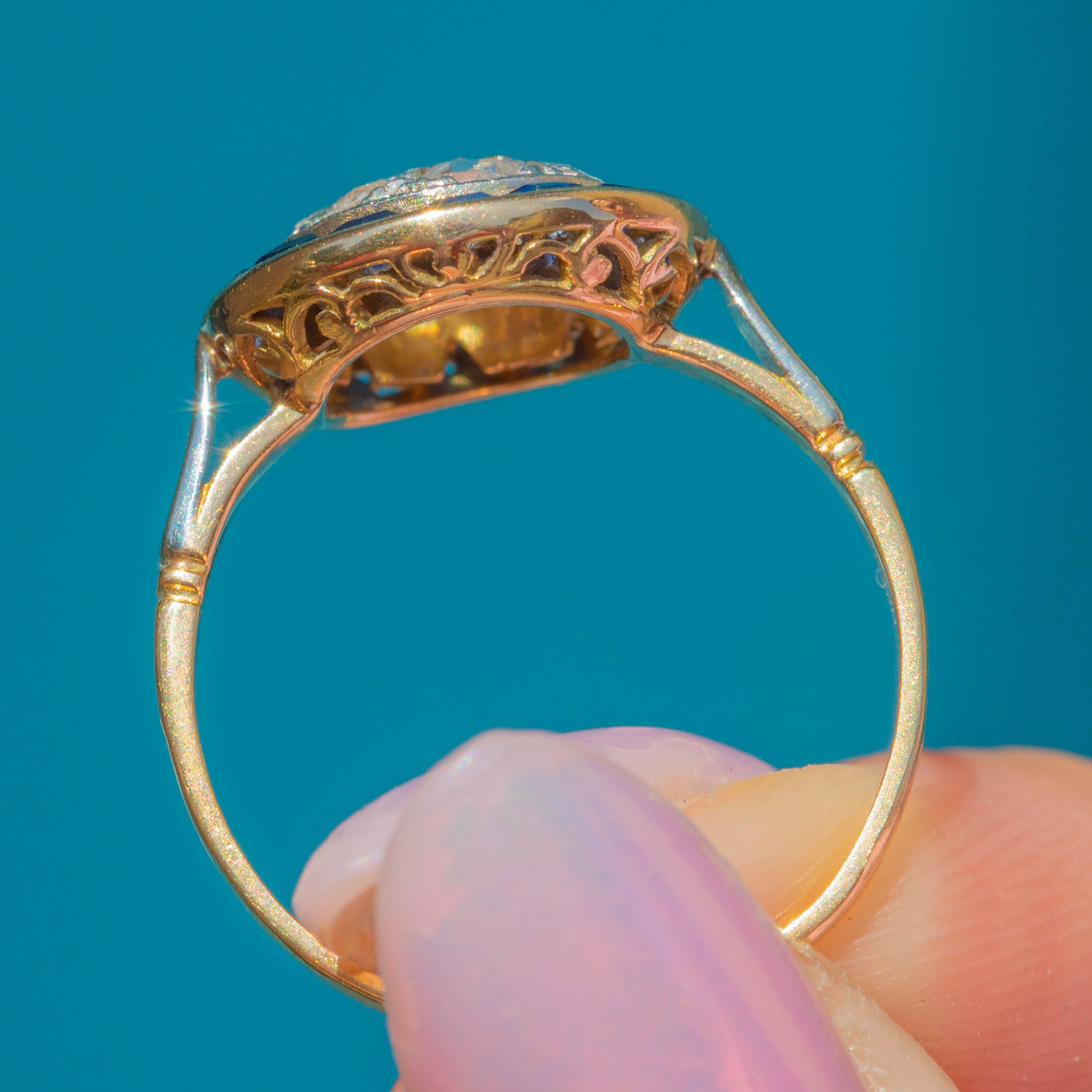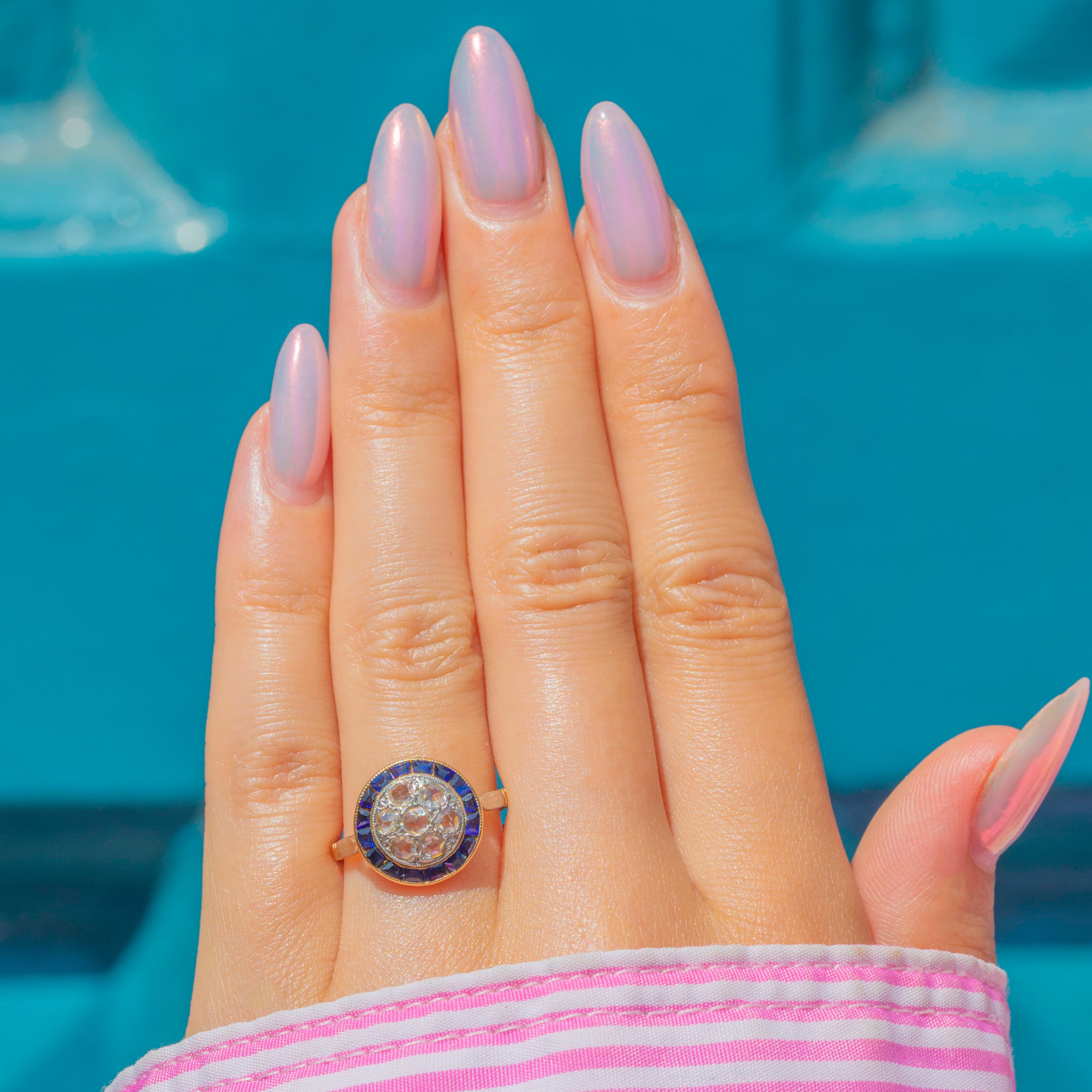 This French Art Deco ring displays 0.25cts of dazzling Diamonds haloed by saturated blue Sapphires, creating a striking target design that is sure to grab the attention of any onlookers!