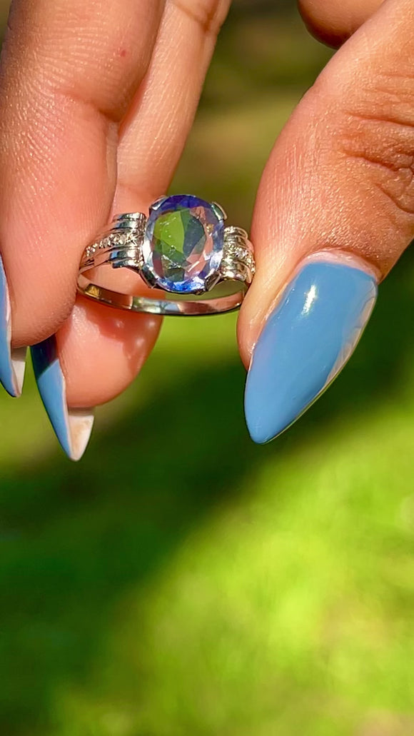 MATERIALS: Tests as 18ct White Gold, Natural Sapphire (2.40ct), Rose-cut Diamonds.
