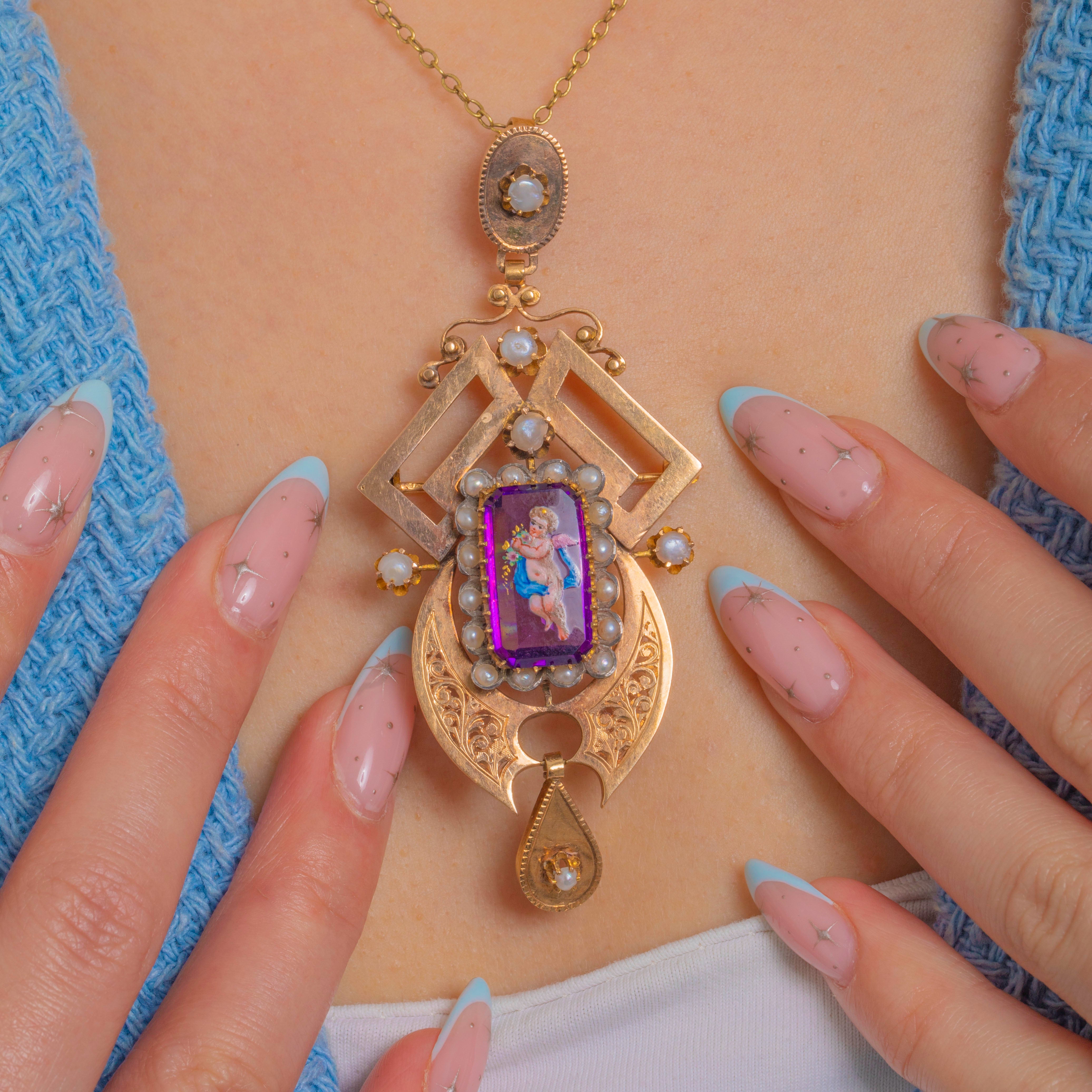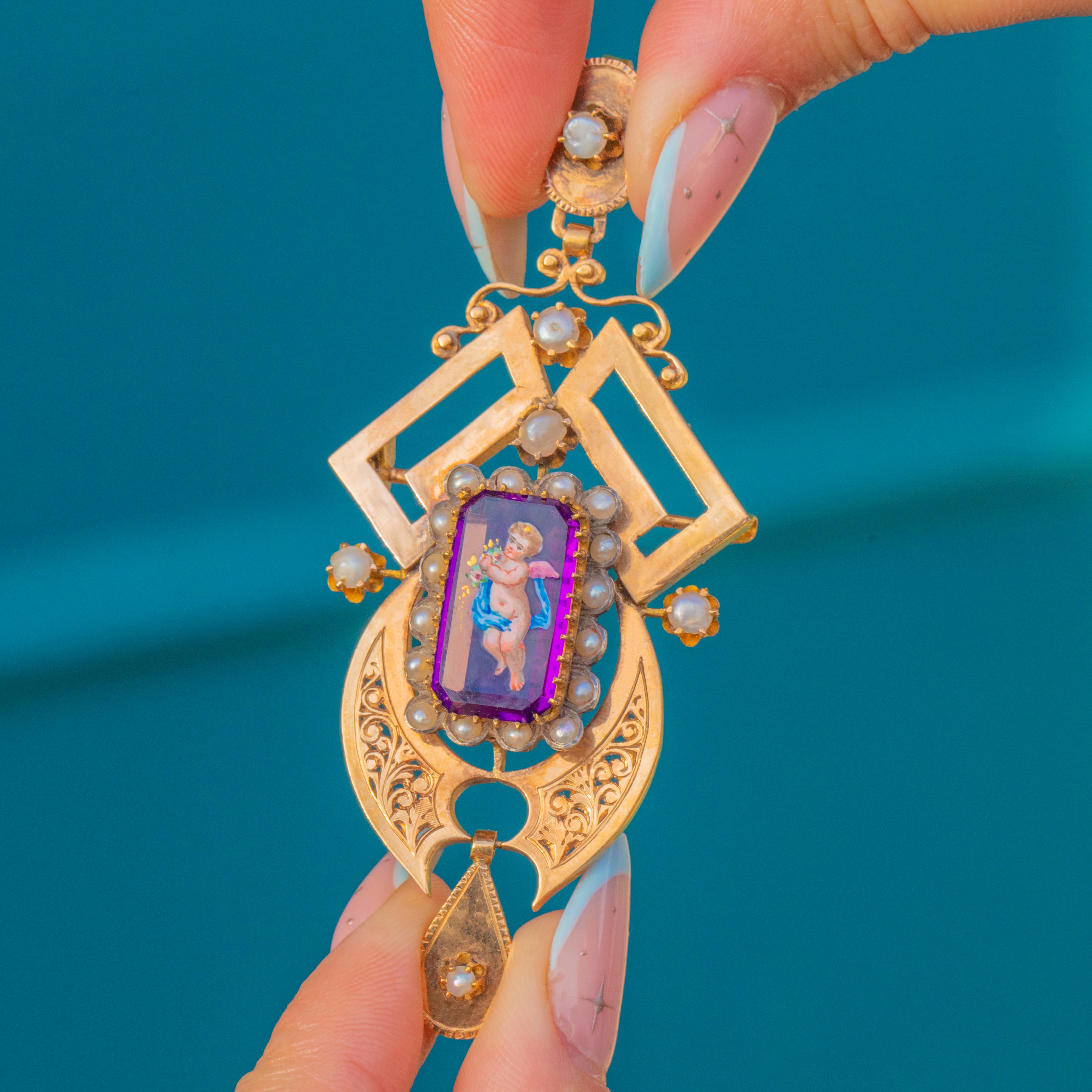 A magnificent French Victorian convertible pendant-brooch in rich 18ct Gold, exquisitely detailed in the Classical Revival style. At its heart sits a rectangular purple Paste tablet bearing a charming painted cherub, encircled by lustrous Pearls set in Silver to heighten their glow. The composition is romantic and architectural, with applied bead and rope borders for delicious texture and light play.