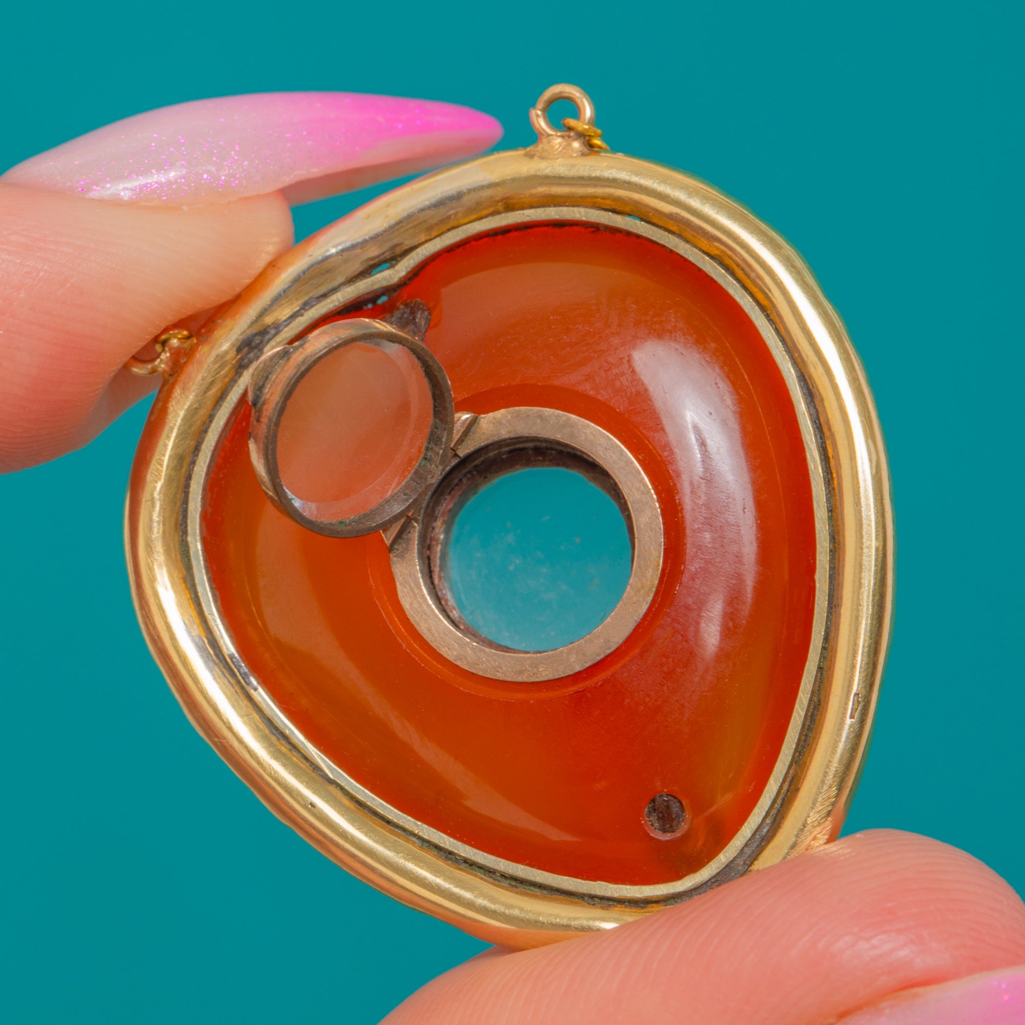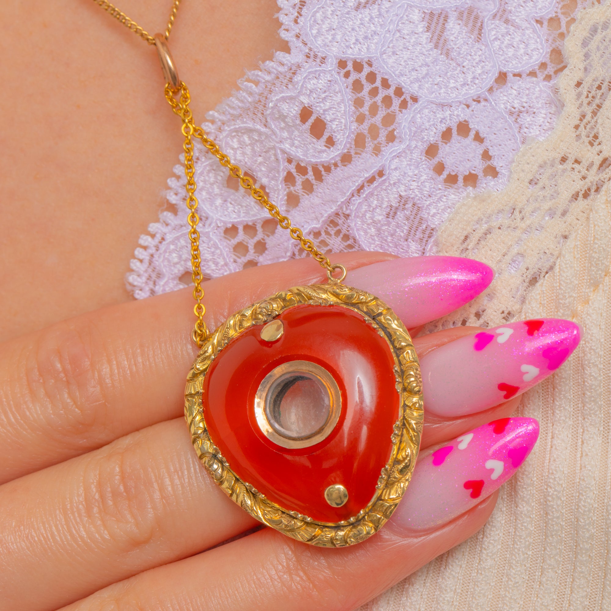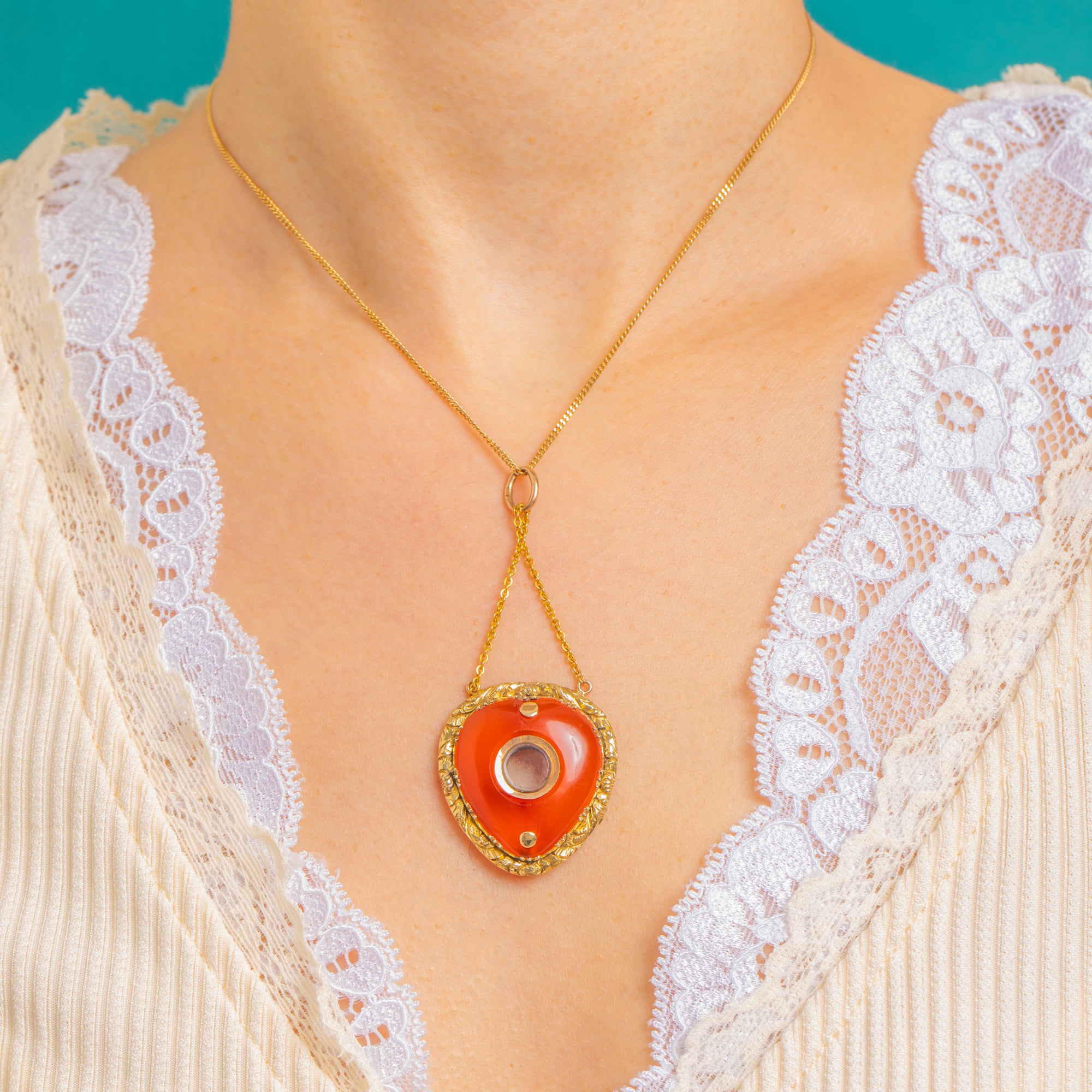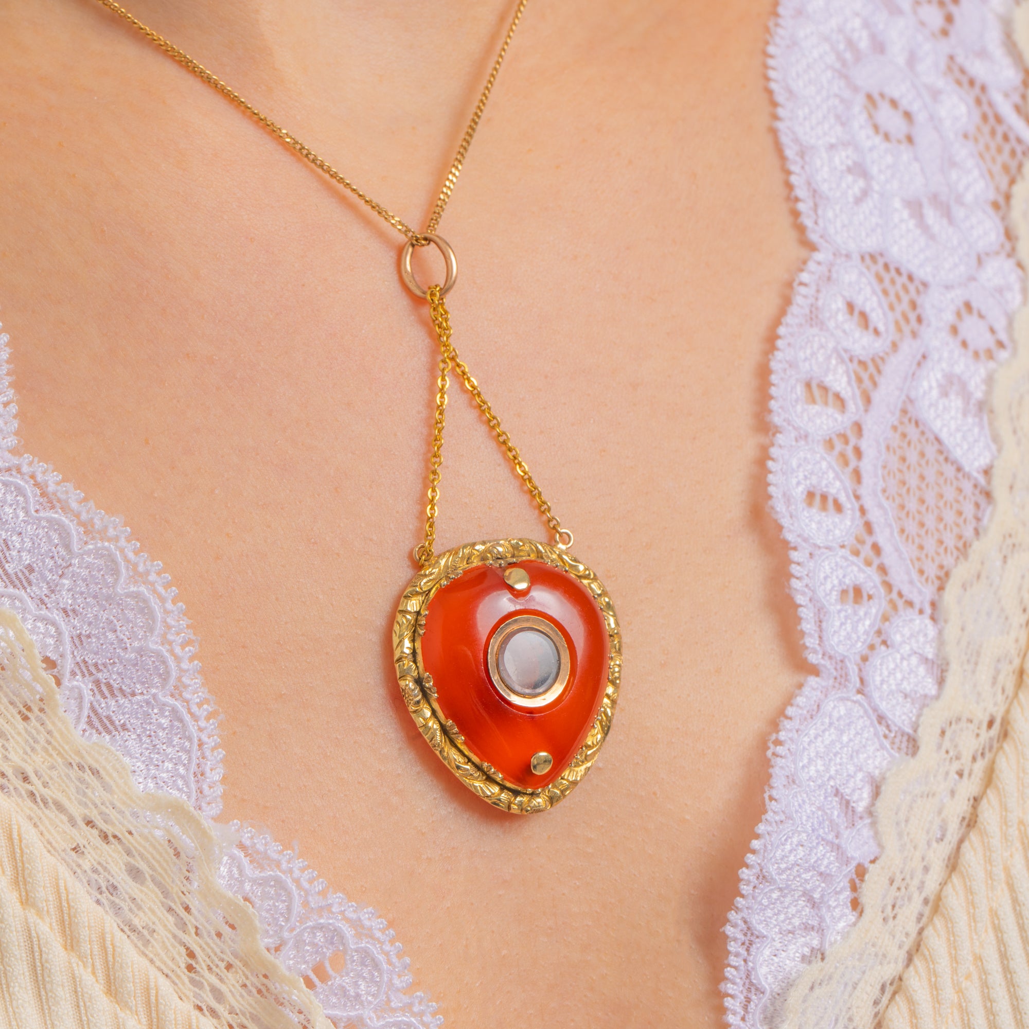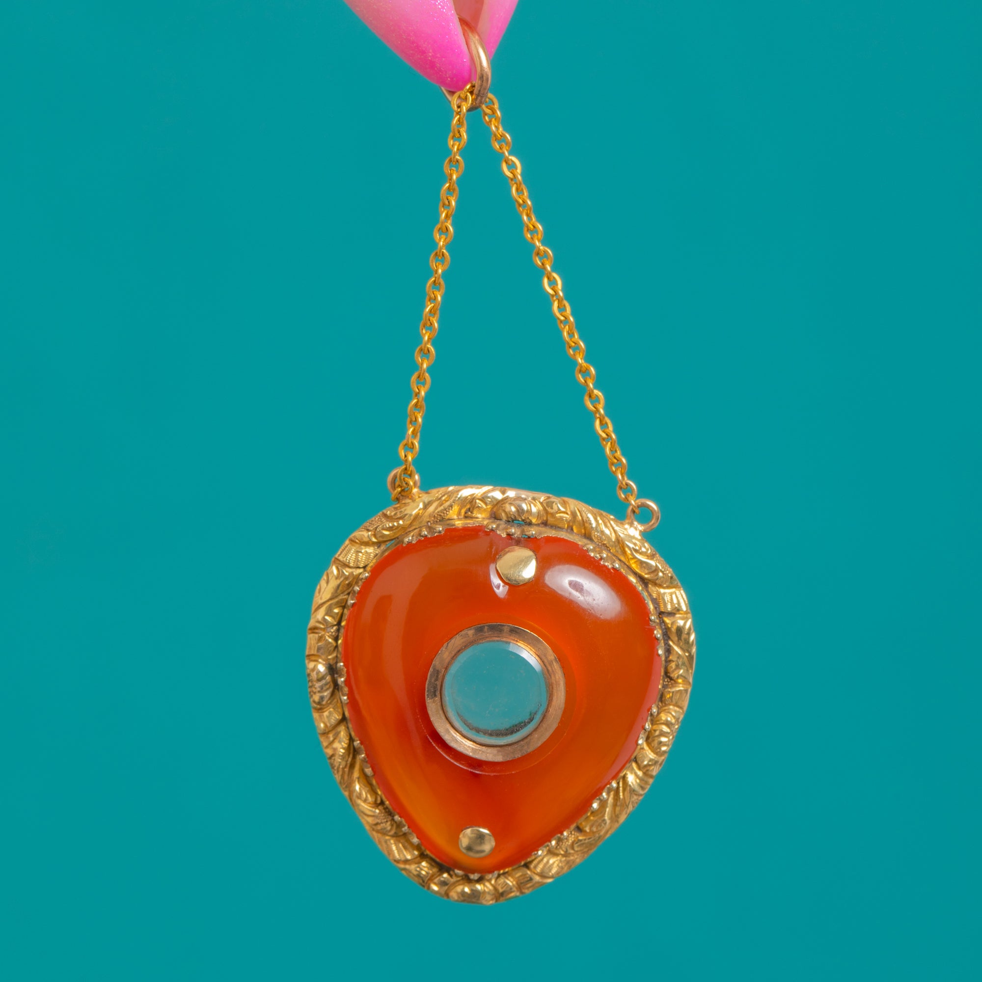 A rare Georgian treasure, this c.1820 heart locket pendant is crafted in glowing 15ct Gold and crowned with a sumptuous Carnelian cabochon of approximately 10.00ct. The stone’s rich orange-red hue shimmers warmly against the antique Gold, while the locket centre offers a discreet glazed compartment for a cherished memento.