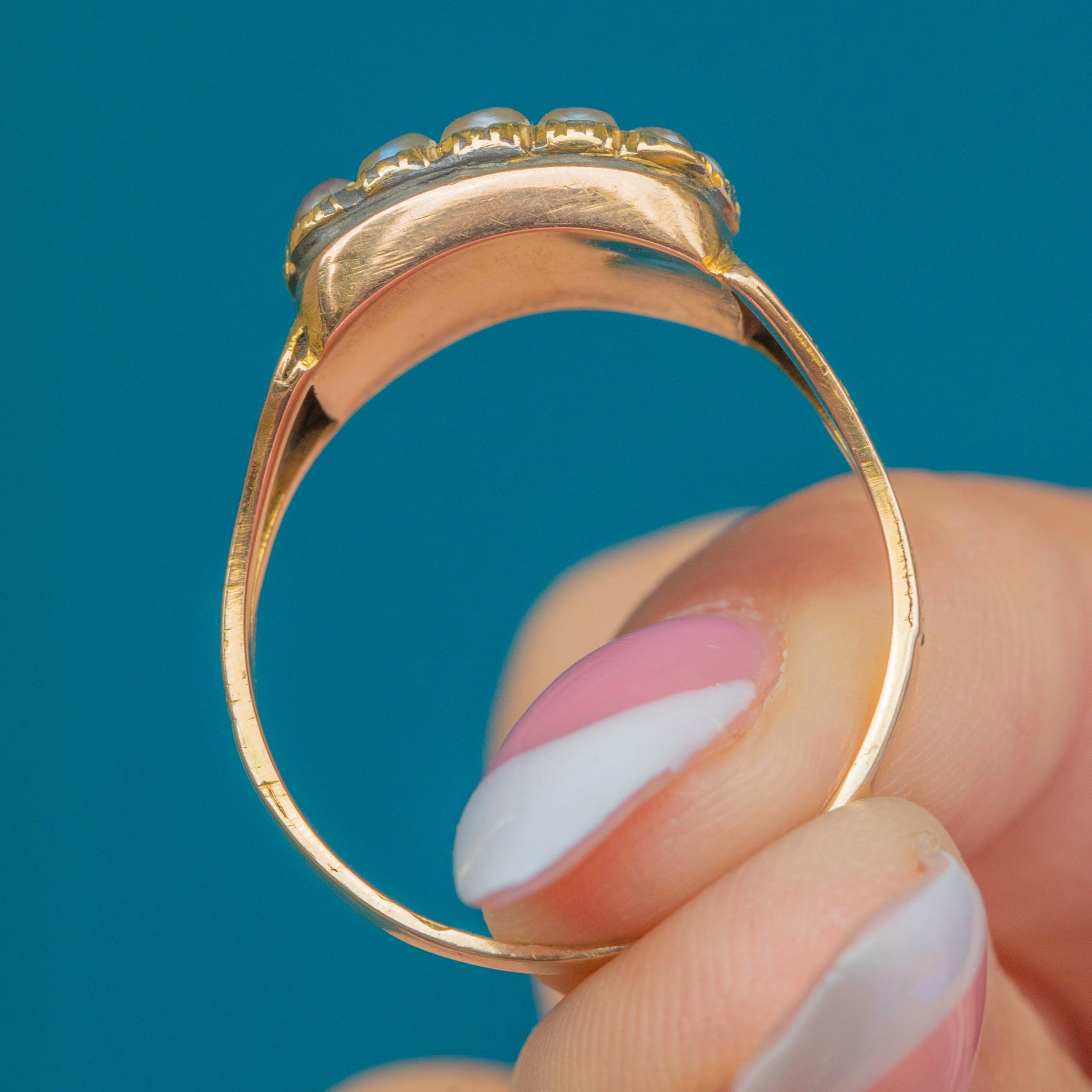 A beautifully preserved Georgian mourning ring crafted in rich 15ct Gold. The central rectangular compartment is framed beneath a glazed cover and sits within a halo of lustrous Pearls, a classic symbol of remembrance. Finely engraved floral shoulders add delicate detail and underscore the period craftsmanship.