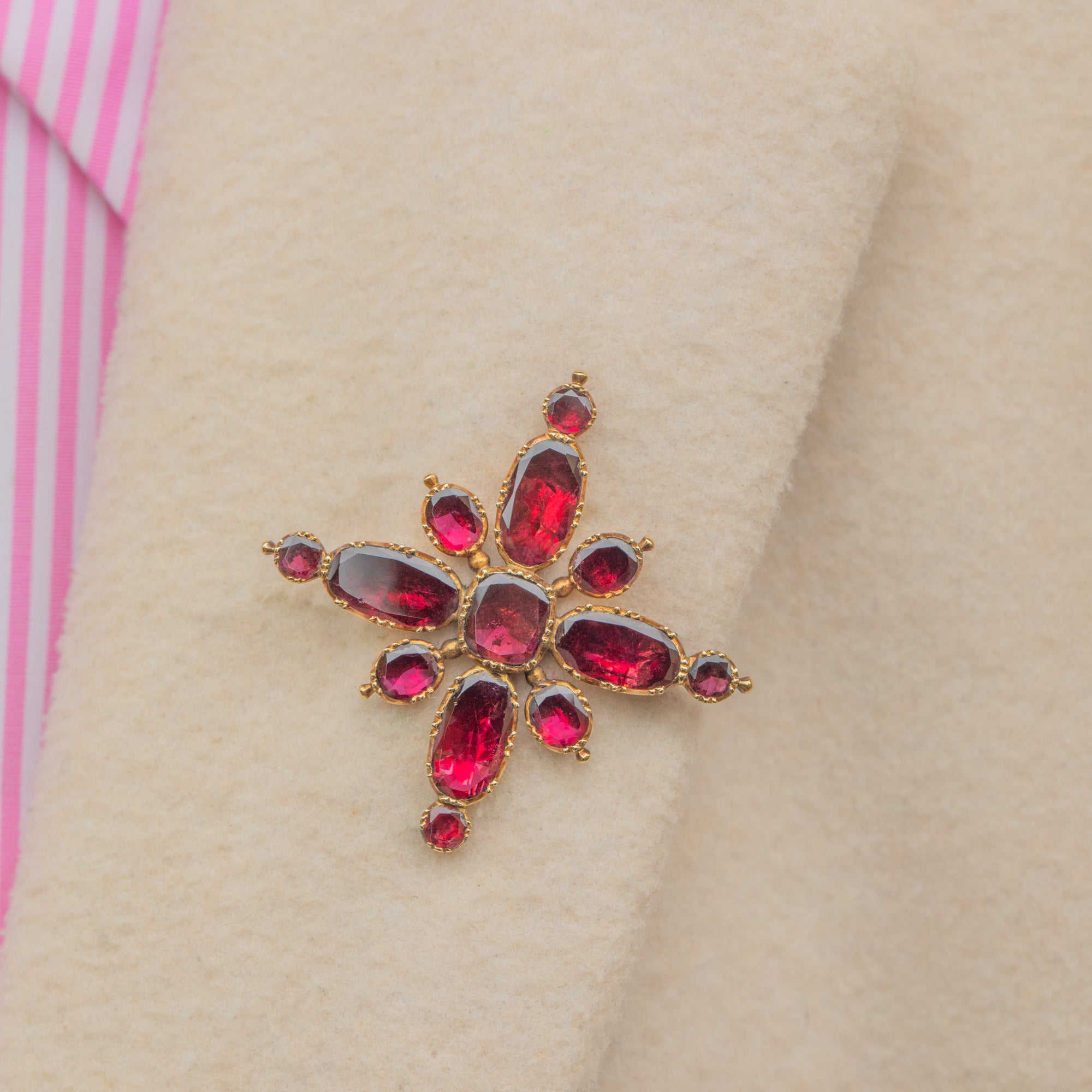 You will be blown away by this Georgian 15ct Gold flat-cut Garnet Maltese cross brooch! Steeped in Georgian charm, flat cut Garnets adorn every inch of this Maltese cross. Graduating in size, her intricately shaped Garnets exude fabulous red wine hues.
