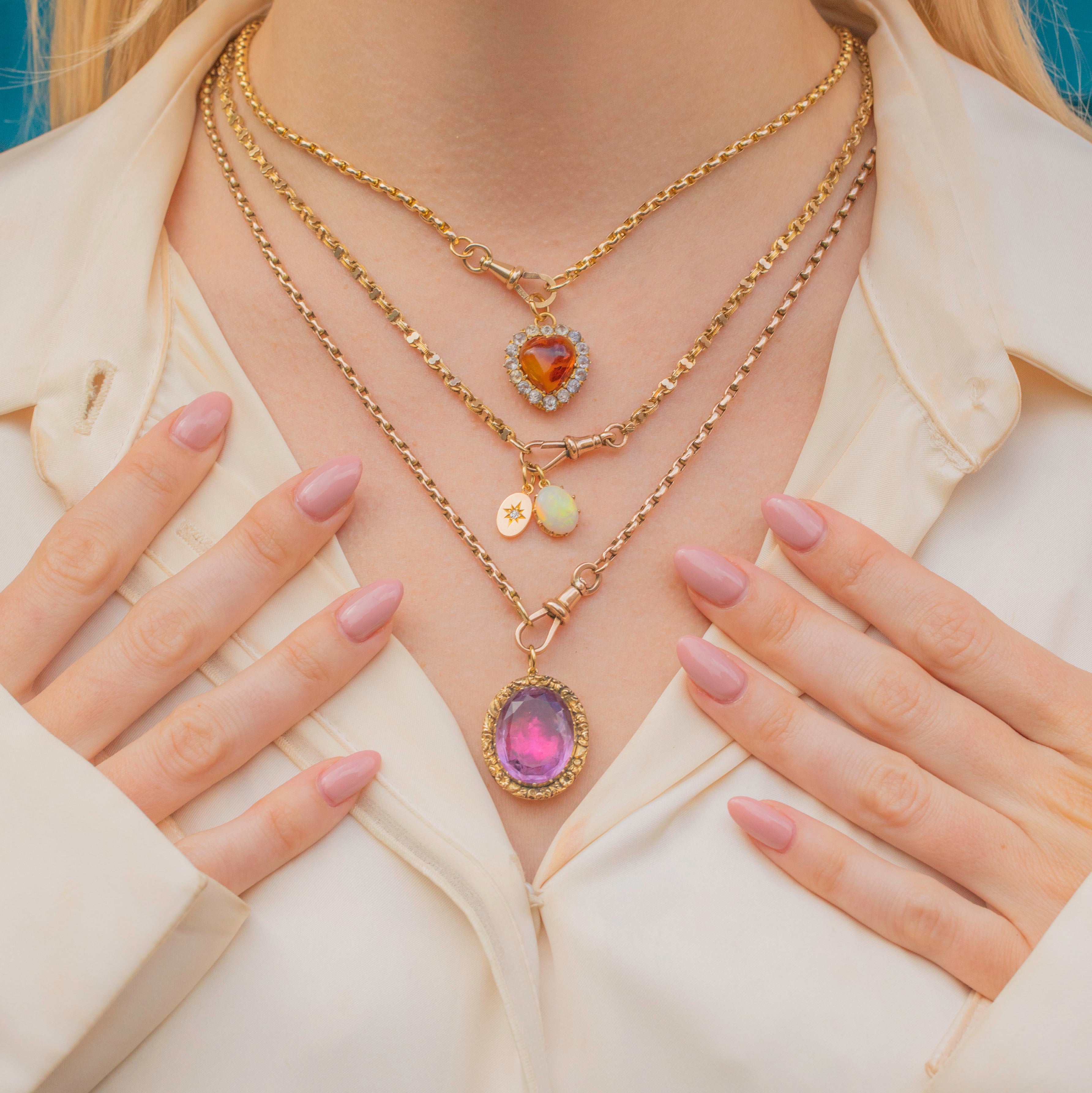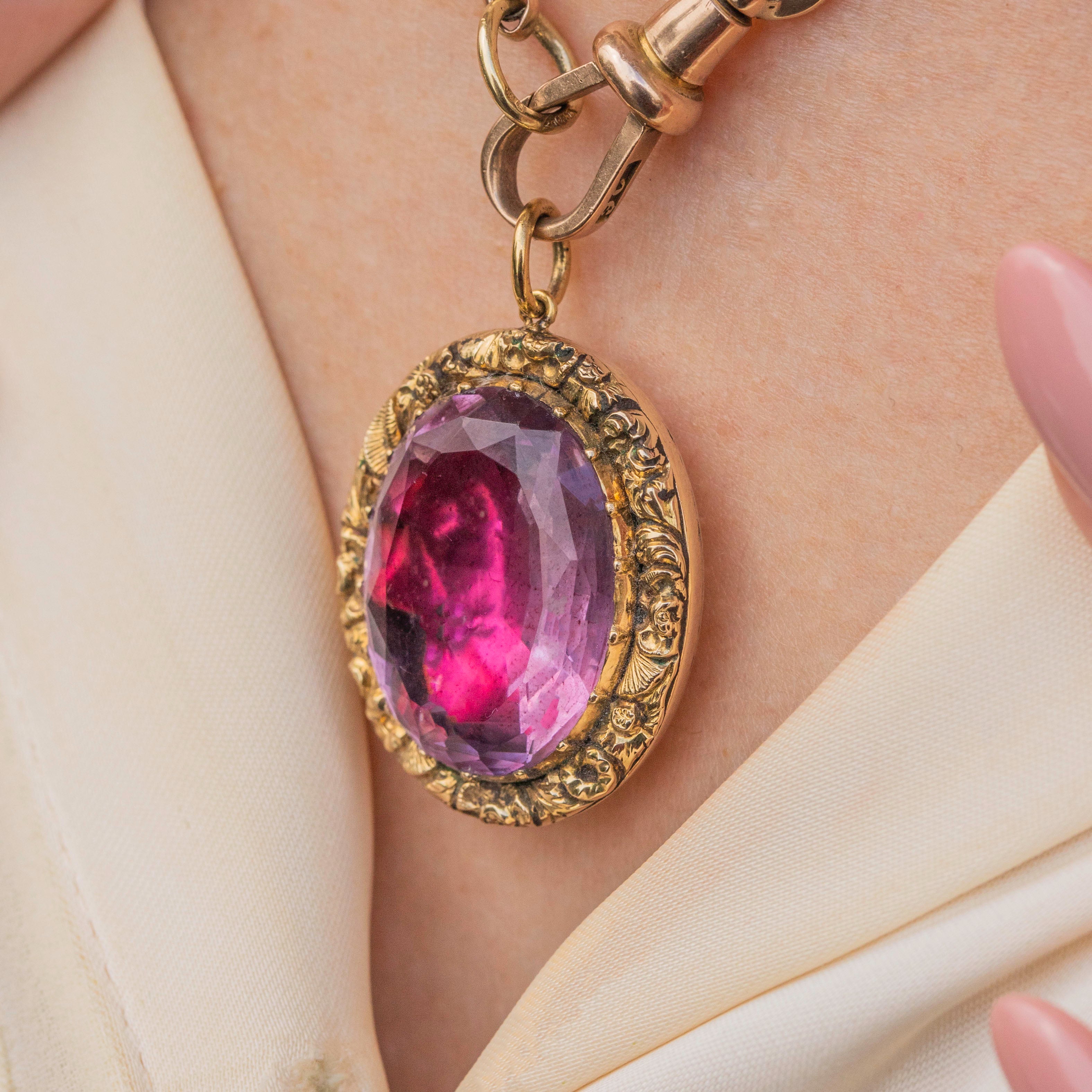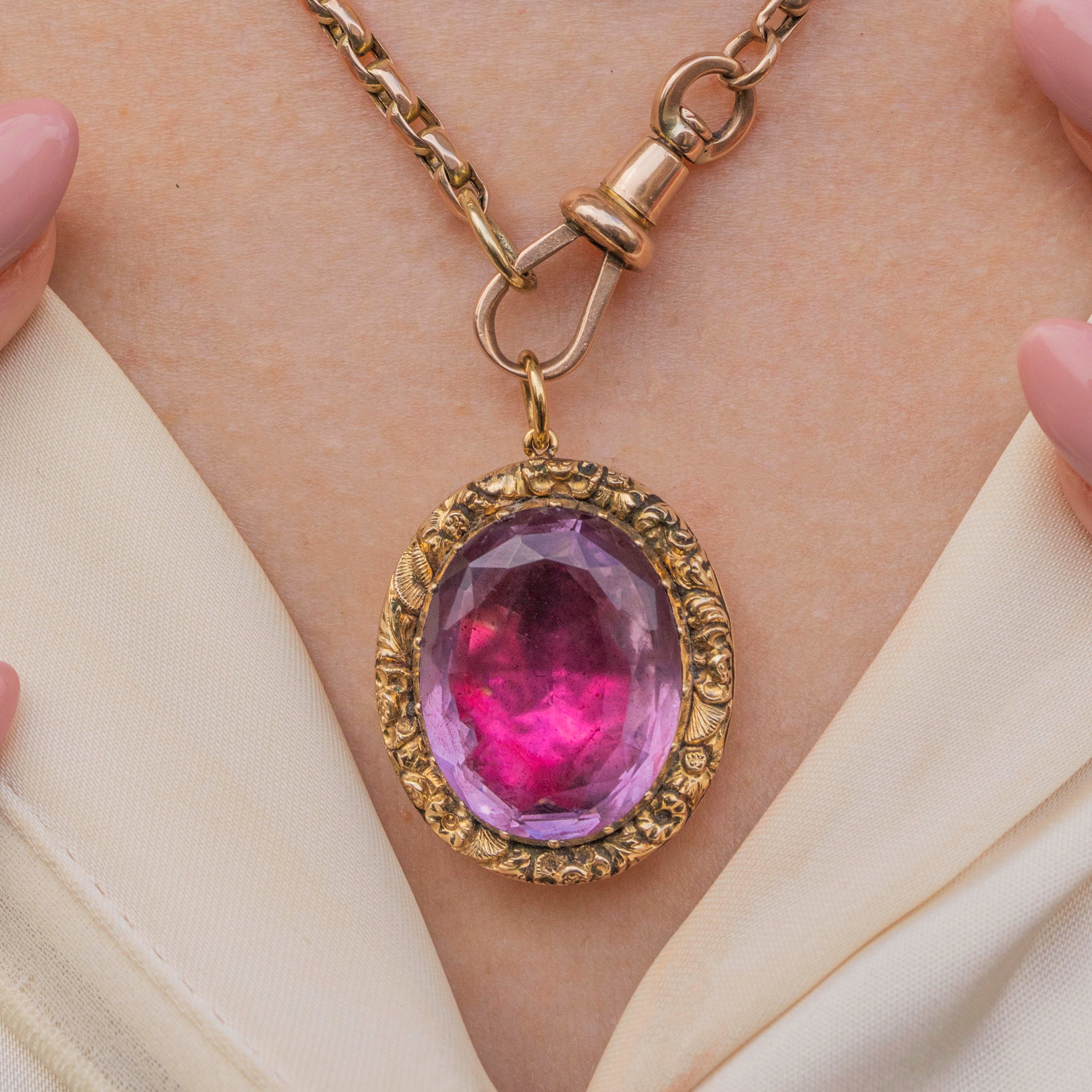 Add a pop of colourful charm to your collection with this stunning Georgian foiled Amethyst pendant! Her featured Amethyst is sure to turn heads, enhanced by the foil backing, to give the gemstone a luminous glowing quality, radiating lush fuchsia and lavender hues.