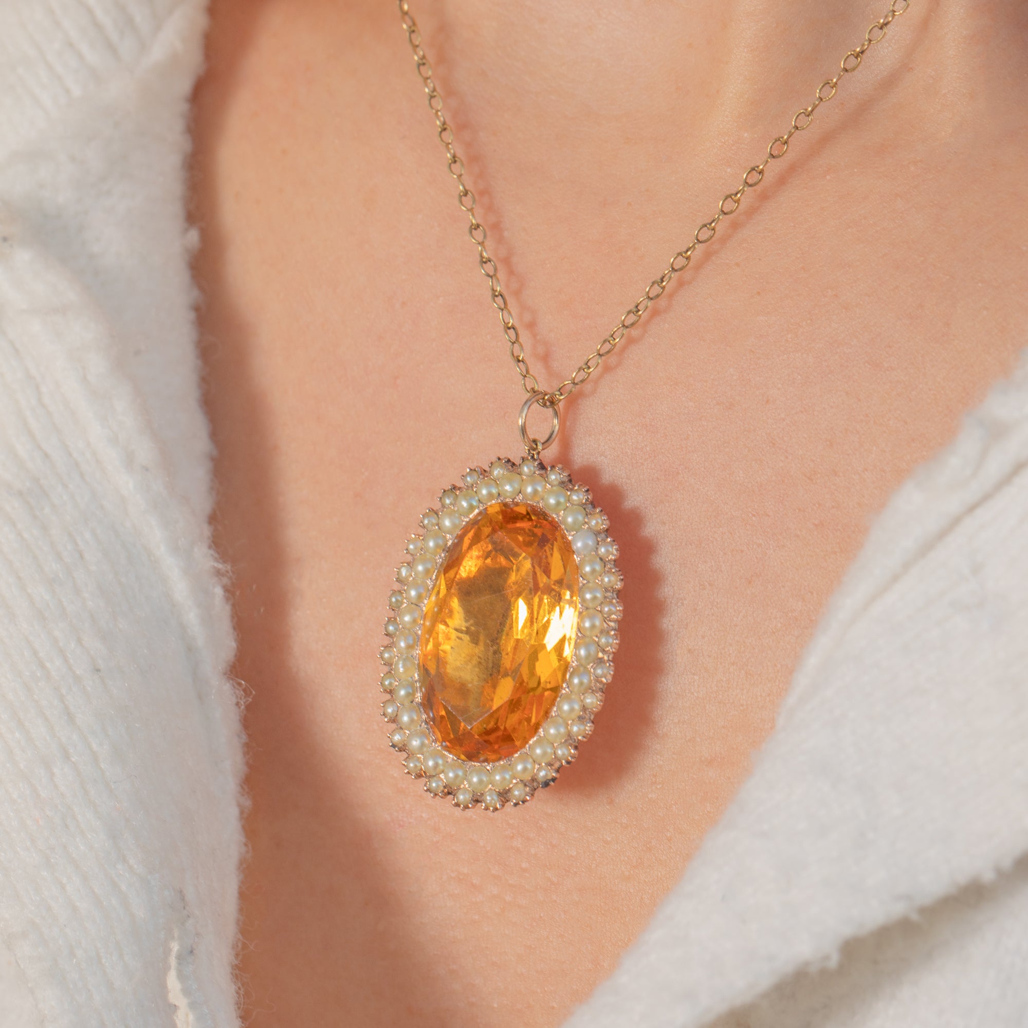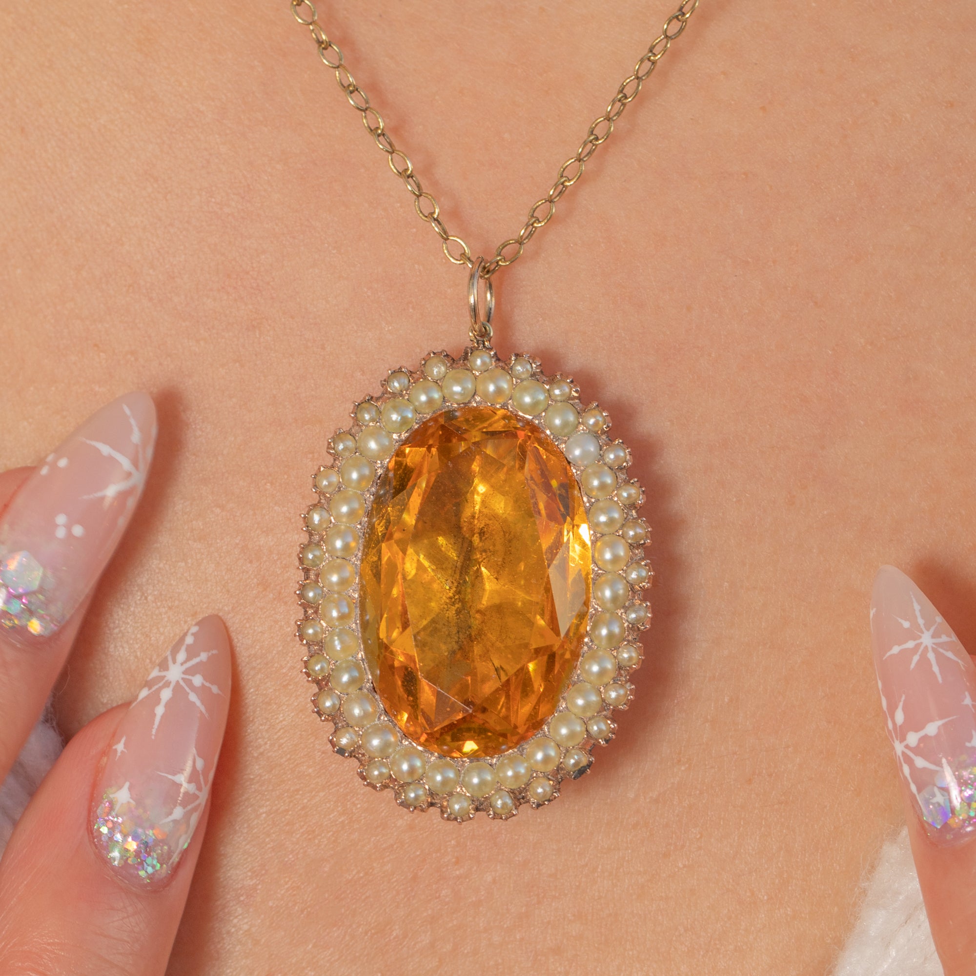 Glowing with Georgian romance, this statement pendant centres on a vivid foiled Citrine in a warm 15ct Gold collet, its honeyed fire intensified by the foil behind the stone. A close halo of graduating Pearls adds a soft, creamy lustre, while the scalloped perimeter brings an ornate yet refined flourish quintessential of the era.