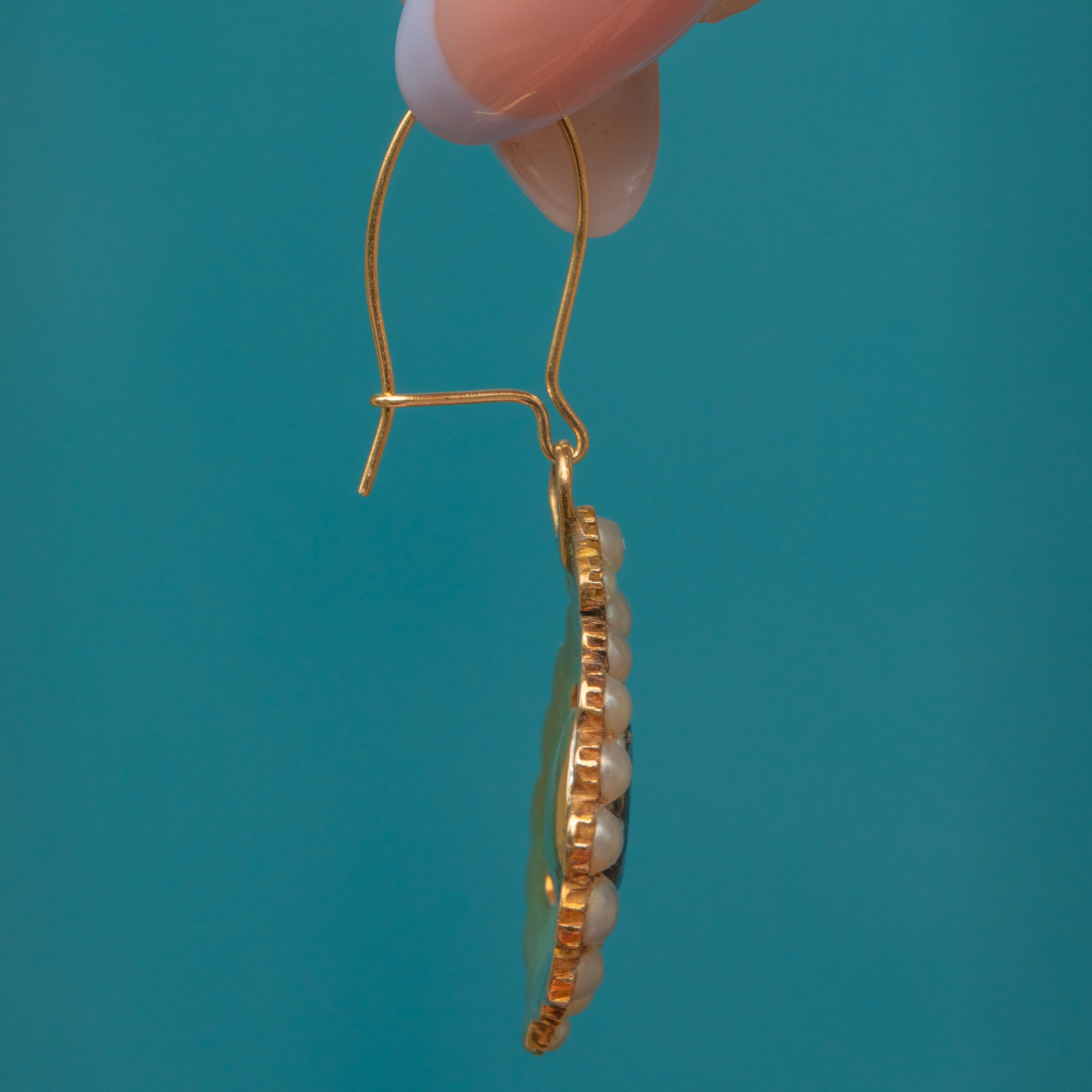 VERY GOOD-EXCELLENT: These Georgian 15ct Gold Garnet Pearl cluster drop earrings are in great condition. Each gemstone is radiant and set securely, with a gorgeous sheen. There is some patches of discolouration to the back of the earrings, though this is expected with age and cannot be seen when wearing. With secure hooks, these Georgian earrings can be worn with utmost confidence.