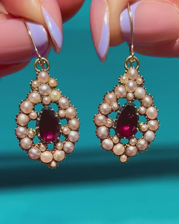 These Georgian 15ct Gold Garnet Pearl cluster drop earrings radiate antique charm!