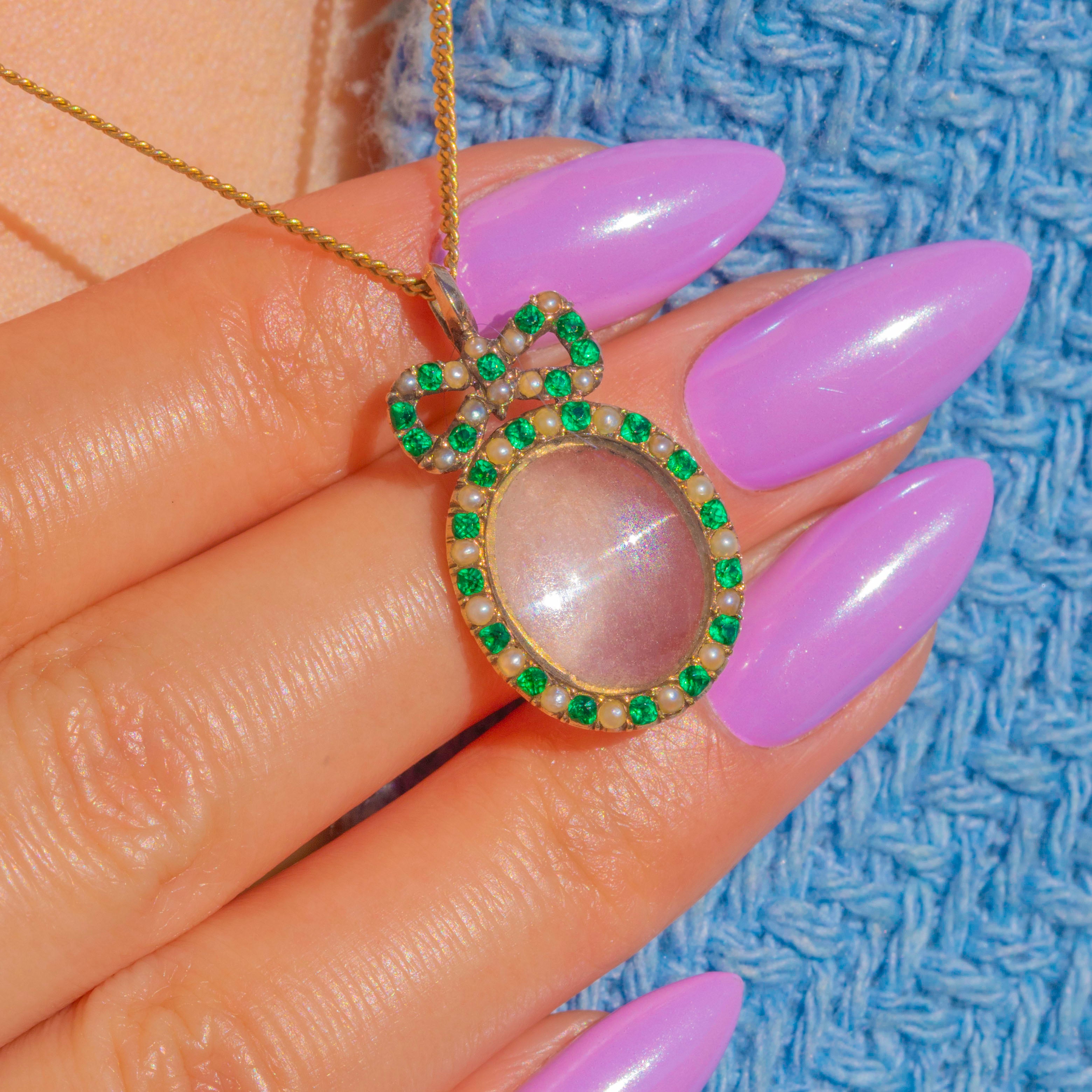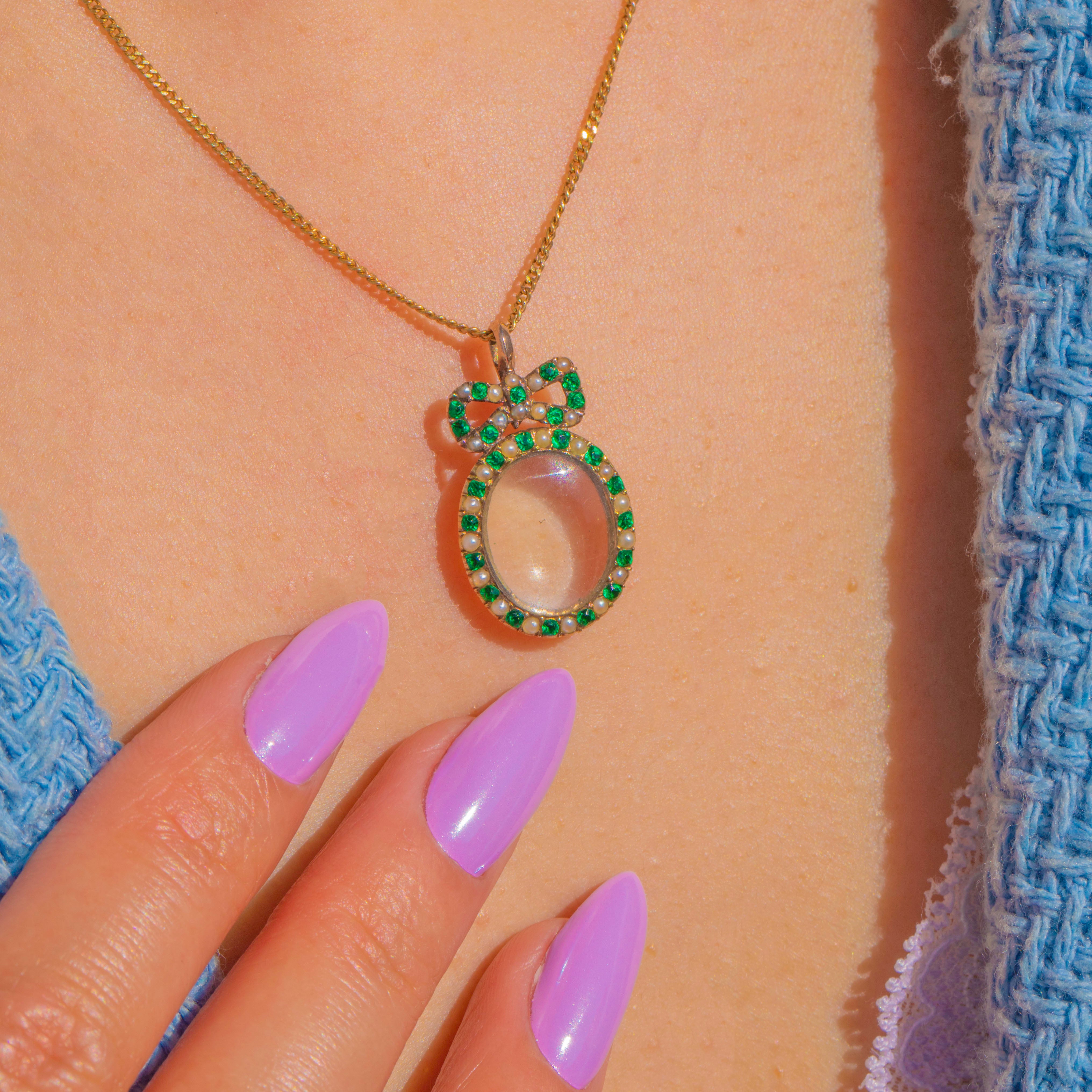 Brimming with Georgian romance, this delicate locket features a feminine bow surmount set with luminous Pearls and vivid Green Paste. Crafted in buttery 15ct Gold, the charming bow sits above an oval locket framed by alternating flashes of bright green and creamy lustre for a graceful garland effect.