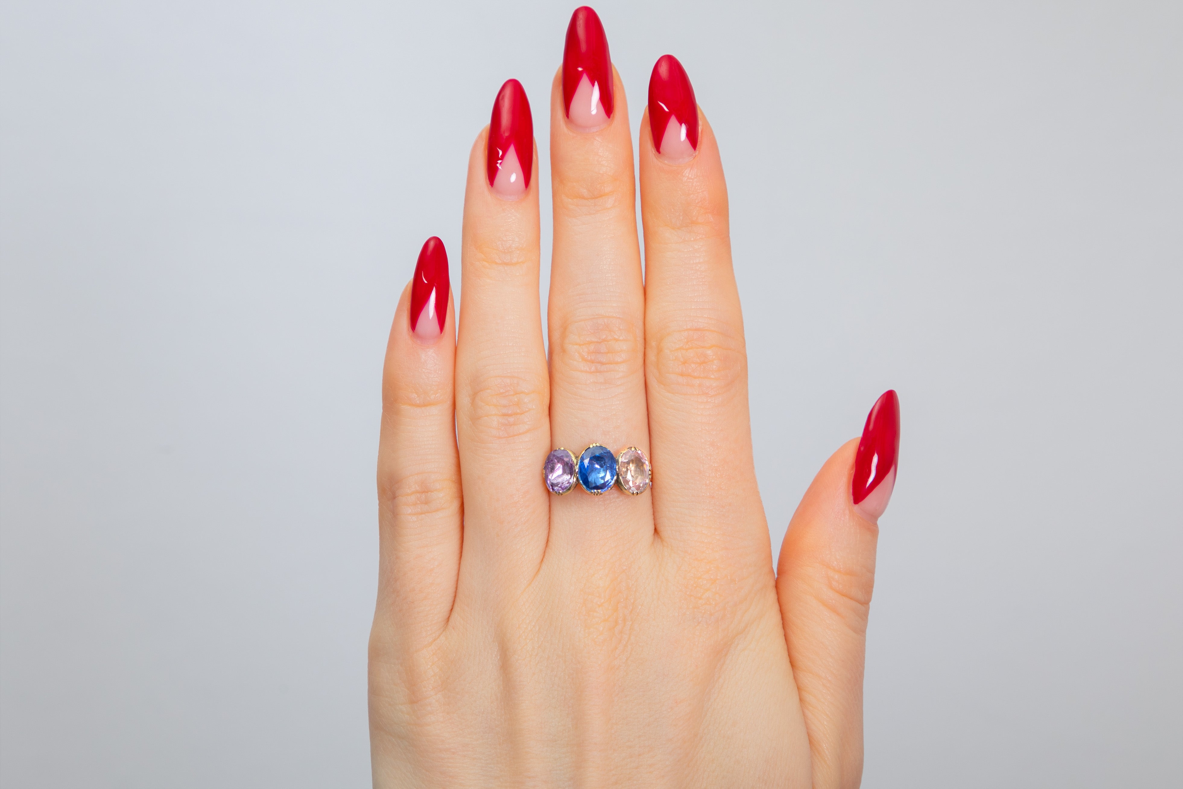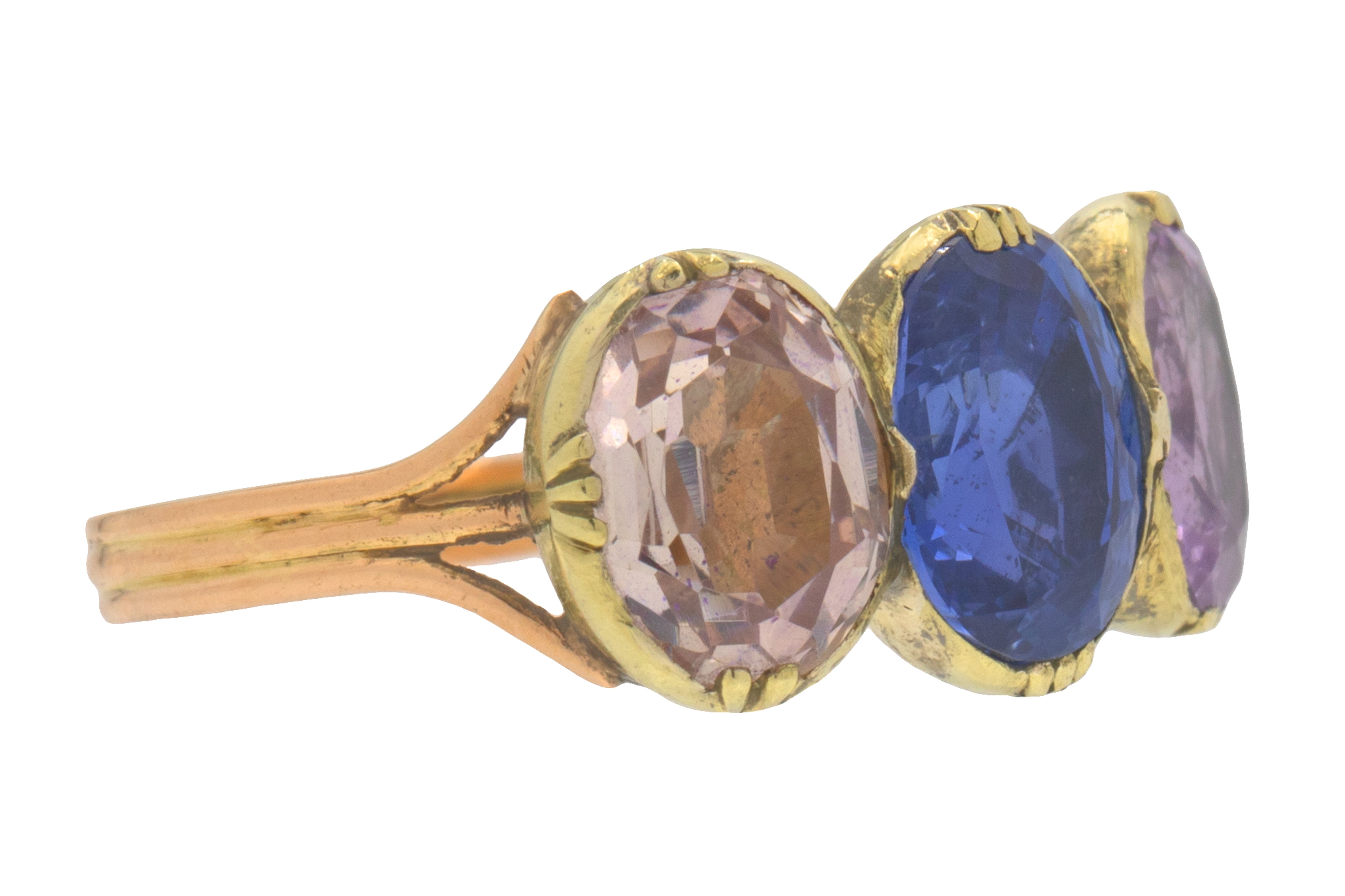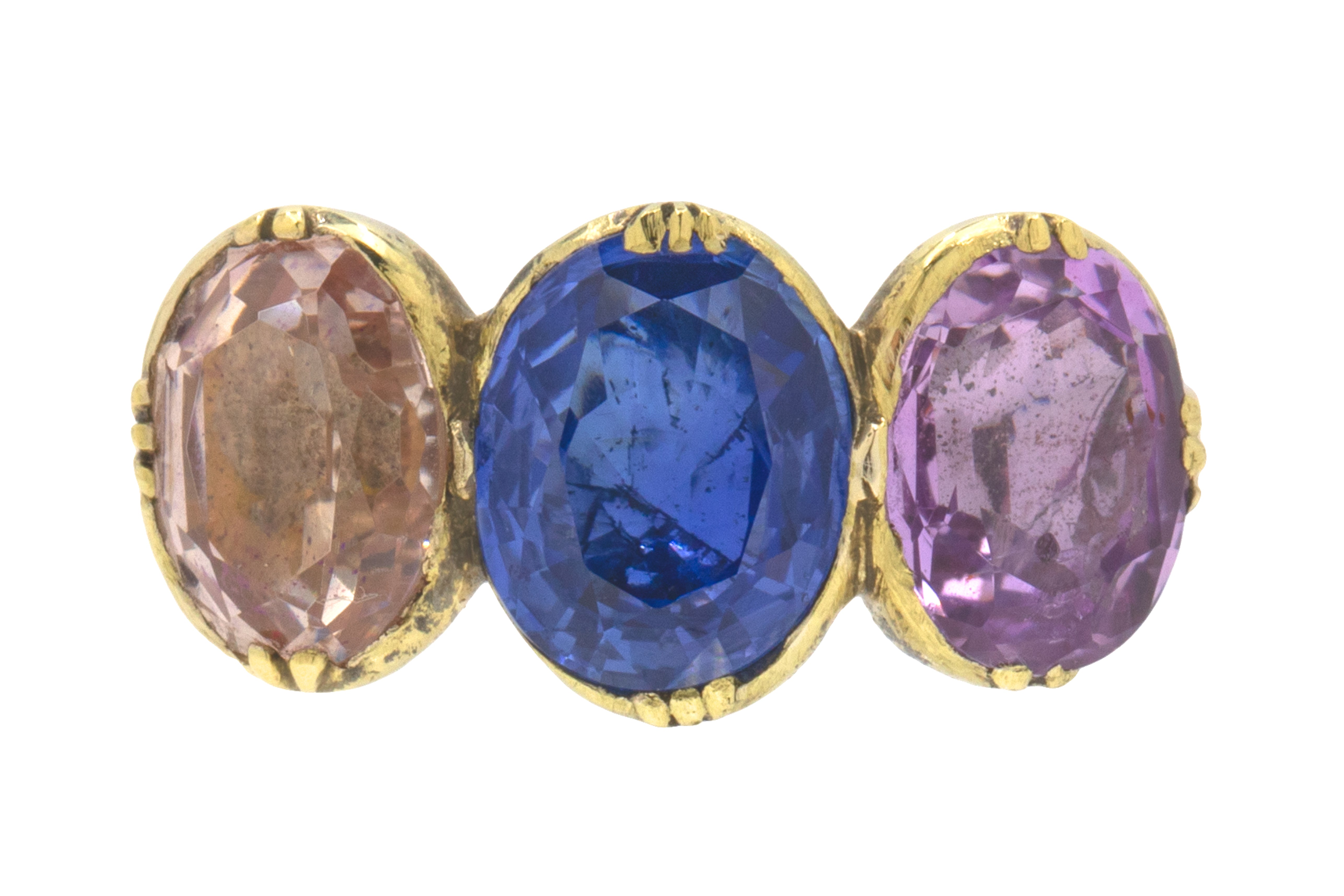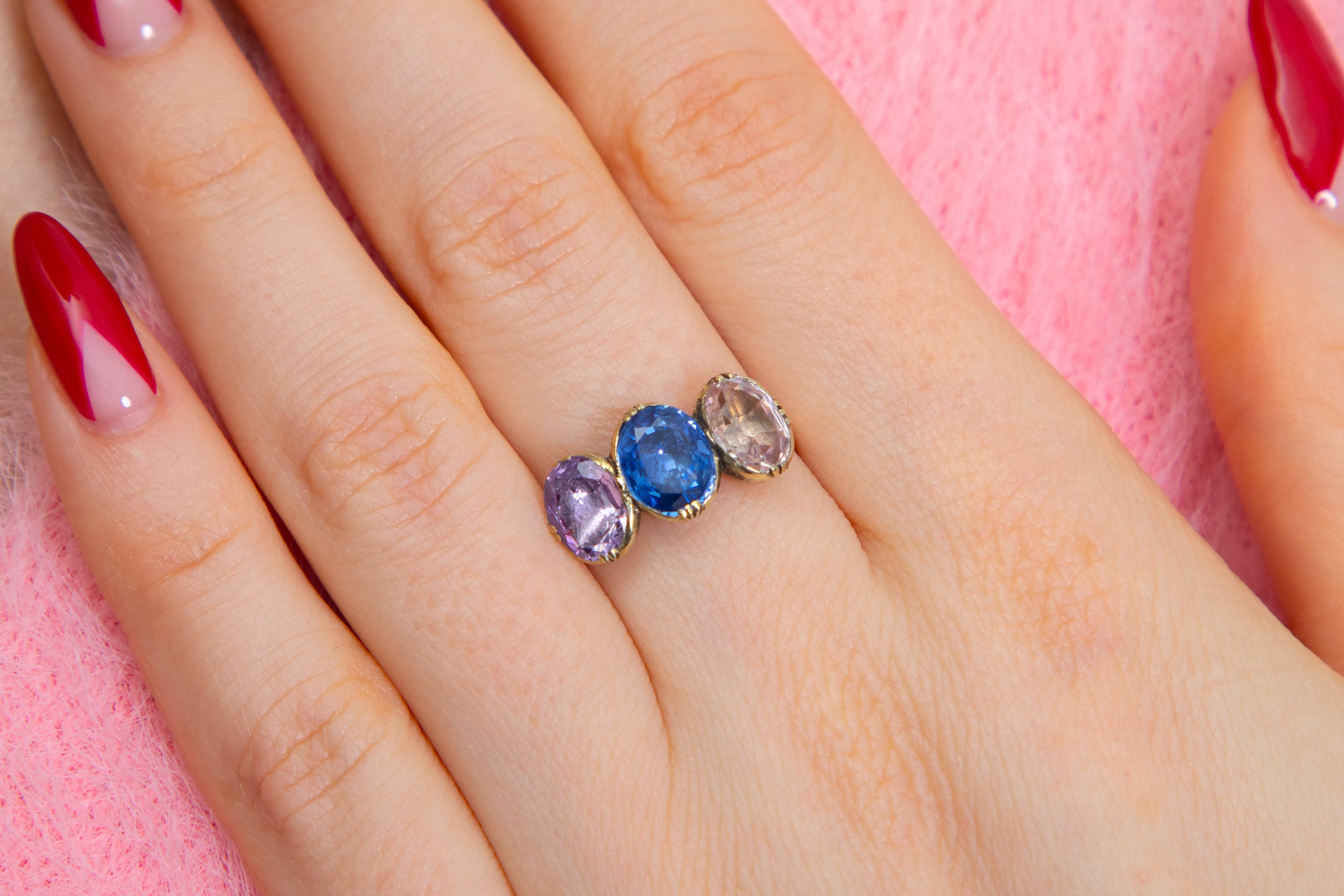 Prepare to be wowed by this Georgian 15ct Gold Sapphire trilogy ring! The large natural Blue Sapphire the focal point of this exquisite piece, flanked by an angelic pink Sapphire and a Padparadscha Sapphire, adding a peachy pop!