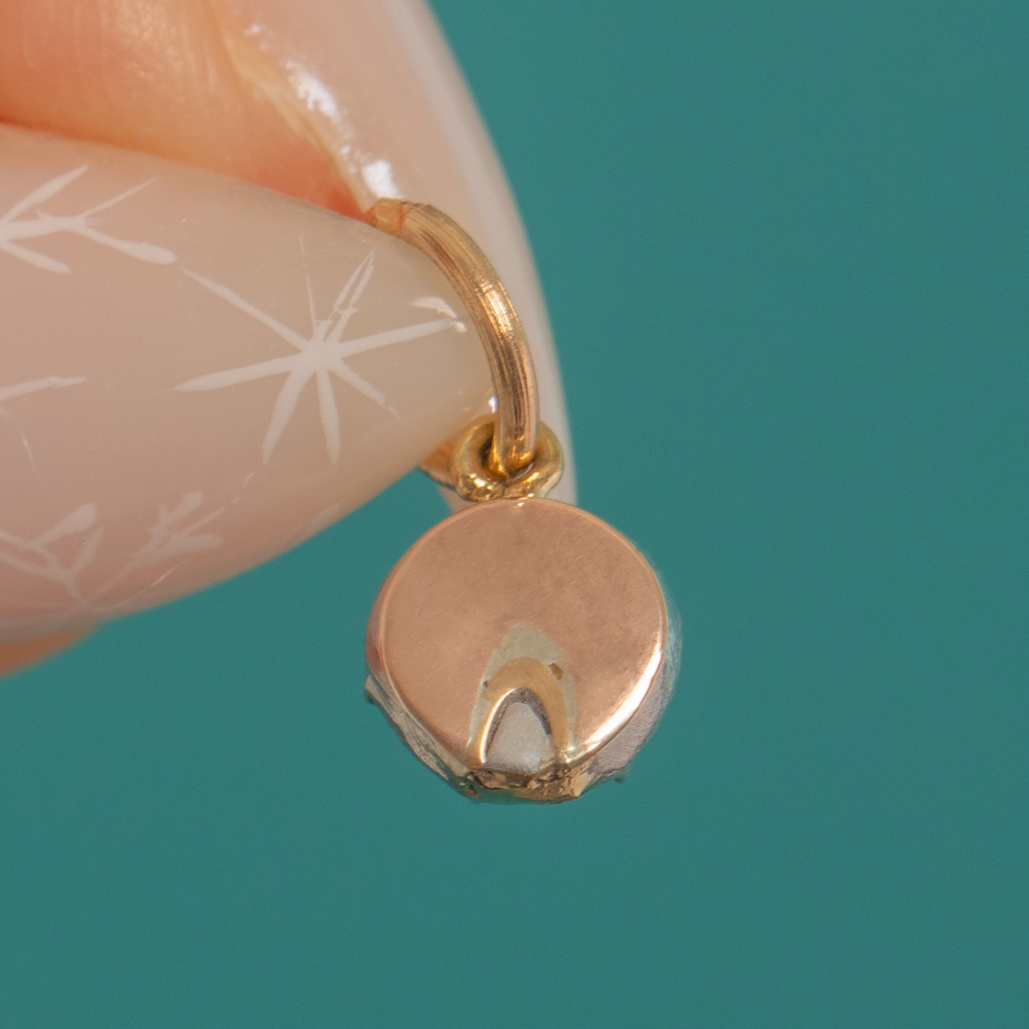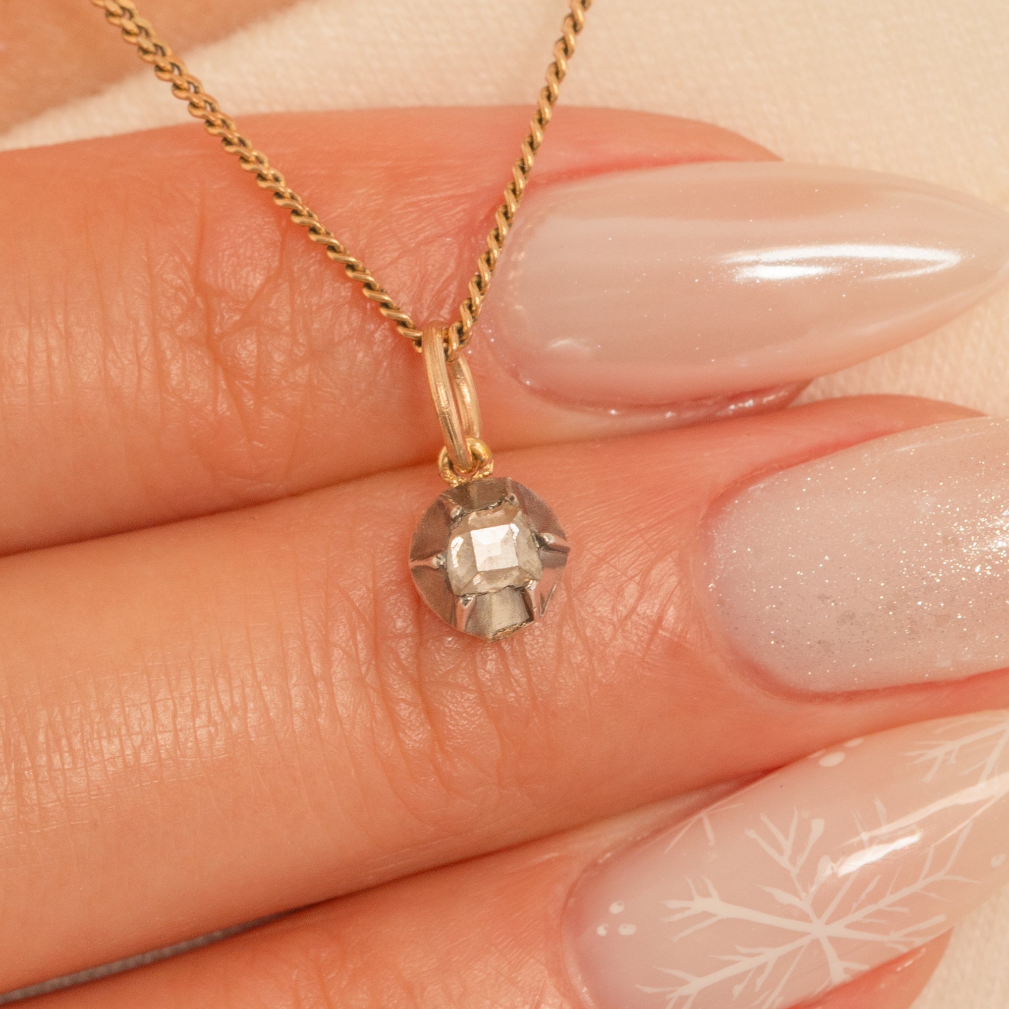 Delicate and steeped in history, this petite Georgian charm showcases a rare 16th/17th Century table-cut Diamond of approximately 0.10ct. The old table-cut’s quiet, glassy glow sits within a starry buttercup-style collet, giving that quintessential antique sparkle in a refined, minimalist silhouette.