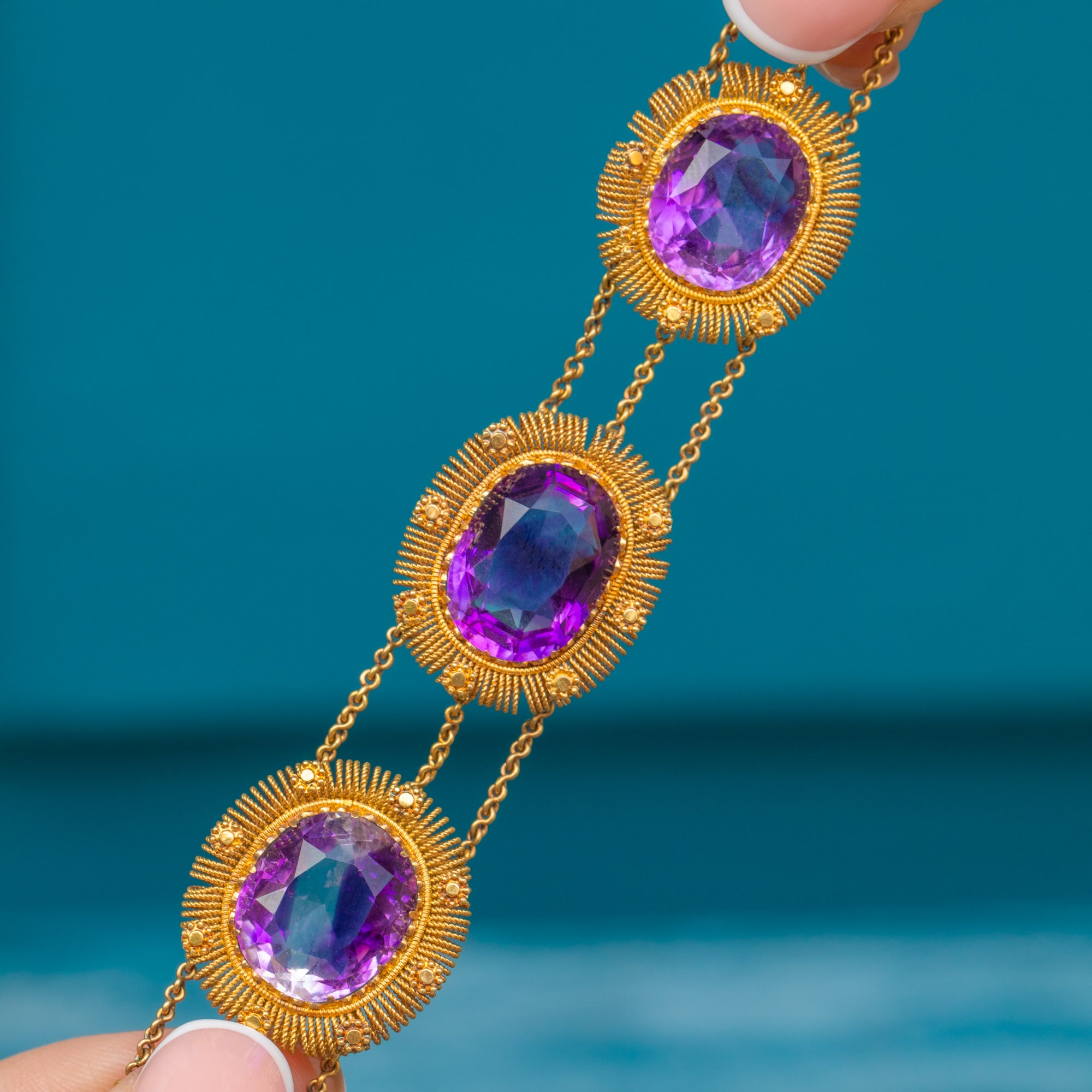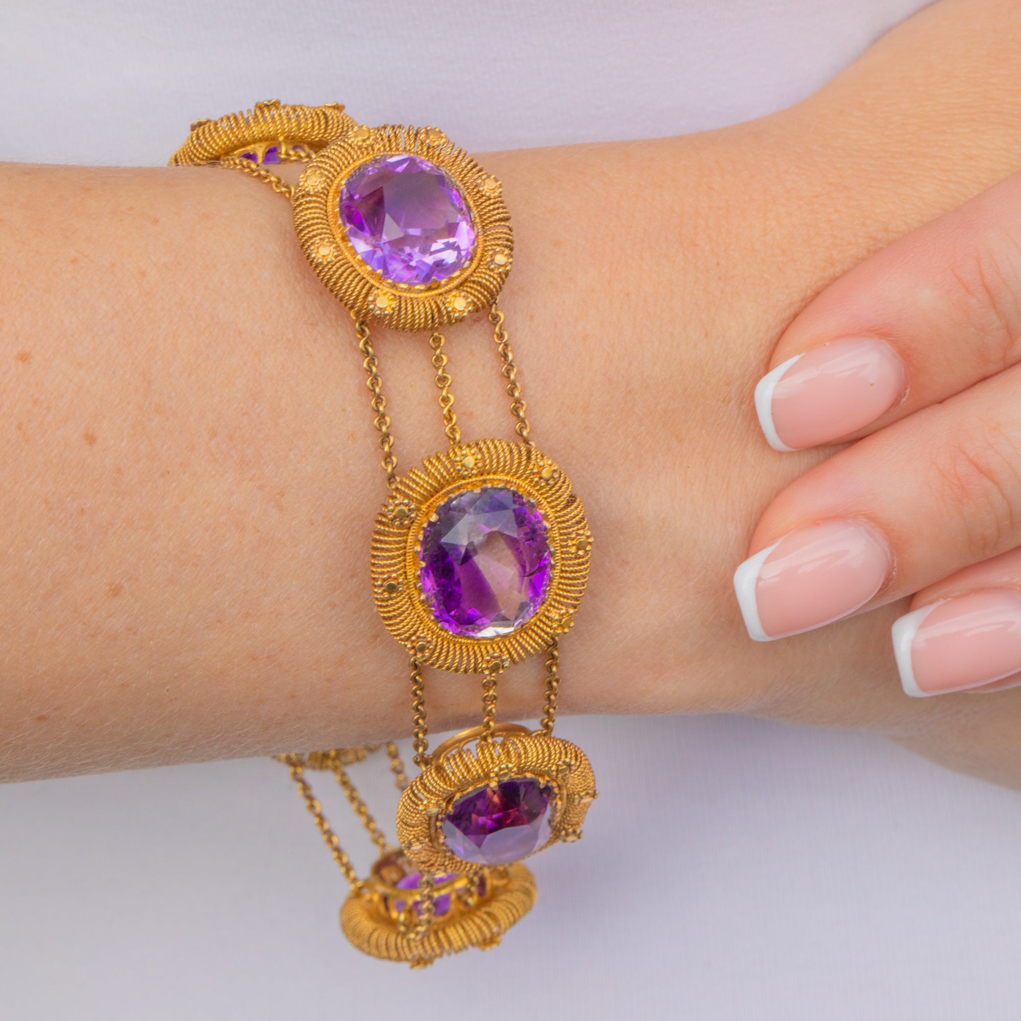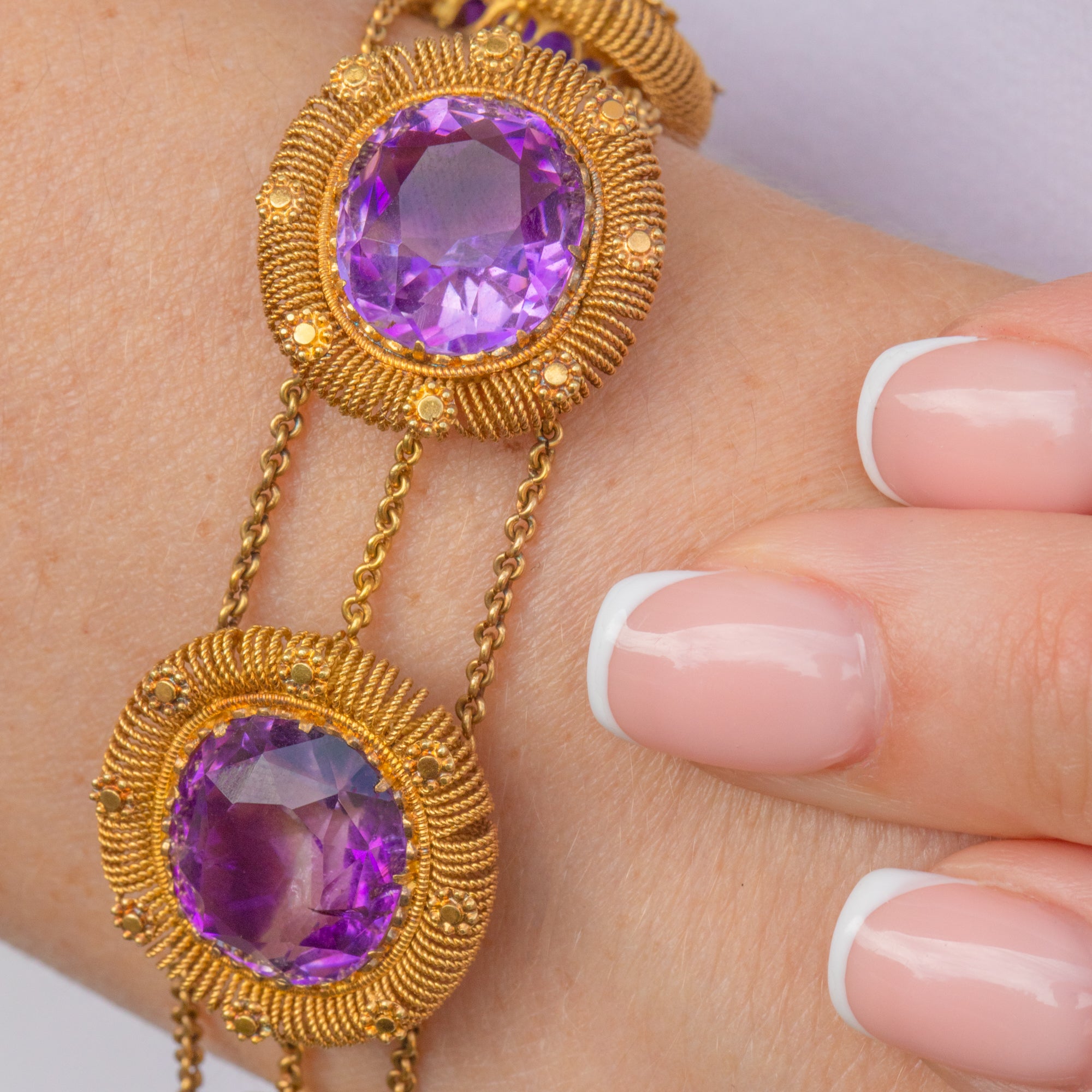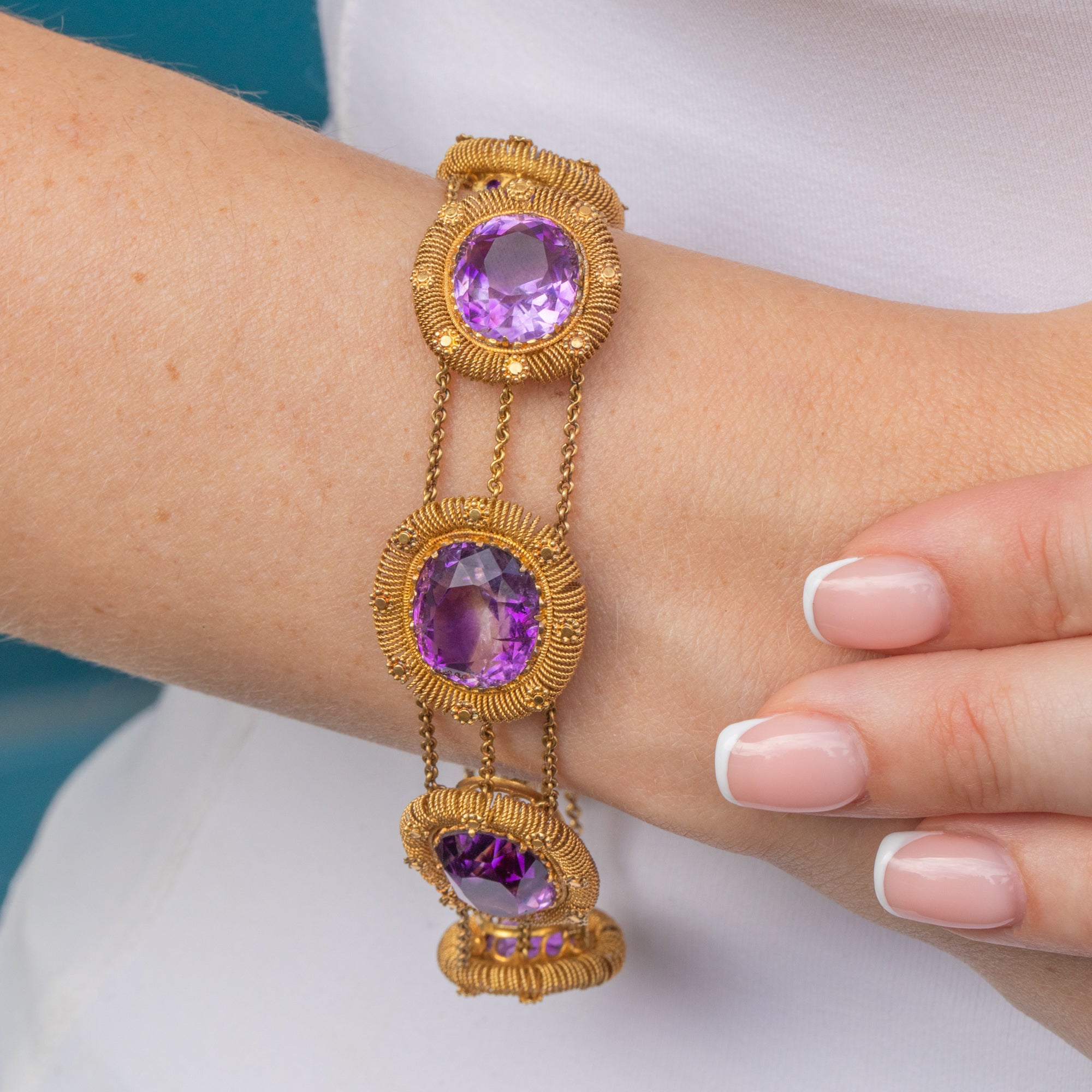 VERY GOOD. This Georgian 18ct Gold Amethyst Cannetille star bracelet is in superb condition. The Amethysts are securely set within their Gold settings and are all well colour-matched, despite there being a slight natural variation between the stones and within the stones themselves: a true testament to Mother Nature! Although a few stars are missing on her Cannetille detailing, four on her third gemstone away from the clasp and one on her central gemstone, this is only subtle and hardly affects the overall impact of the piece when worn. Her clasp is in perfect working condition, closing with a satisfying click. All in all, a wonderful historic piece for your jewellery collection!