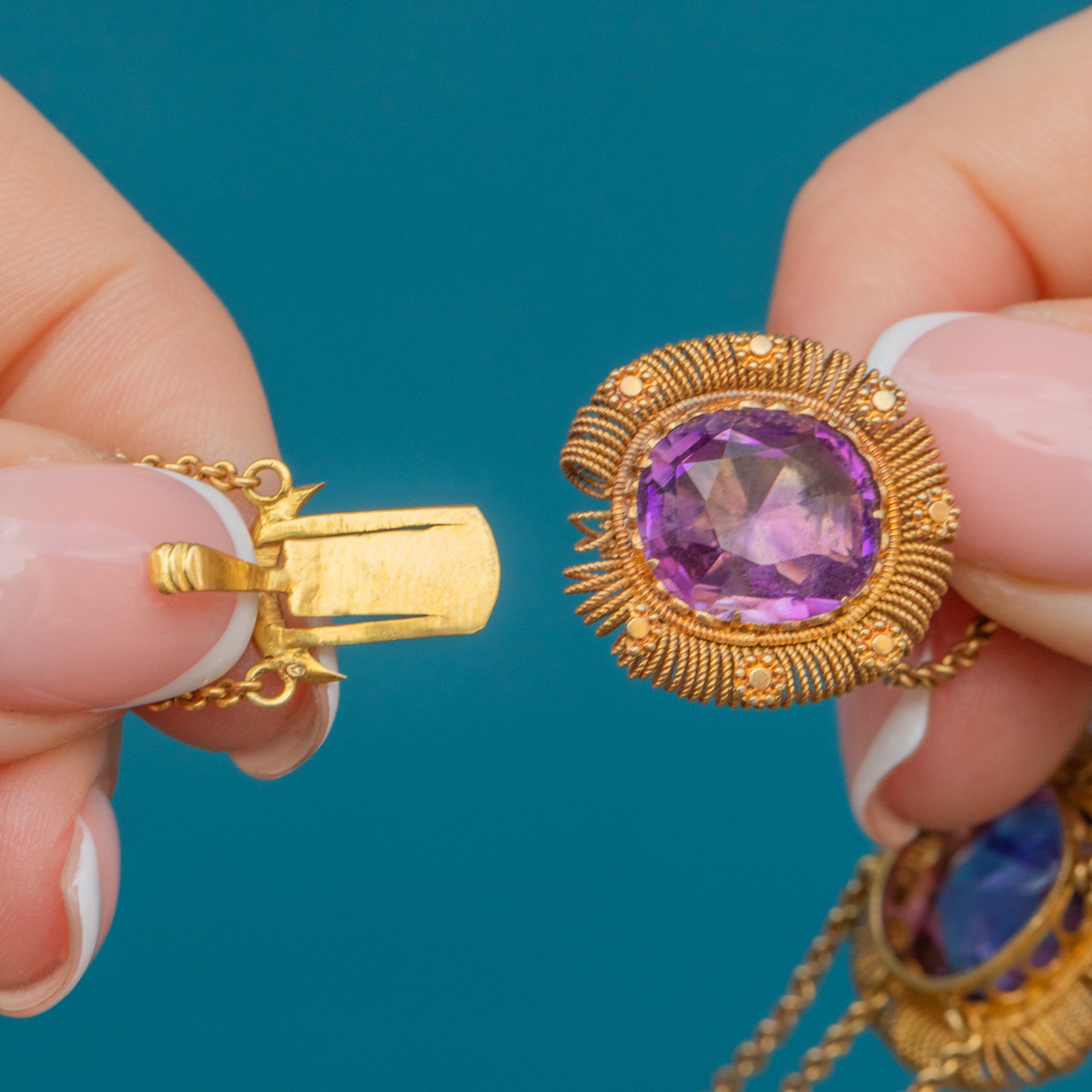 We are delighted to present this lavish Georgian 18ct Gold Amethyst Cannetille stars bracelet, it is undoubtedly one of the most exquisite pieces we have ever had the opportunity to present here at Lillicoco! Steeped in history, this magnificent Georgian bracelet boasts seven juicy Amethysts with a whopping combined weight of 31.15ct.