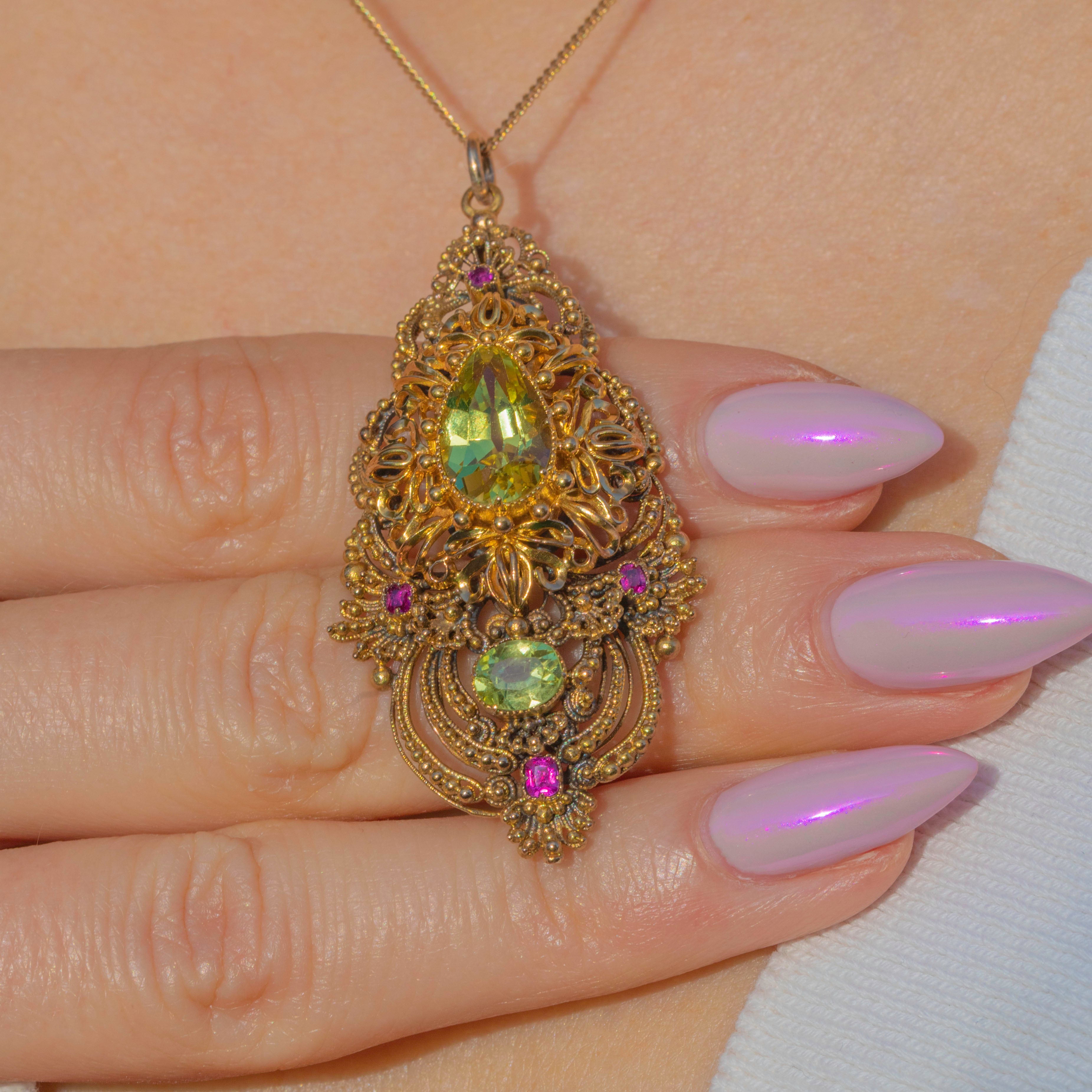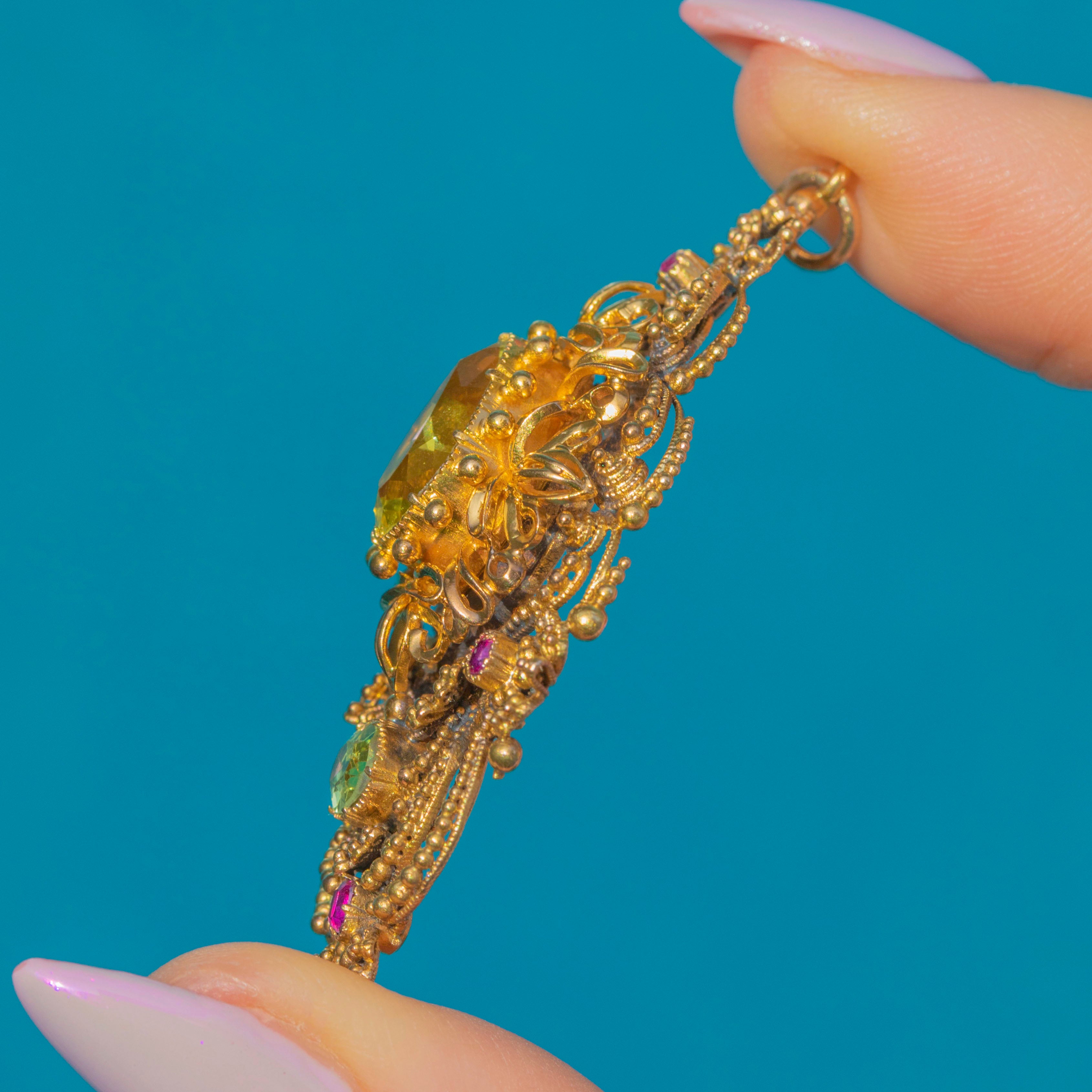 EXCELLENT: The Chrysoberyls are bright and securely set, and the Rubies are lively and intact. The 18ct Gold cannetille work is crisp with superb definition, showing only gentle age-commensurate wear and no repairs.