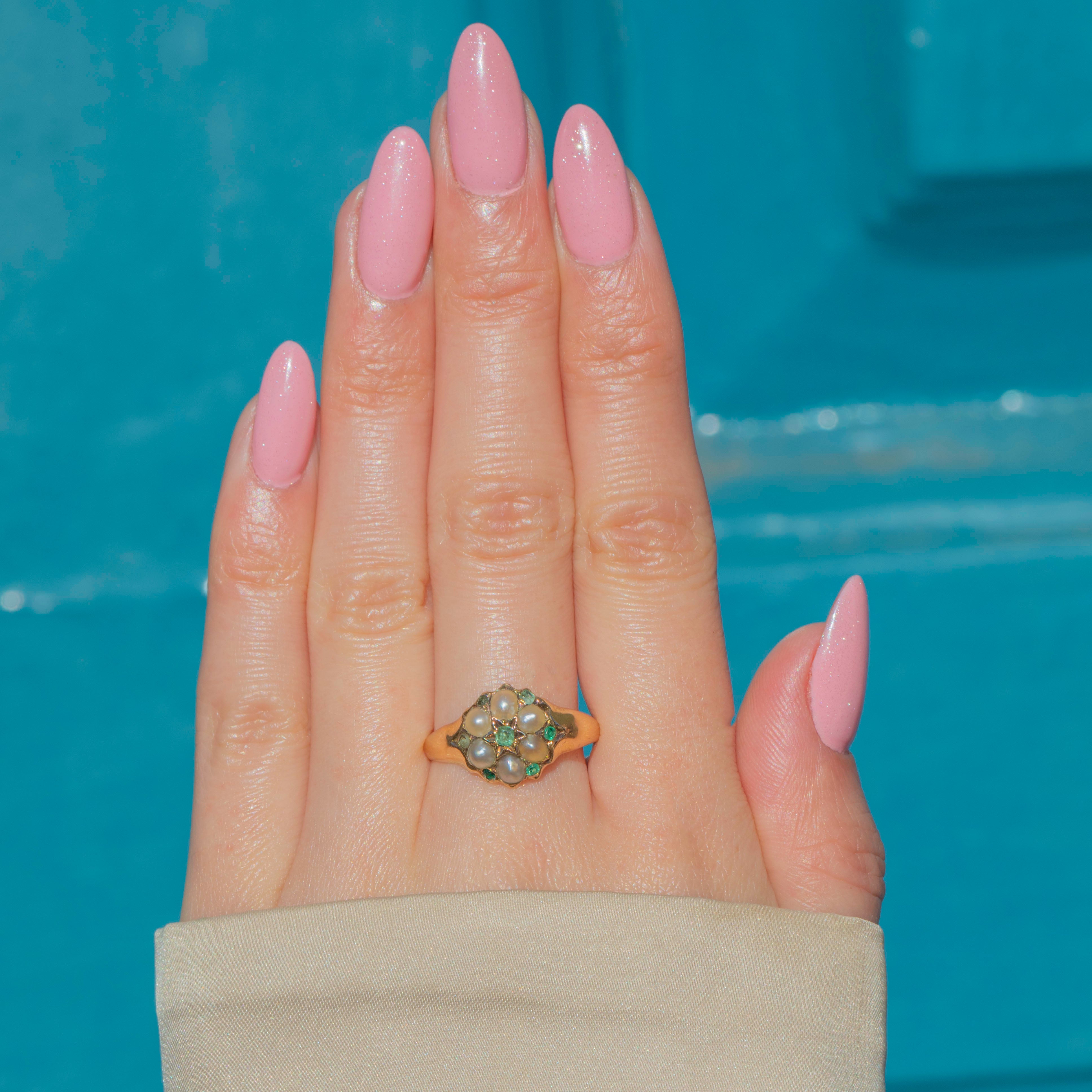 Comprised of six plump Pearls intertwined with seven radiant sage Emeralds, this Georgian cluster ring dazzles from every angle. Her buttery 18ct star settings give her an added celestial charm, with the glossy warmth of her Gold complementing the soft pastel gemstones.