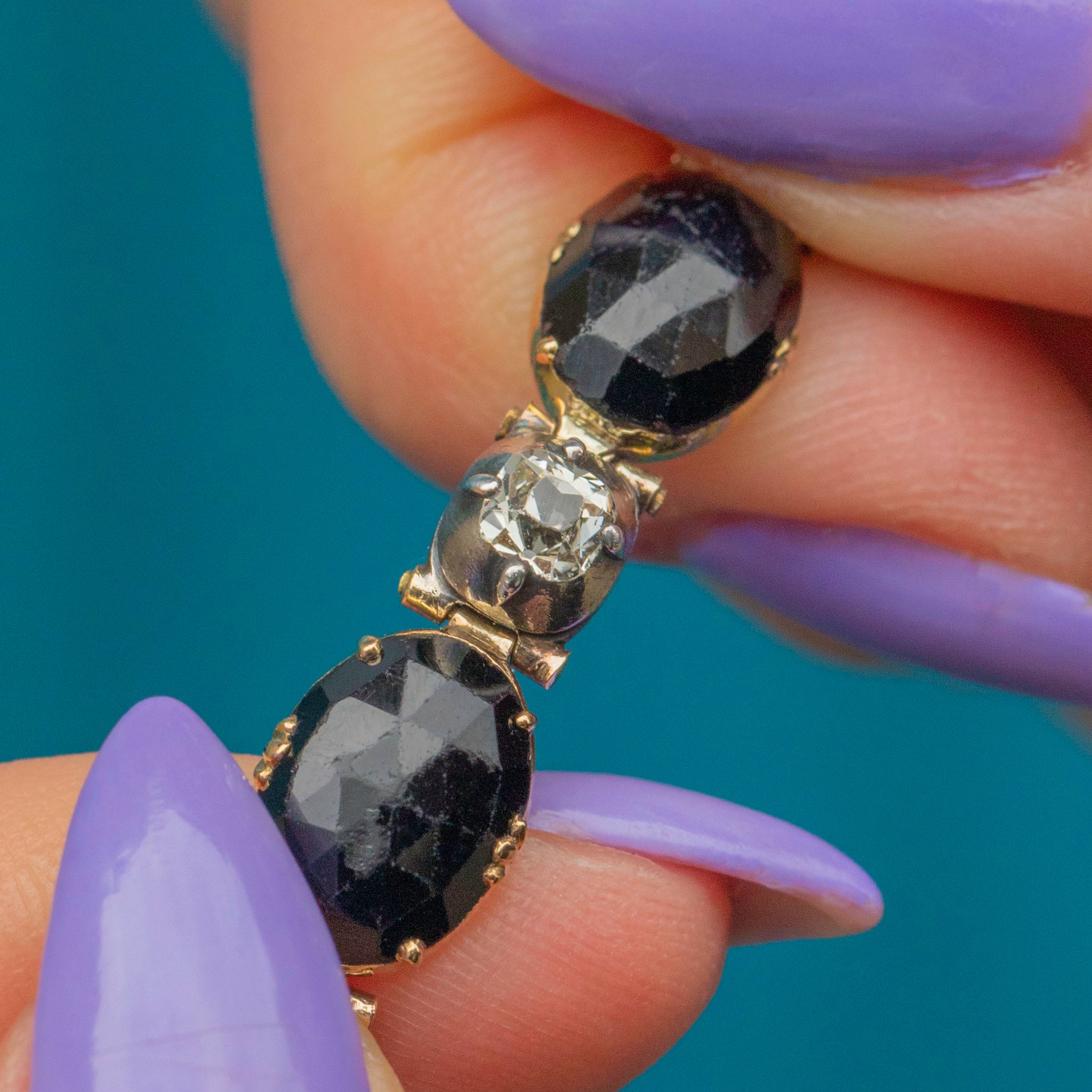 VERY GOOD: This stunning Georgian 18ct Gold French Jet bracelet is in very good condition. The gemstones are all present and securely set, with only some minor fleabites commensurate with age. The Gold is bright and buttery, and the Silver is lustrous with a light patina accrued over the years, adding to its antique charm. With each link securely connected and the clasp in fine working condition, you can wear this Georgian bracelet with absolute confidence!