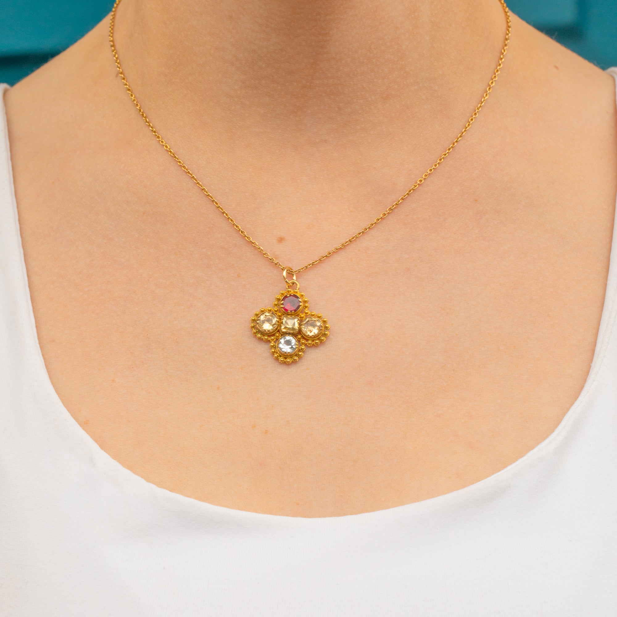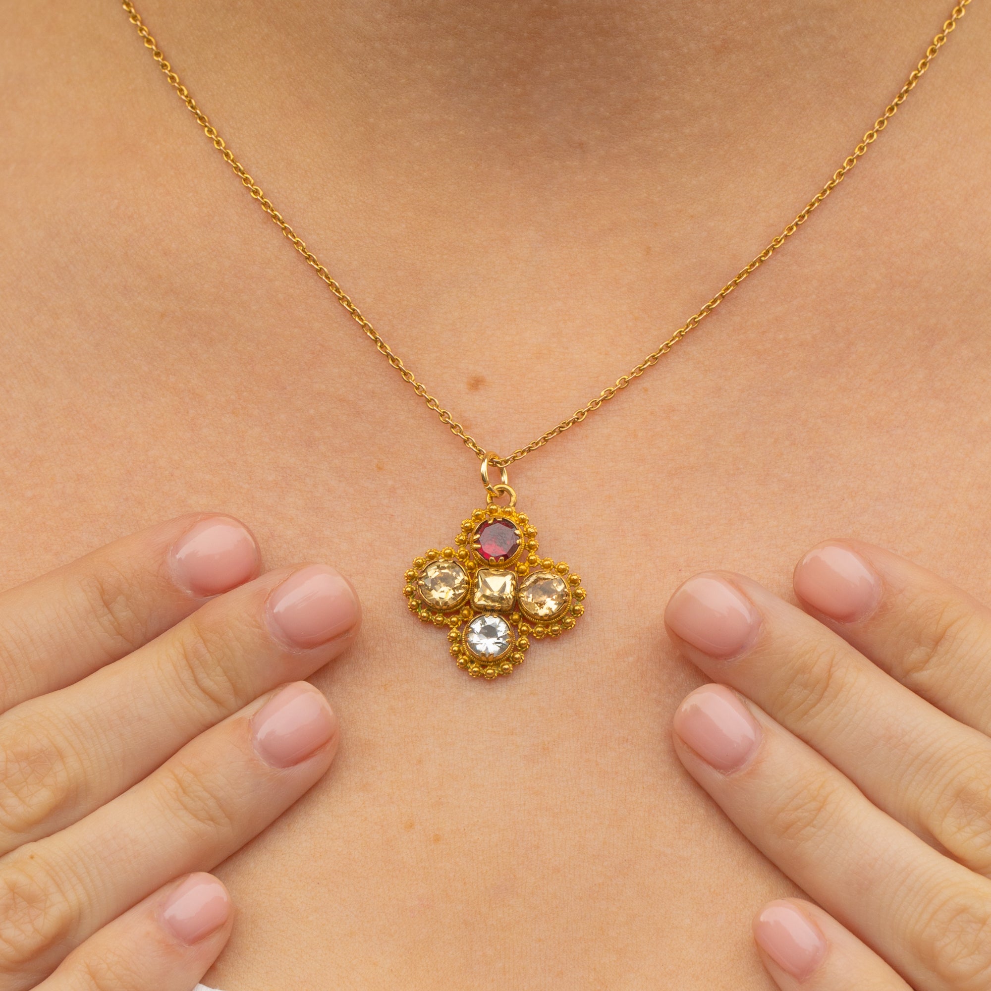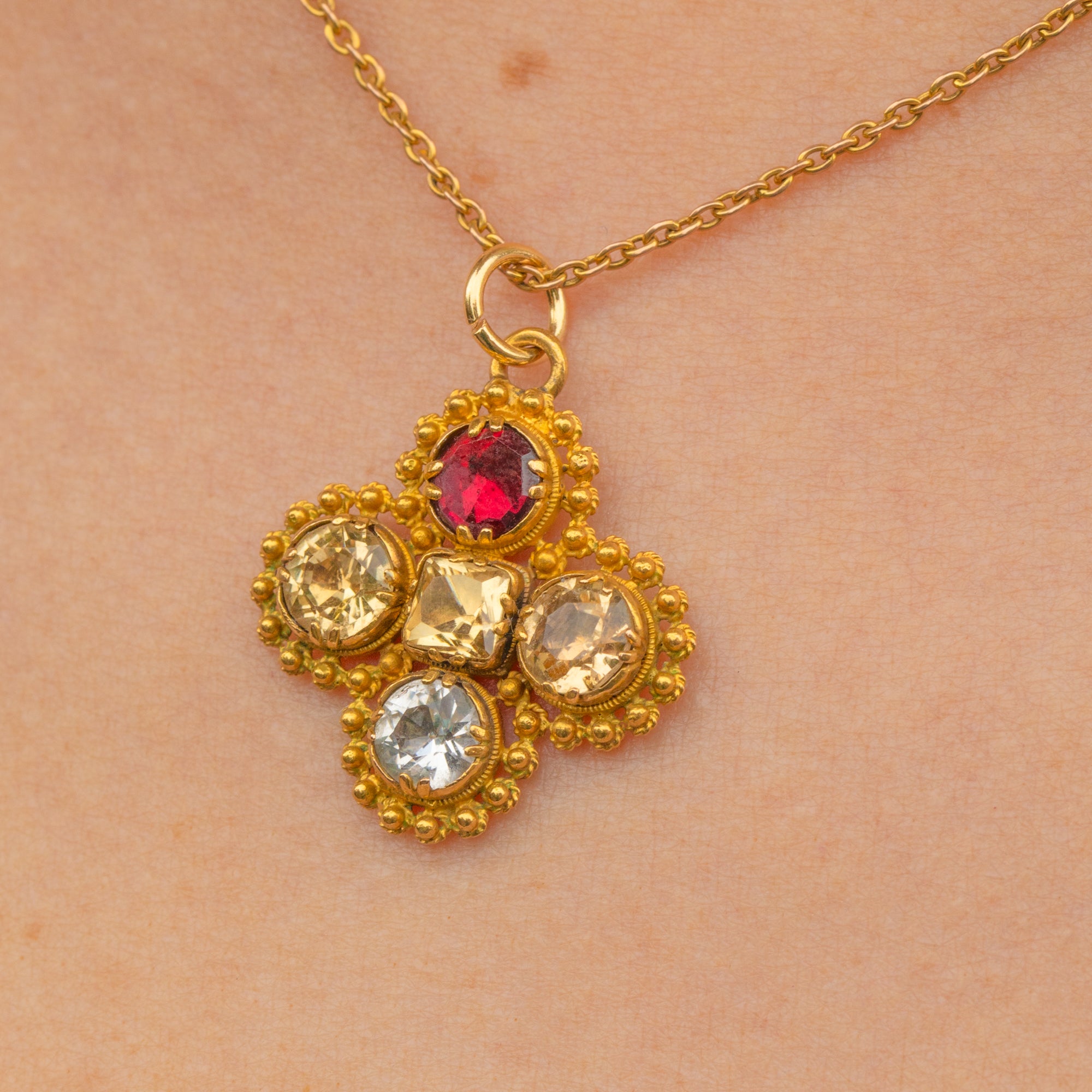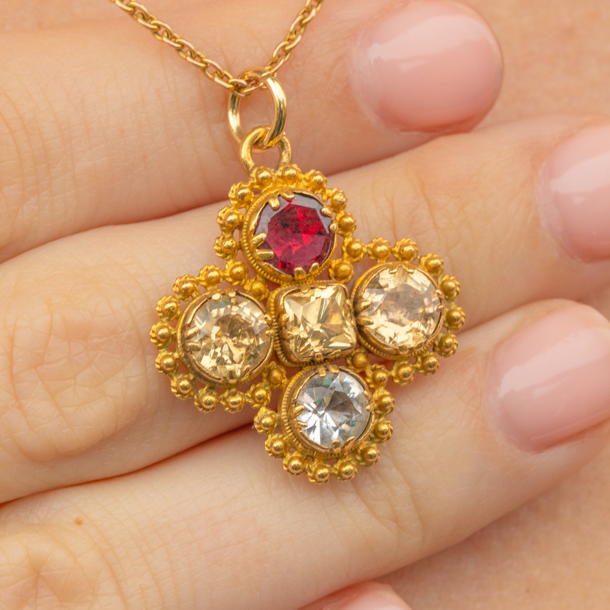 EXCELLENT. This Georgian 18ct Gold Garnet & Topaz harlequin pendant is in excellent condition. The gemstones rest securely in their settings, claws holding them in place. The back of the piece is smooth, and has likely been converted from a brooch, with only little sign of this conversion. The box allows you to keep this treasure safe and sound for the rest of time.