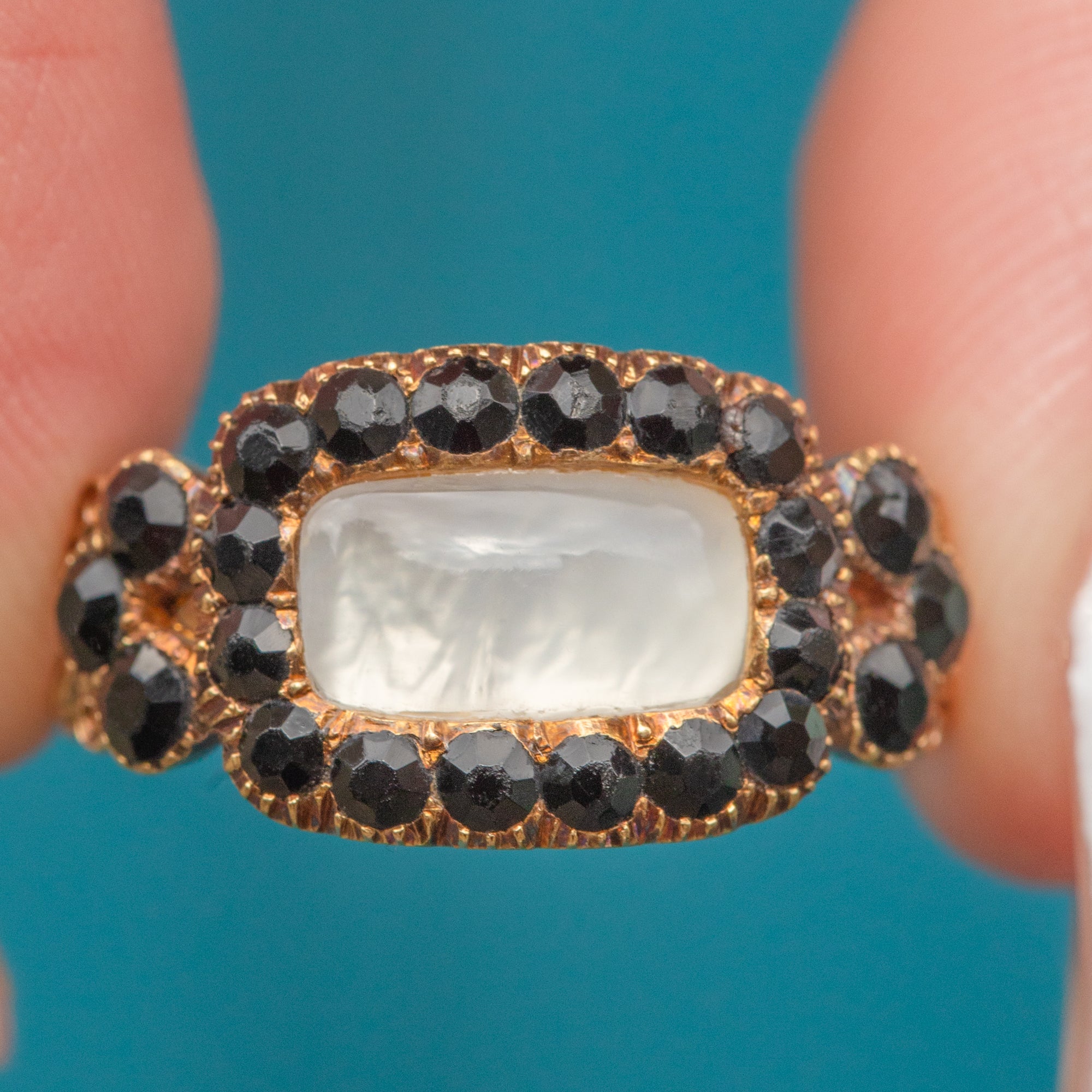 Georgian 18ct Gold Moonstone Jet Mourning Ring, c.1829