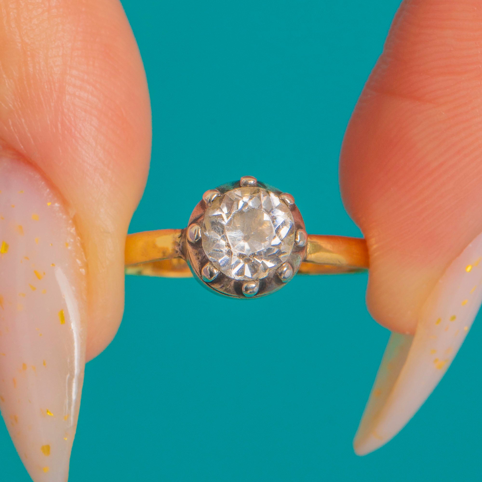 A delicate Georgian solitaire ring with all the charm of the era. Crafted in 18ct Gold with a Silver, piecrust setting, it holds a single Diamond Paste of domed, rose-cut character. The closed-back, crown-like head lends a soft glow to the stone and a refined, buttercup silhouette.