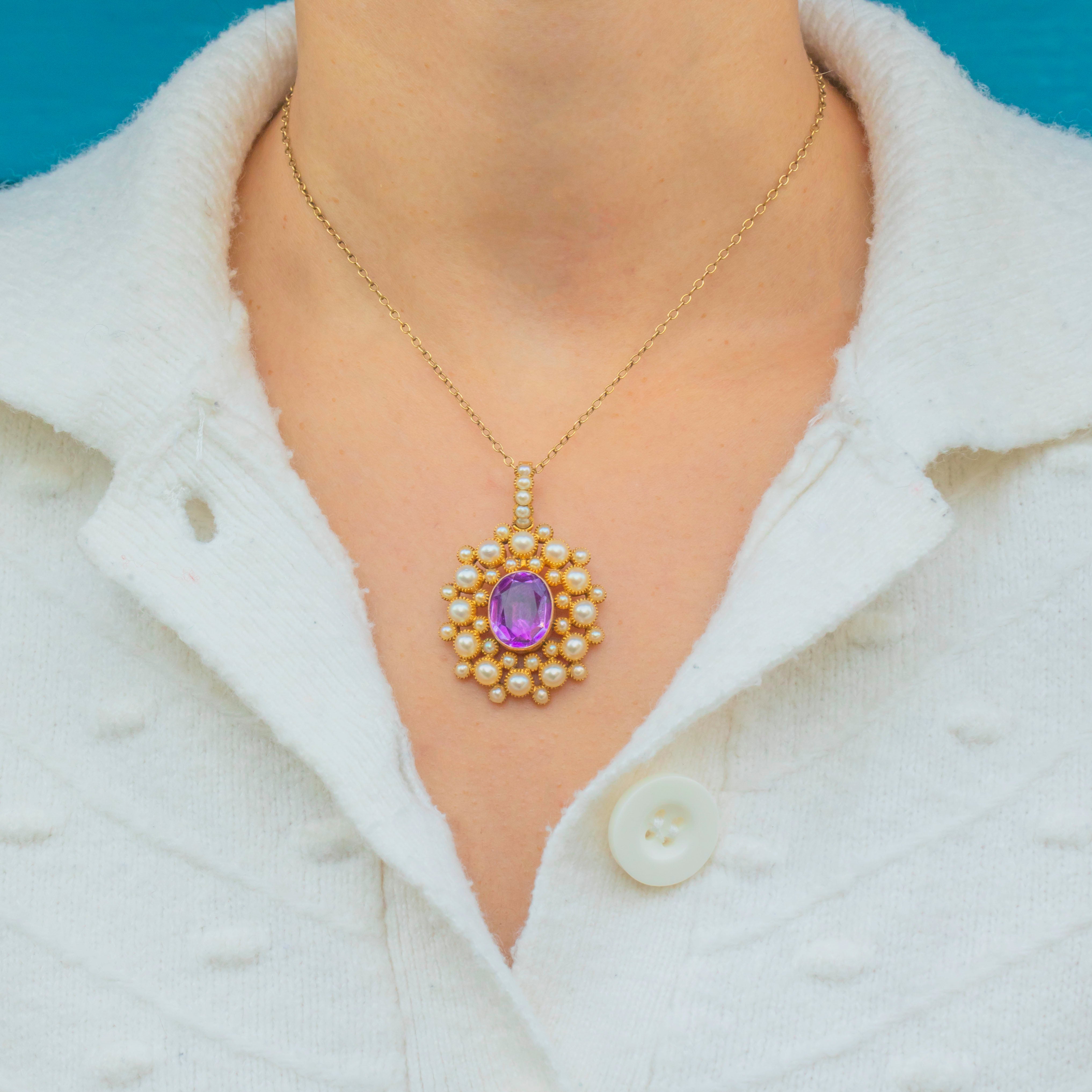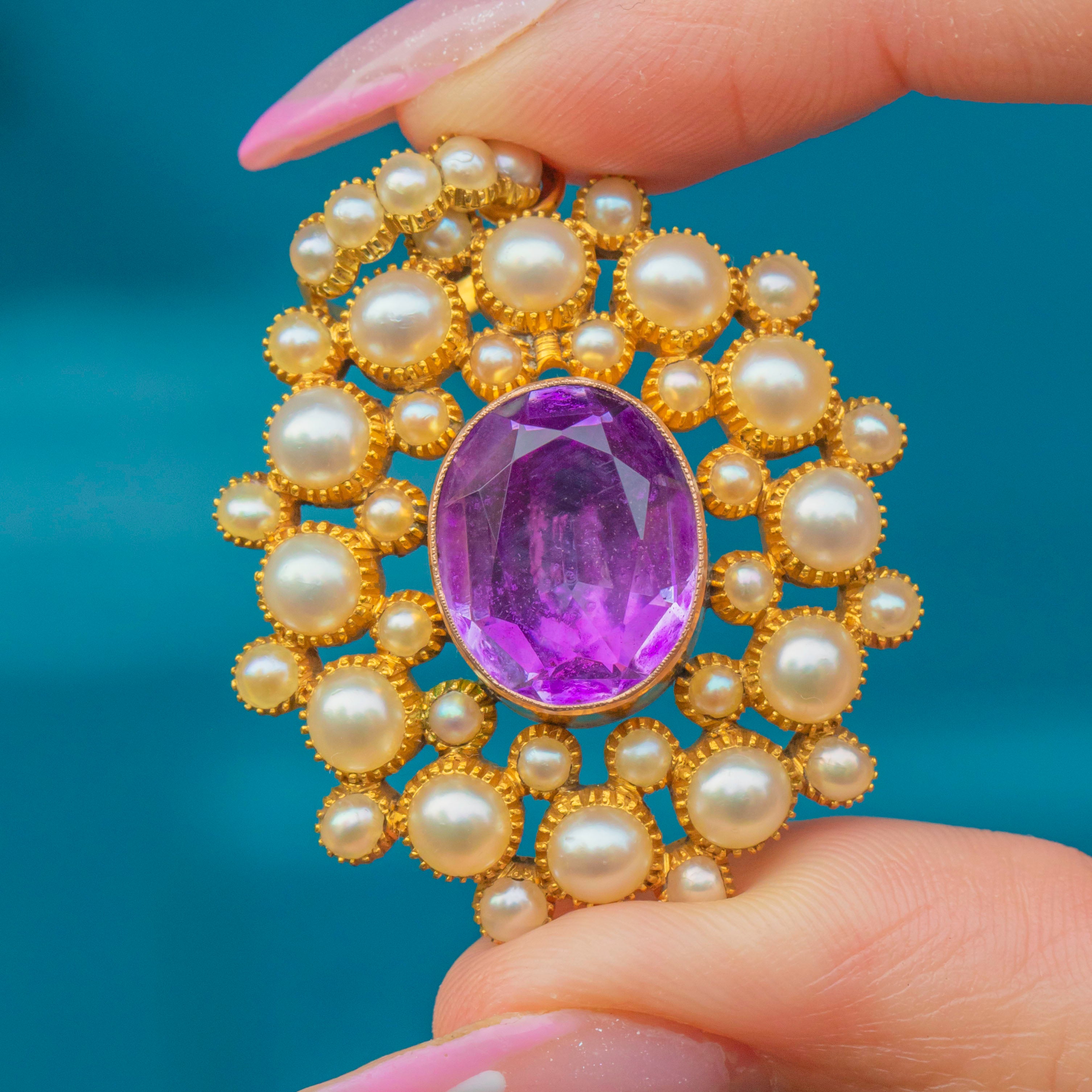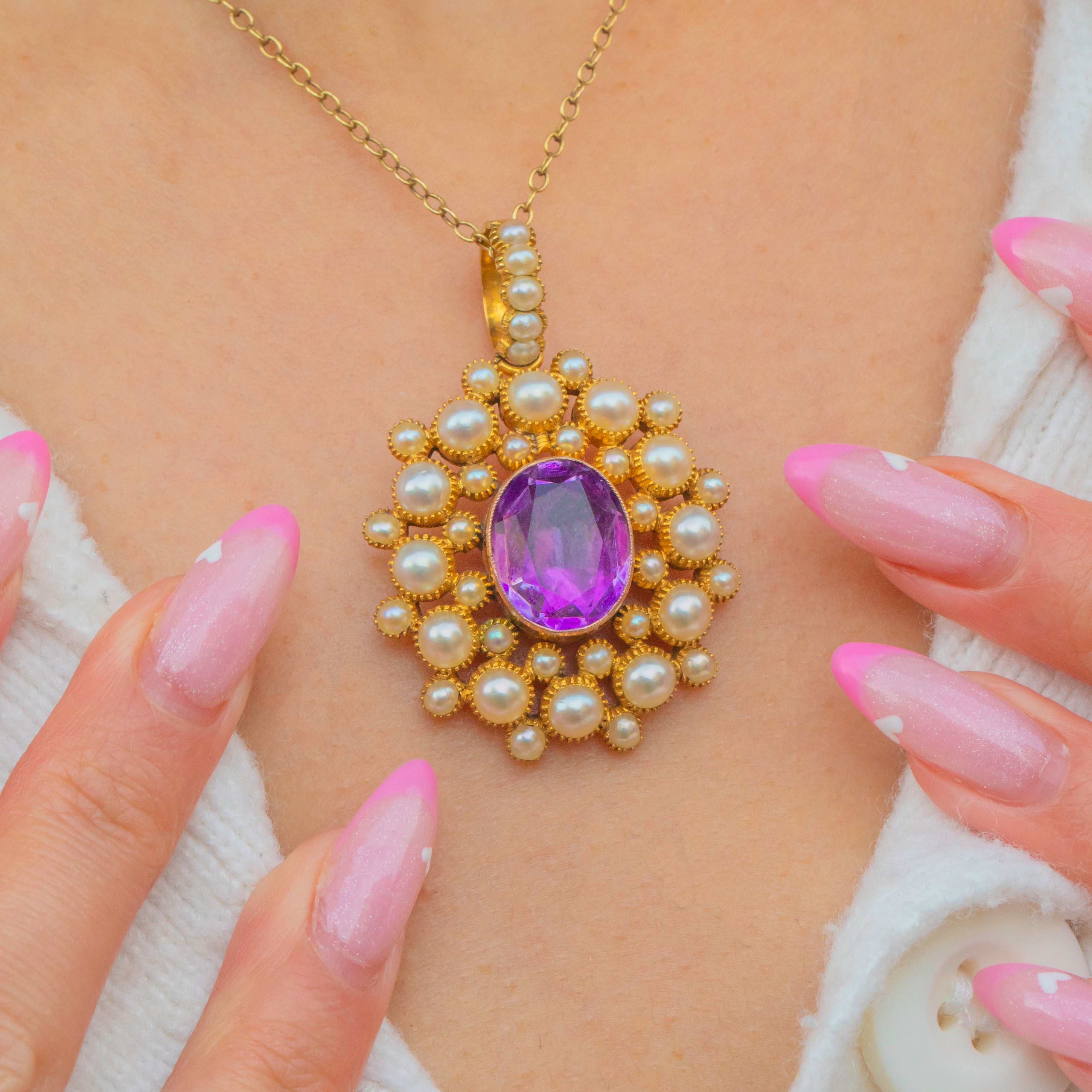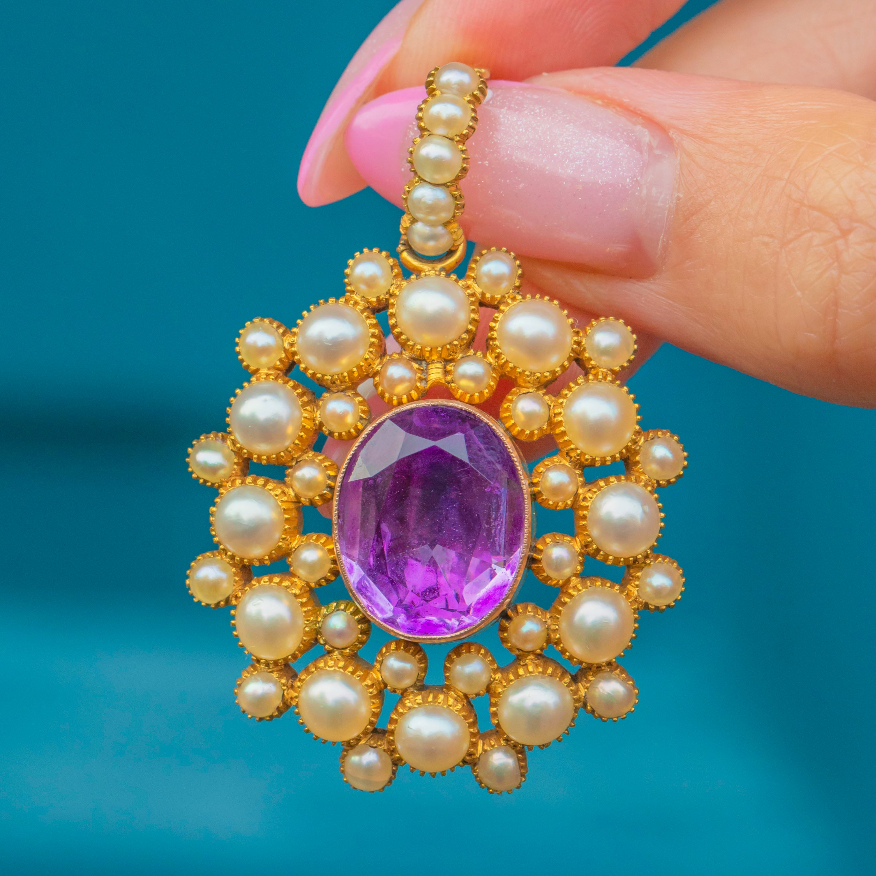 EXCELLENT. This Georgian 18ct Gold Pink Amethyst Pearl cluster pendant is offered in excellent condition. The Amethyst is free from chips or scuffs and is securely held within its 9ct Gold setting. The Pearls are creamy and smooth to the touch, each one has retained its natural nacre. The generous Pearl encrusted bale is robust allowing you to proudly display this phenomenal Georgian pendant from a chain of your choice!