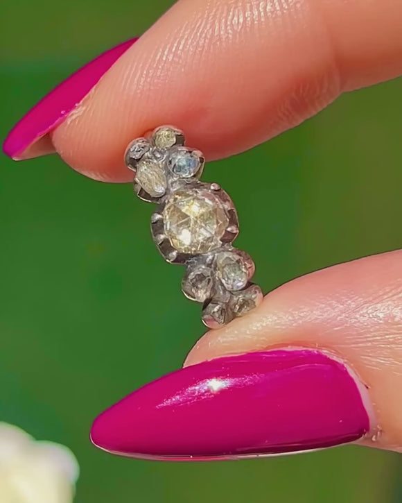 This 18ct Gold half hoop ring is home to 0.65cts of glistening rose-cut Diamonds displayed in typical tight Silver piecrust settings, and has a subtle floral feel to the arrangement of the Diamonds, which we just love! Sparkly and vivacious, this antique early 19th Century rose-cut Diamond ring is a one-of-a-kind beauty.