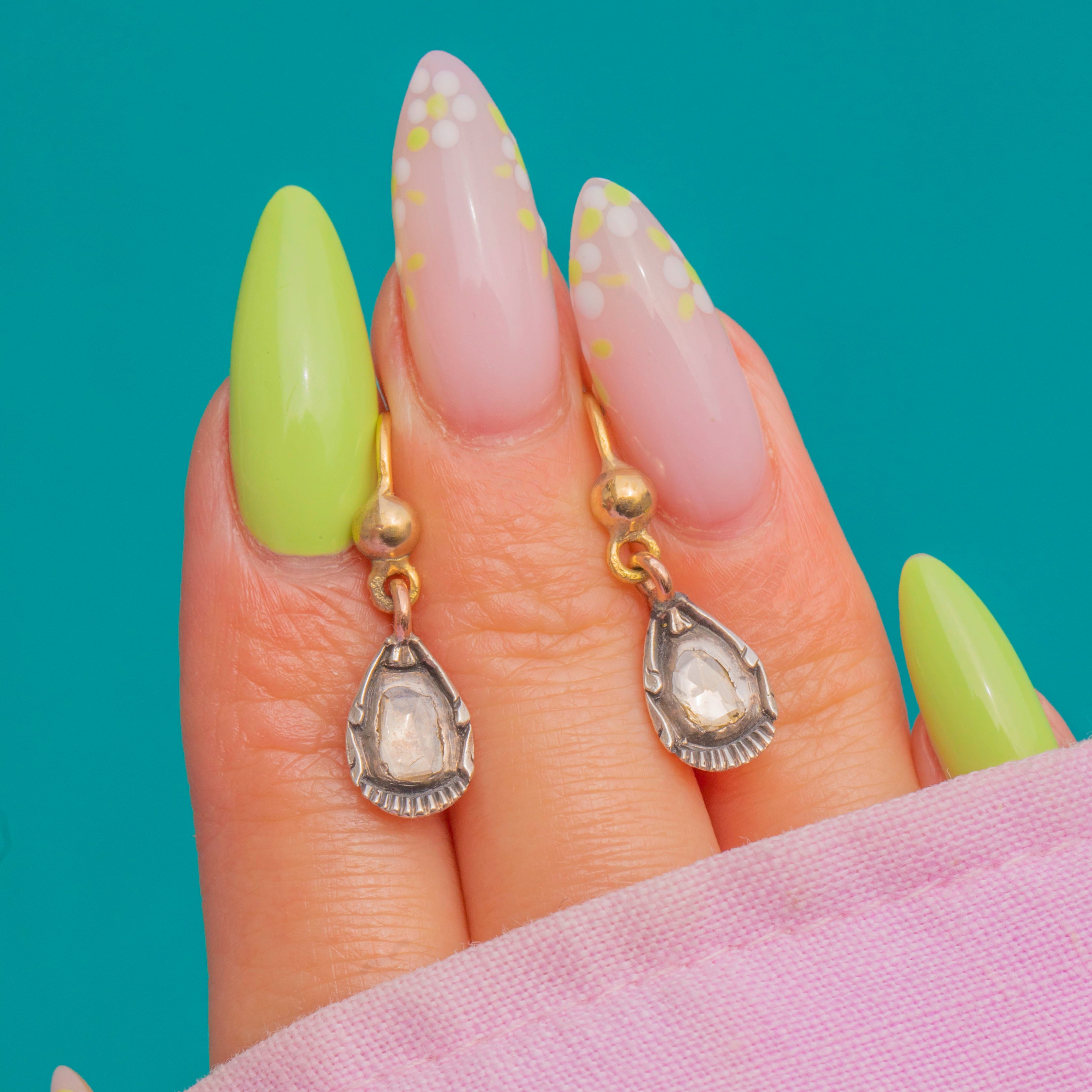 EXCELLENT: The rose-cut Diamonds are bright with crisp antique facets and only the lightest age-consistent wear under magnification. Silver settings are well-preserved with a rich, even patina and minimal surface marks; the later 18ct Gold hooks are secure and neatly finished. Overall beautifully cared for, with no notable issues to report.