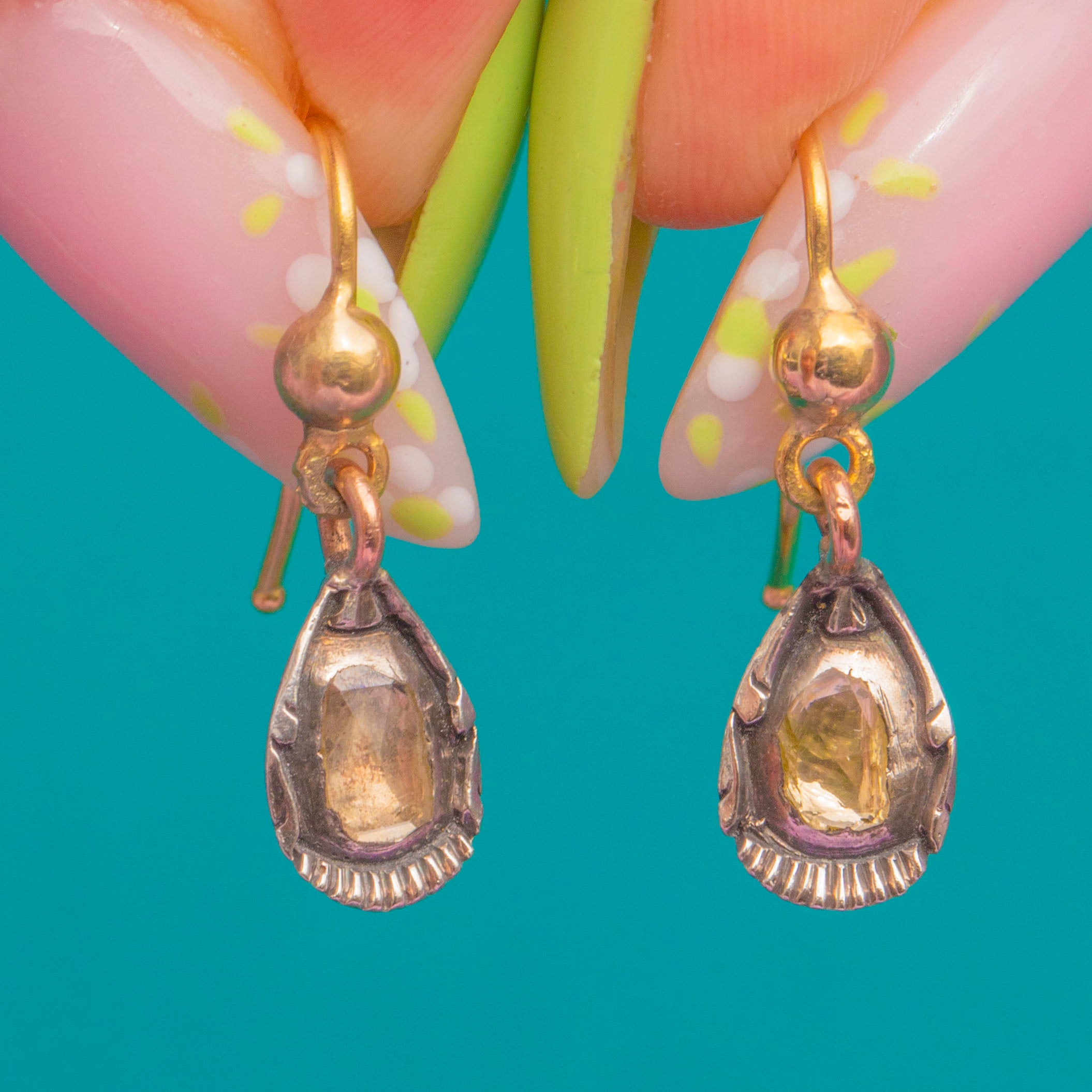 The drops are articulated for gentle movement and are topped with later 18ct Gold beaded shepherd hooks, a refined upgrade that complements the original Silver beautifully. With approximately 0.80cts of Diamonds combined, they offer that unmistakable Georgian sparkle—romantic, nuanced and endlessly elegant.
