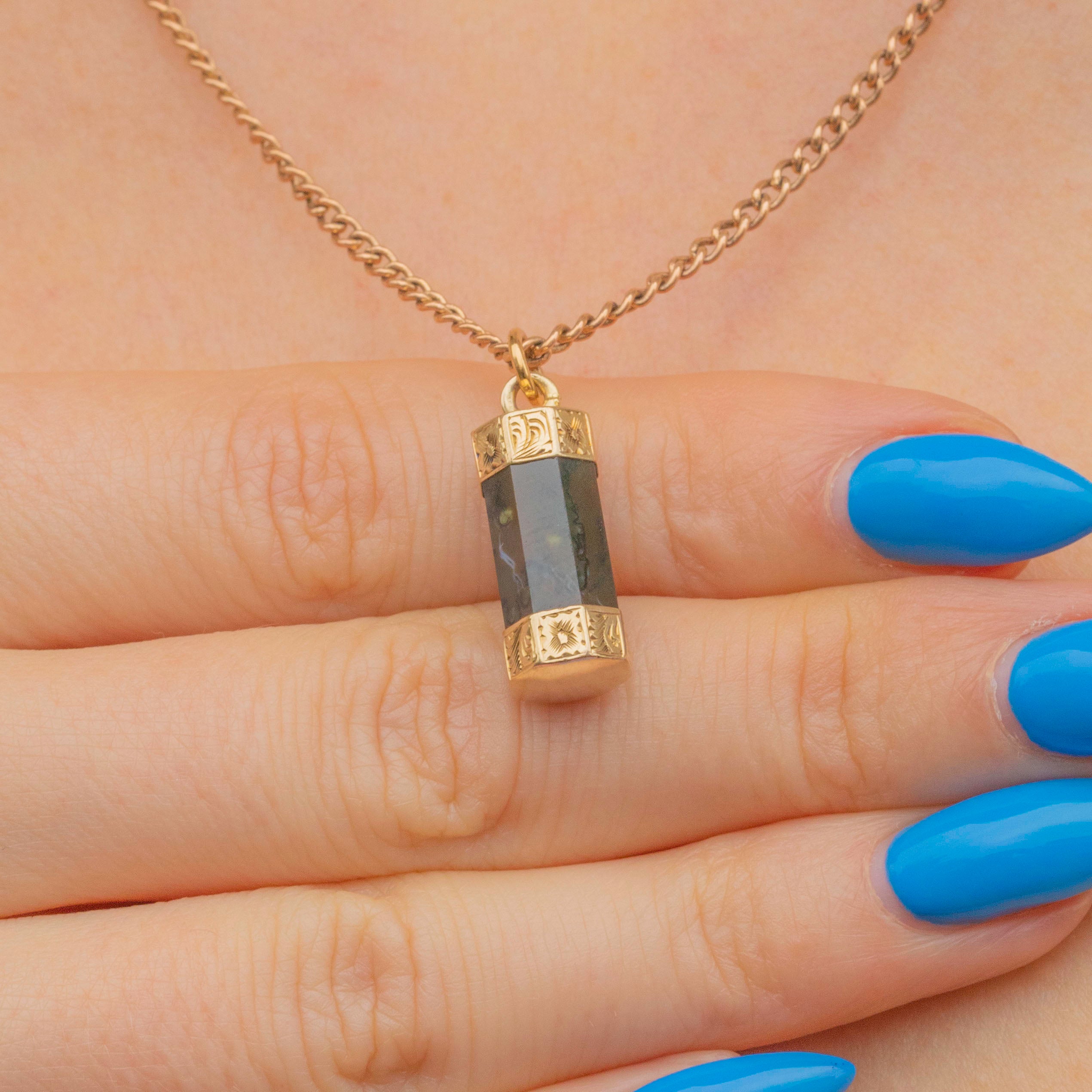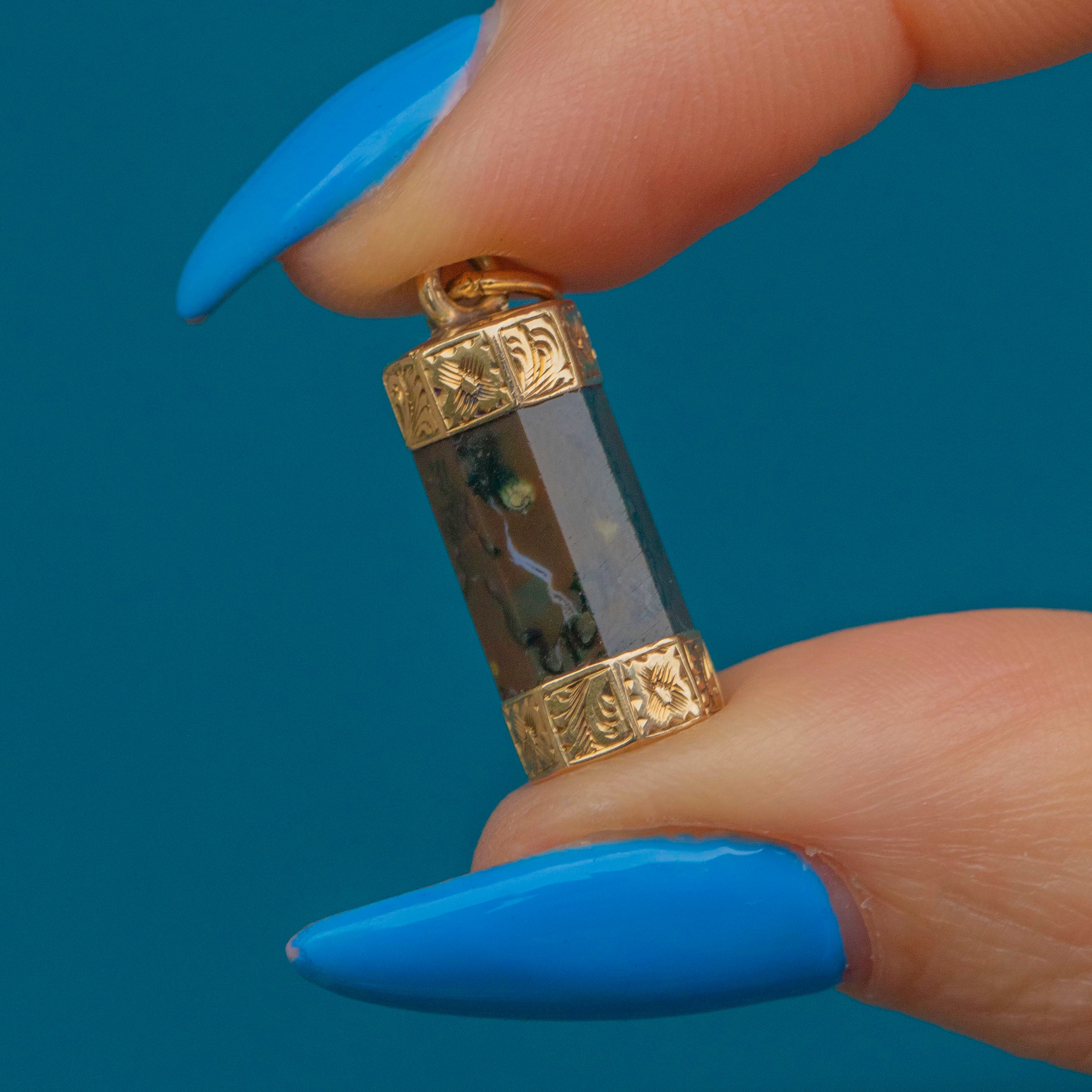 EXCELLENT. This Georgian 9ct Gold Agate Column pendant is in excellent condition. Her Agate is crisply cut into her octagon shape, free from chips or scratches - which is remarkable when considering she is over 200 years old! Her 9ct Gold engraved panels are crisp with no visible wear. All in all, she's a gothic dream and your new favourite pendant!