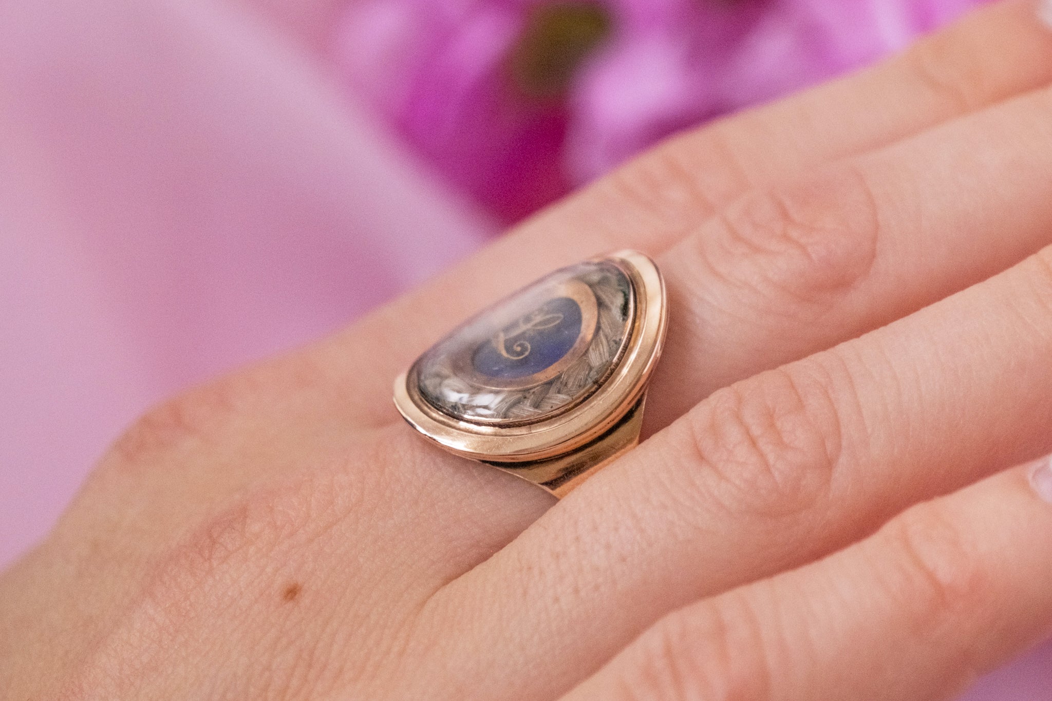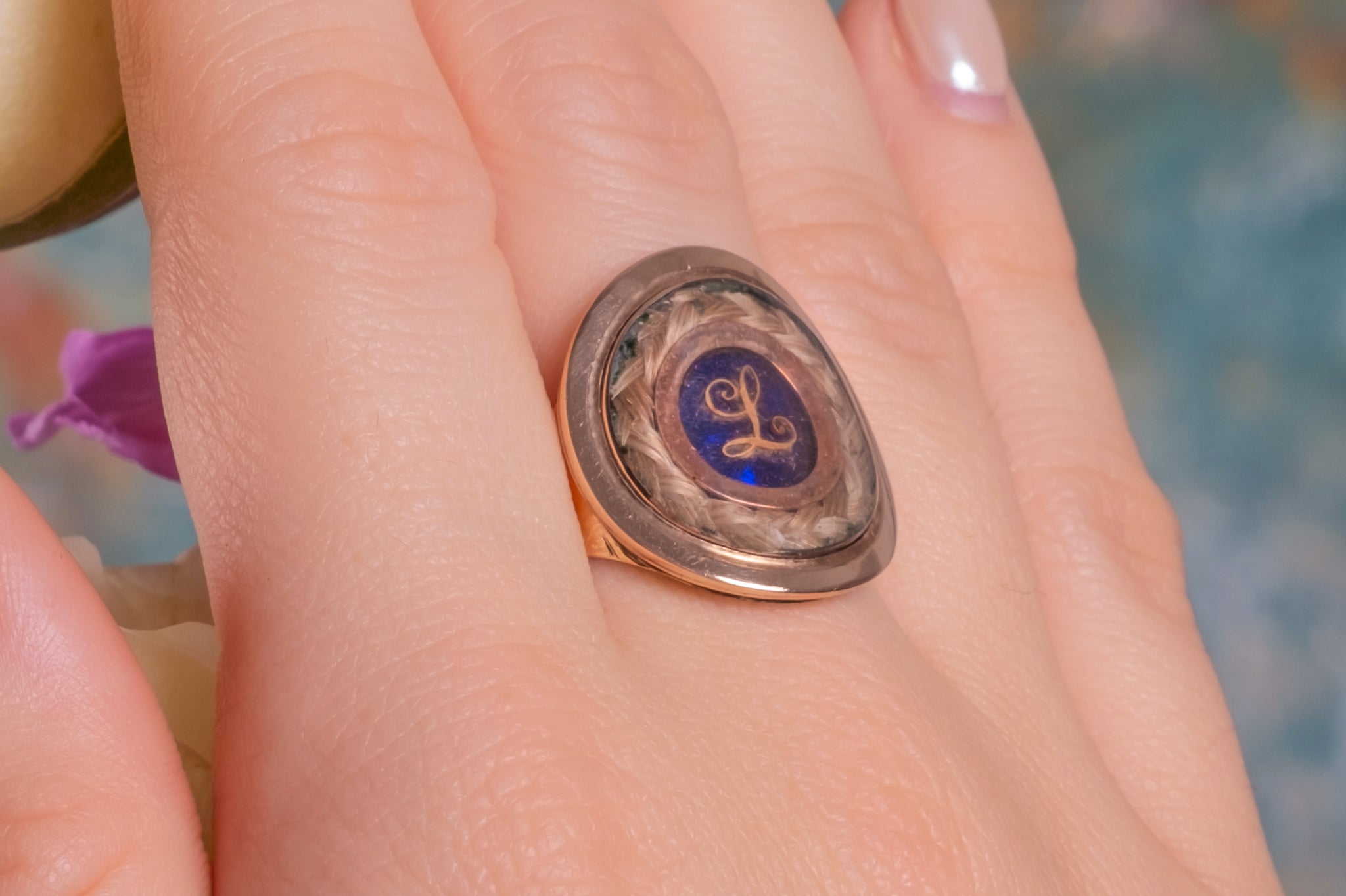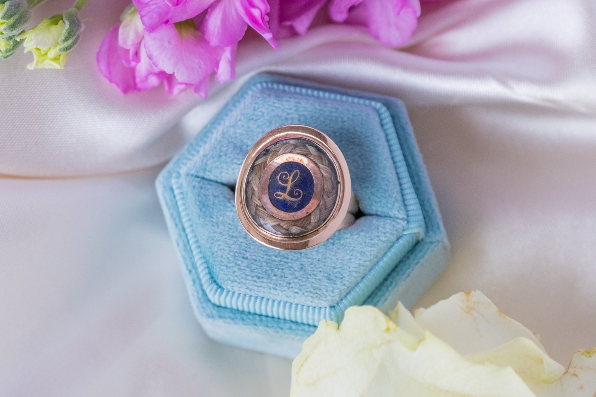 EXCELLENT: This Georgian 9ct Gold Blue Enamel mourning ring is in incredible condition. Chunky glossy and smooth, her large ring face and smooth band provide excellent coverage. The text engraved inside the ring face is in gorgeous crips condition, clear to read to the naked eye. The vivid Blue Enamel and braided hair have both been well preserved. We are in awe of the condition of this piece which is over 200 years old - it's clear she was a prized possession and wonderfully taken care of over the many years. Ready to start her new journey, you'll be able to cherish this antique Gold ring for a lifetime to come.