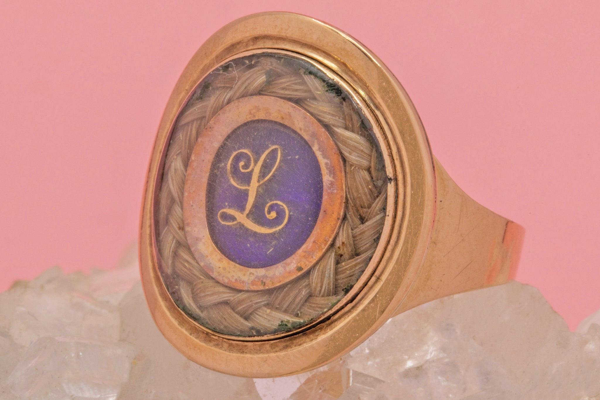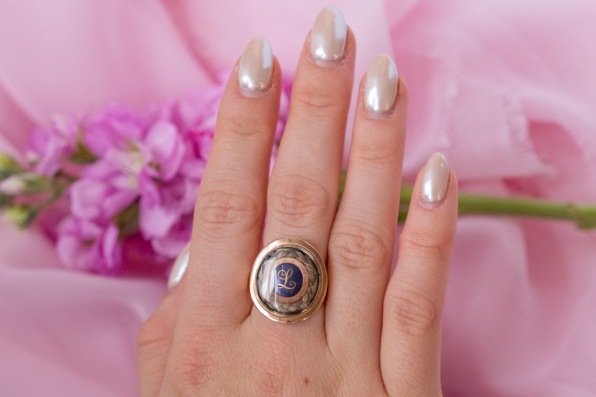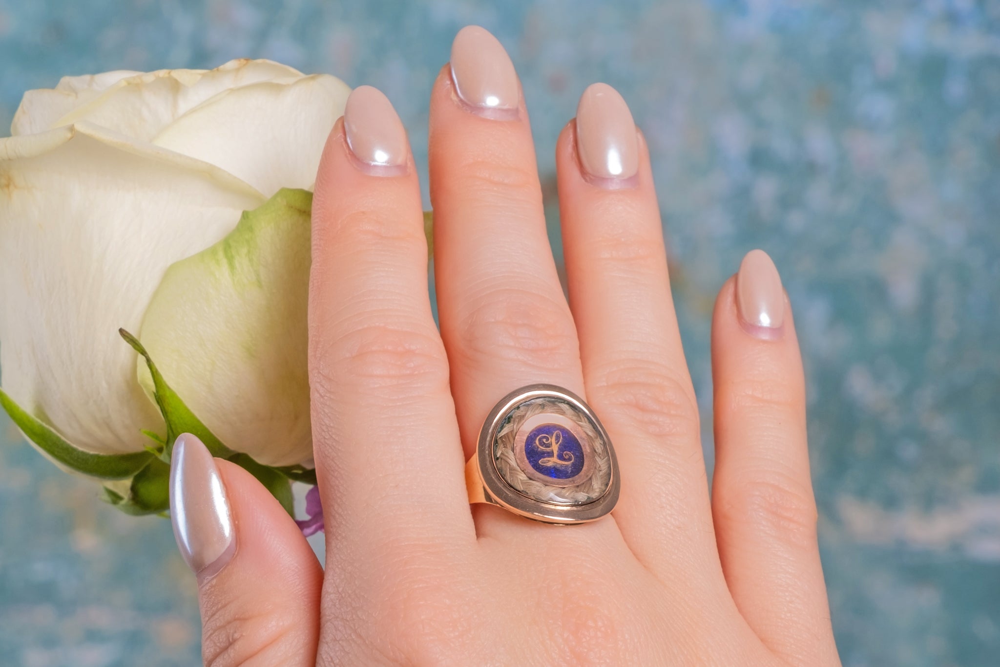 EXCELLENT: This Georgian 9ct Gold Blue Enamel mourning ring is in incredible condition. Chunky glossy and smooth, her large ring face and smooth band provide excellent coverage. The text engraved inside the ring face is in gorgeous crips condition, clear to read to the naked eye. The vivid Blue Enamel and braided hair have both been well preserved. We are in awe of the condition of this piece which is over 200 years old - it's clear she was a prized possession and wonderfully taken care of over the many years. Ready to start her new journey, you'll be able to cherish this antique Gold ring for a lifetime to come.