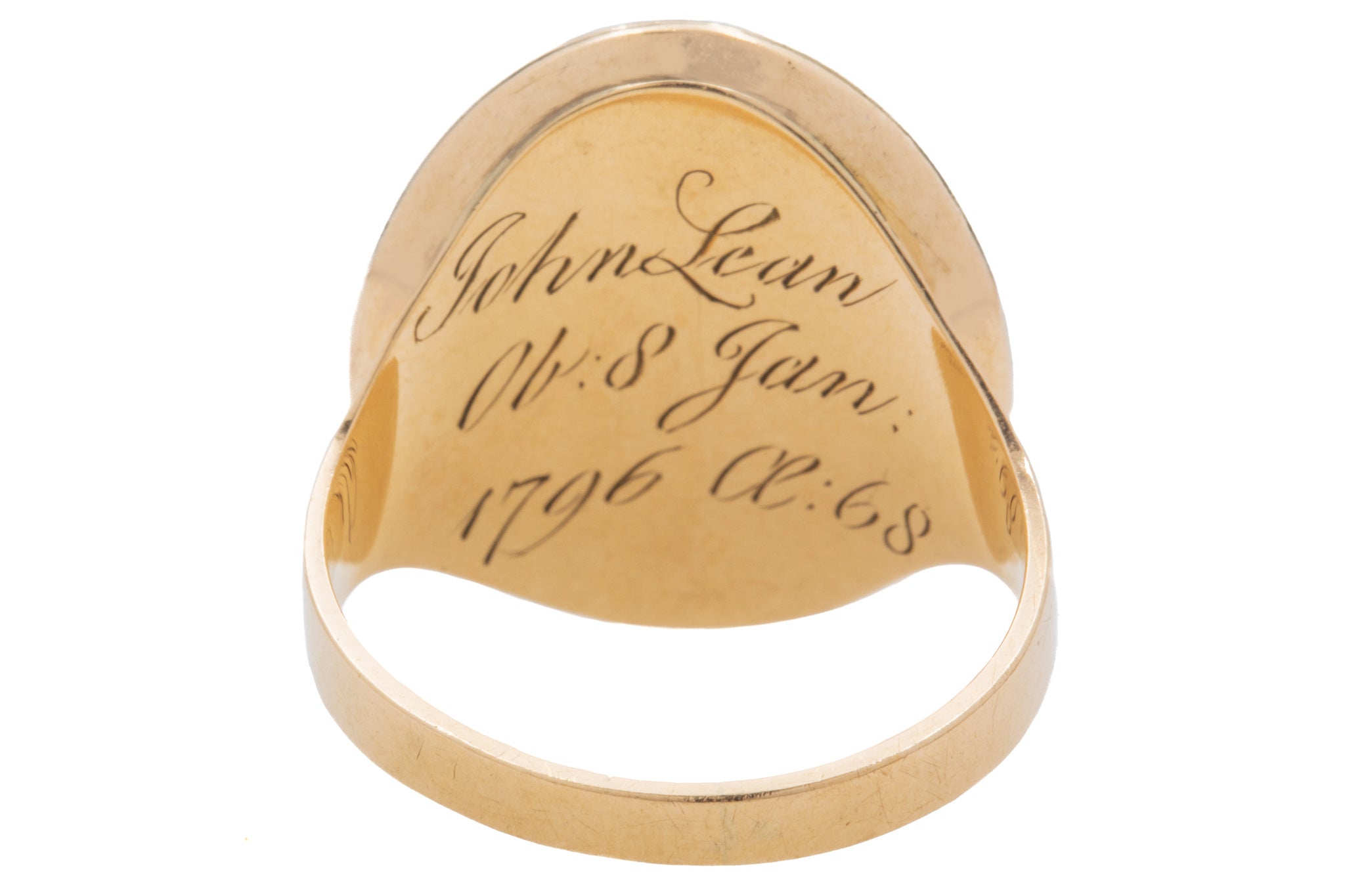 STAMPS & HALLMARKS: "John Lean, Ob: 8 Jan: 1796, AE 68" script on inside of ring face.